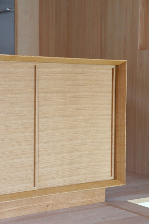 厚みのある楢の無垢材を使った家具ですが、四方枠の小口にテーパーをとることで軽く繊細な印象となるようにしています。