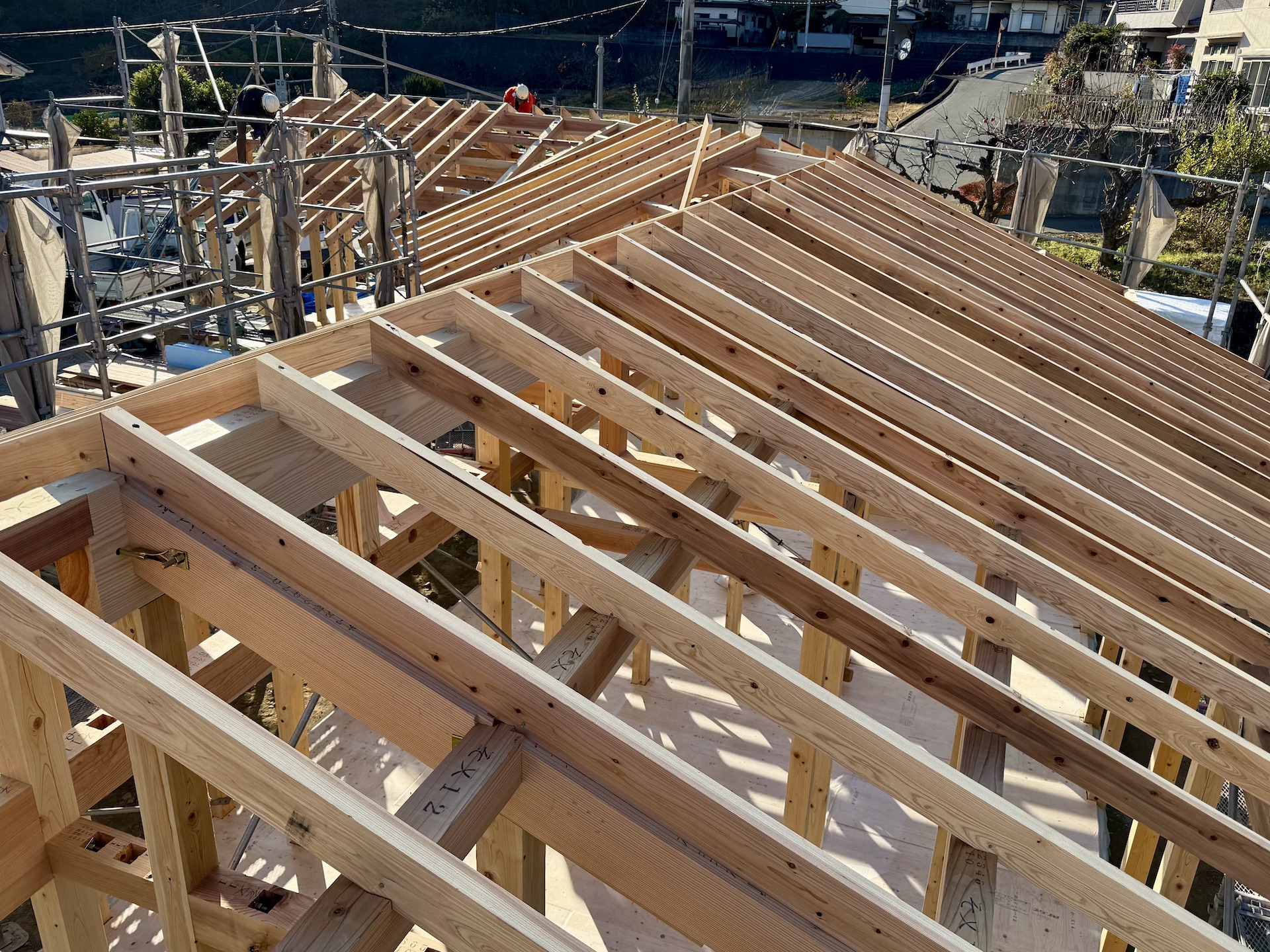 角度を振りながら連続する架構の先に自然と視線が誘導され‥