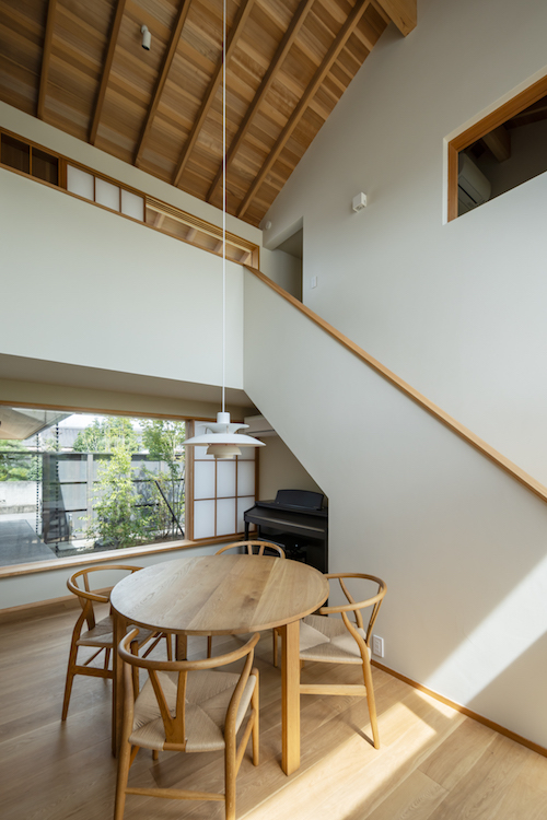 審査員の方からは「郊外ならではの広い敷地を活かすT字プラン。縦と横方向に視線が抜け、家族4人の伸びやかな暮らしを想像でき、体感的ともいえる設計の巧みさを感じました。また、南北に庭を配し、四季の自然の営みを住み手だけでなく、近隣へも届け、景観向上に寄与している点について、住宅地に家を建てることに対する責任を建築家と住み手が同じ目線で果たしていて、好感がもてました。」とご講評いただきました。