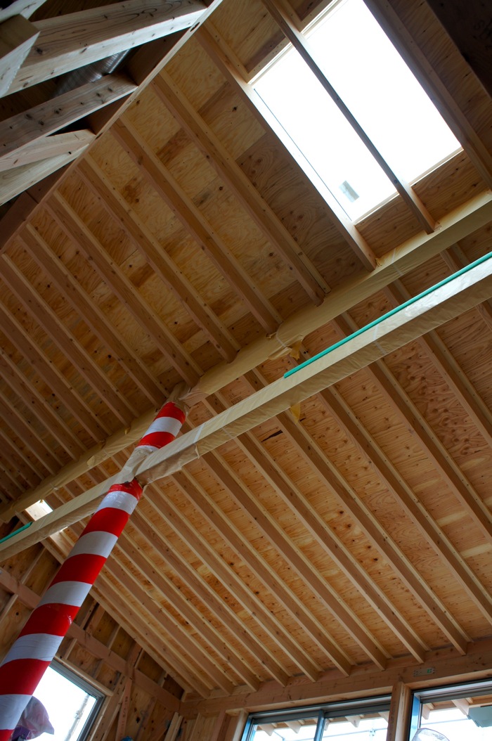 この家では、2階リビングの天井の垂木を見せる計画としているので、