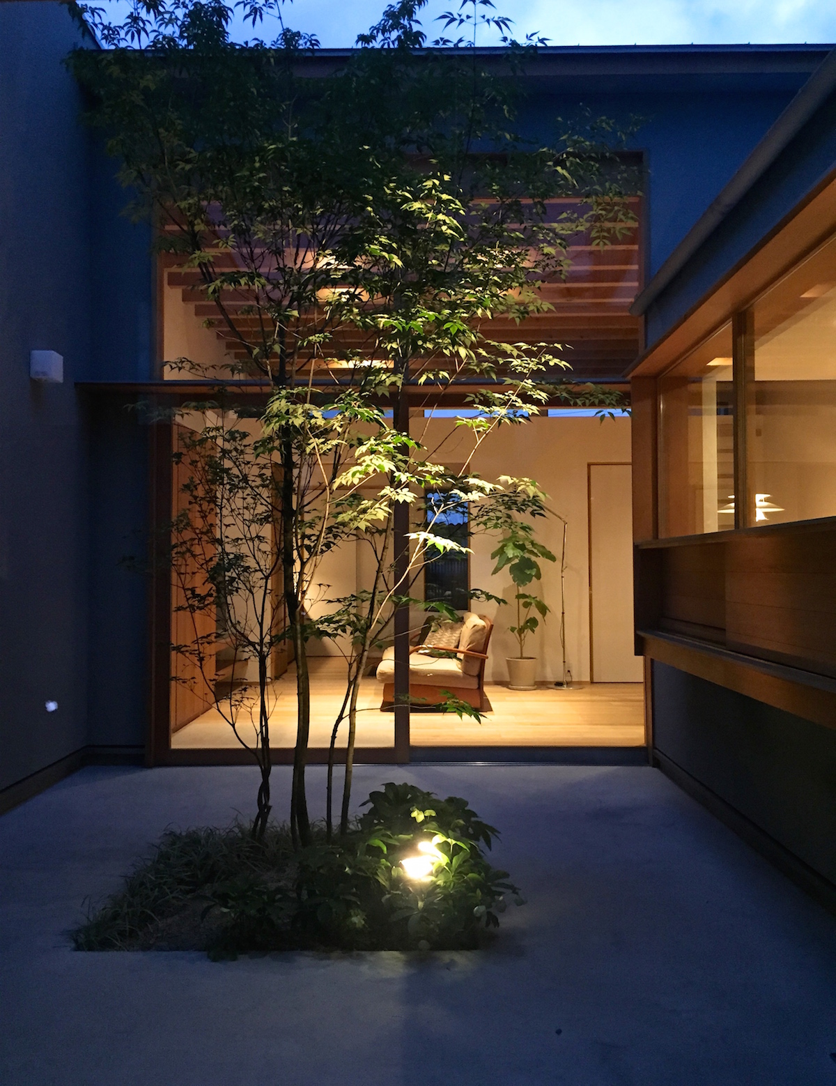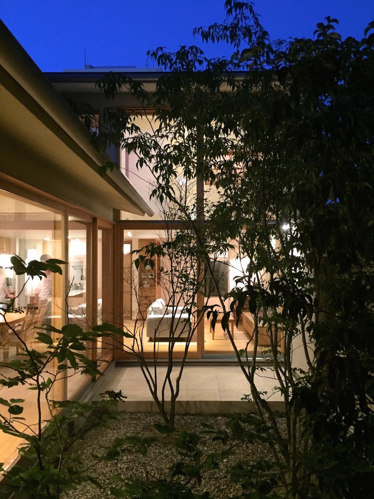 中庭型の2つの住まいは、内部の暮らしぶりが感じられる夕景のシーンがとても綺麗でした。