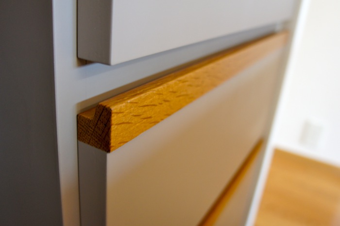 キッチンの引き出しの取っ手は、指を掛けたときにしっくりくるように端部を曲線に削ってもらいました。