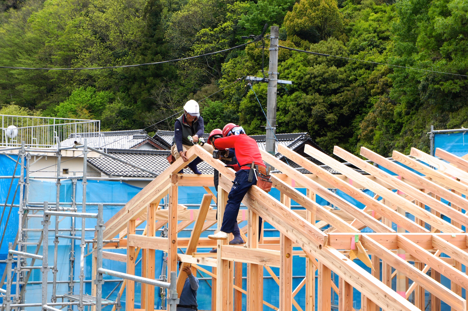 棟梁の指揮のもと、柱や梁がどんどん組みあがっていきます。