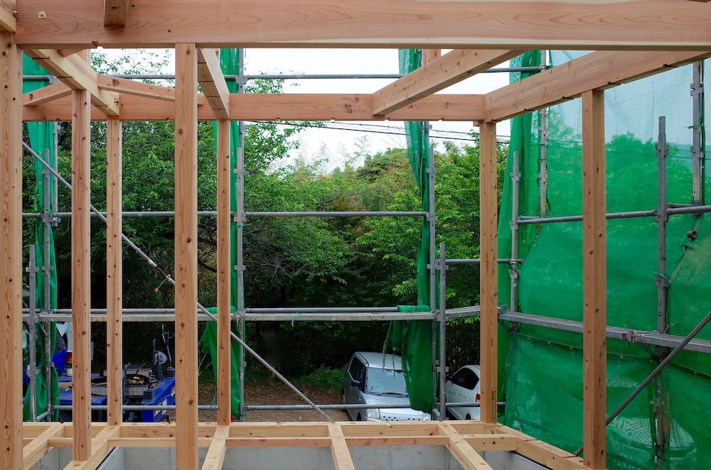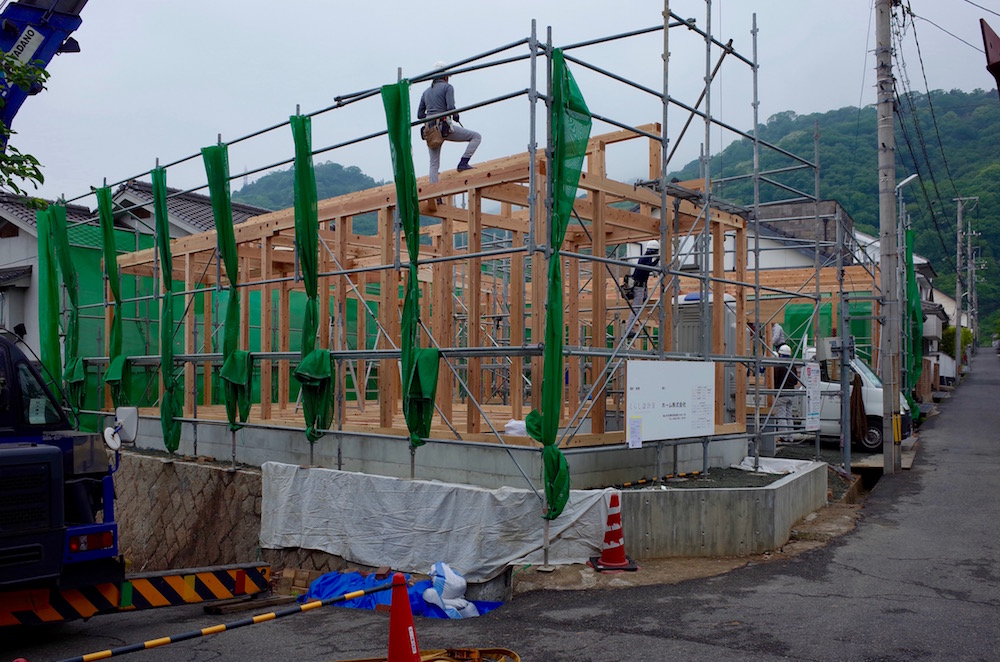 上棟の日、敷地から手が届きそうなほど近くに連なる桜の木が、新緑の葉を茂らせて気持ち良さそうでした‥