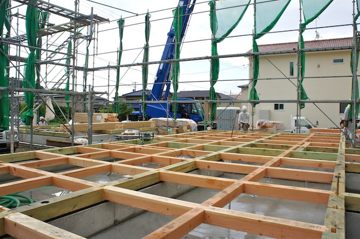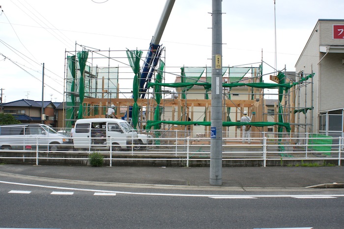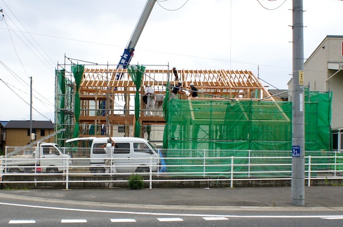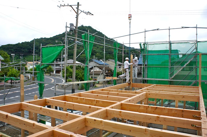 大工さんたちの機敏な動きと、クレーンでダイナミックに吊られていく柱梁、