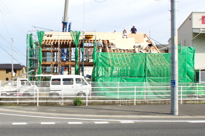 上棟の日は大工さん総出で、次つぎに建物の骨格が組み上がっていきます。
