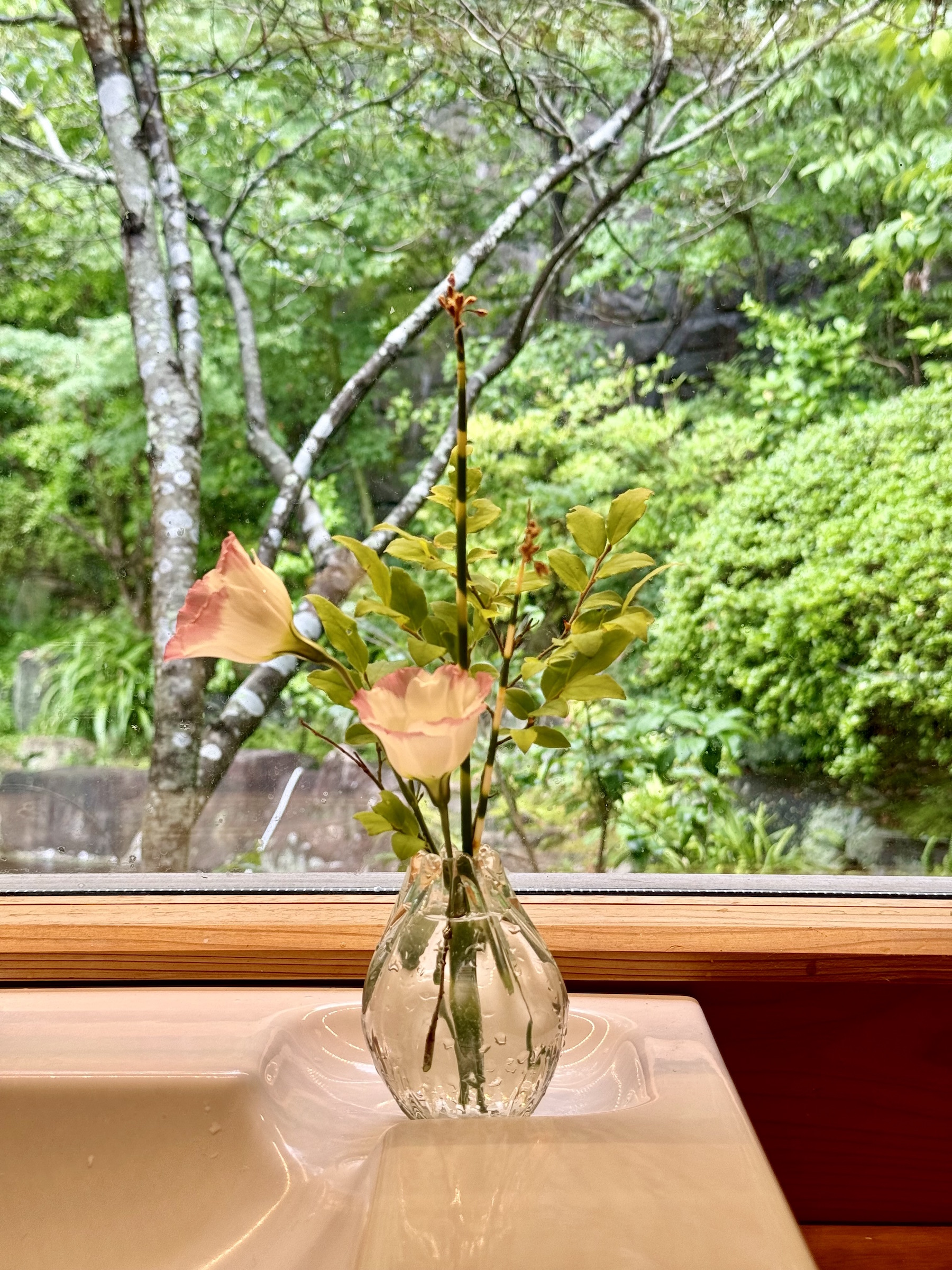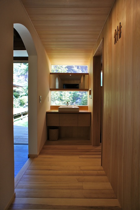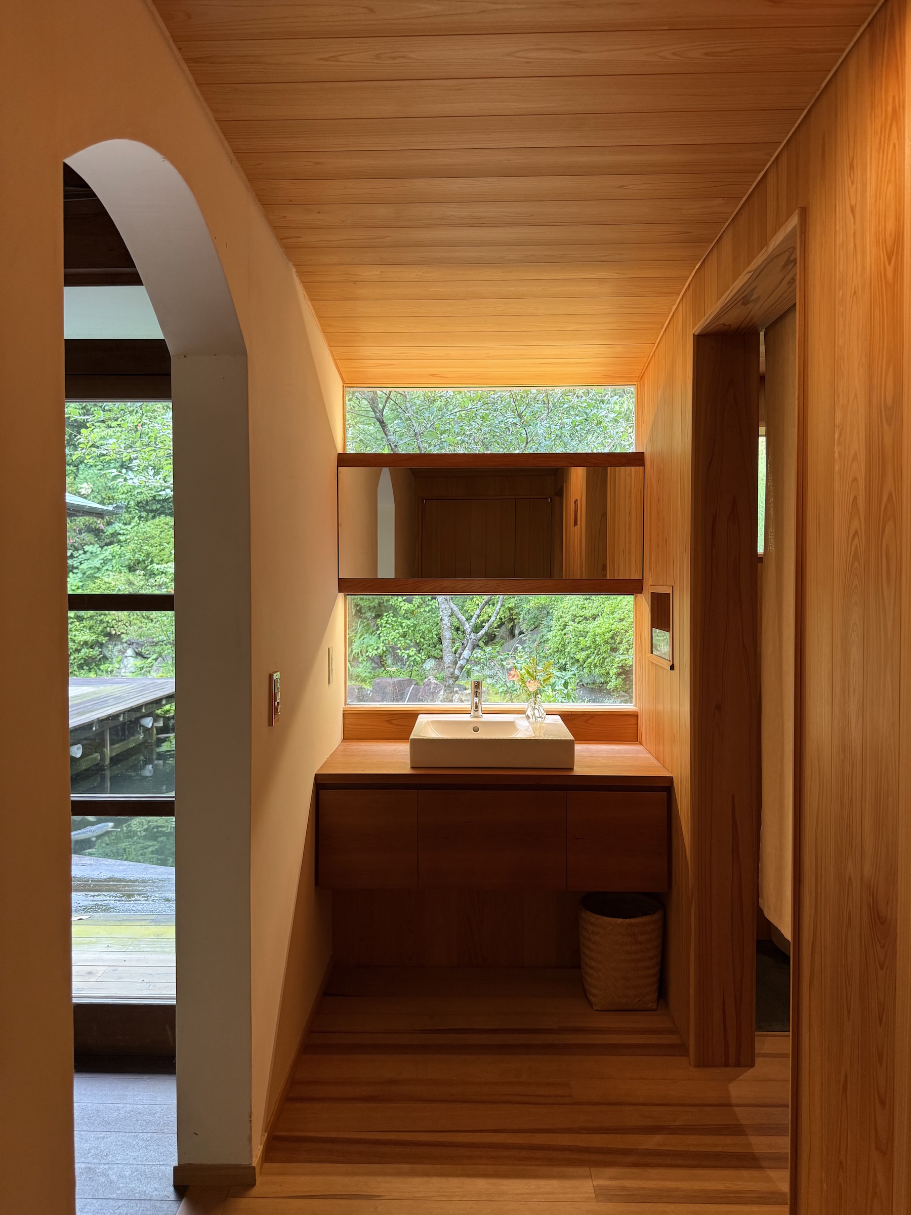 手洗所前室に設えたベンチに座り、鯉のゆくてをゆったりと眺める…