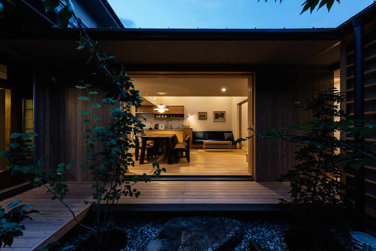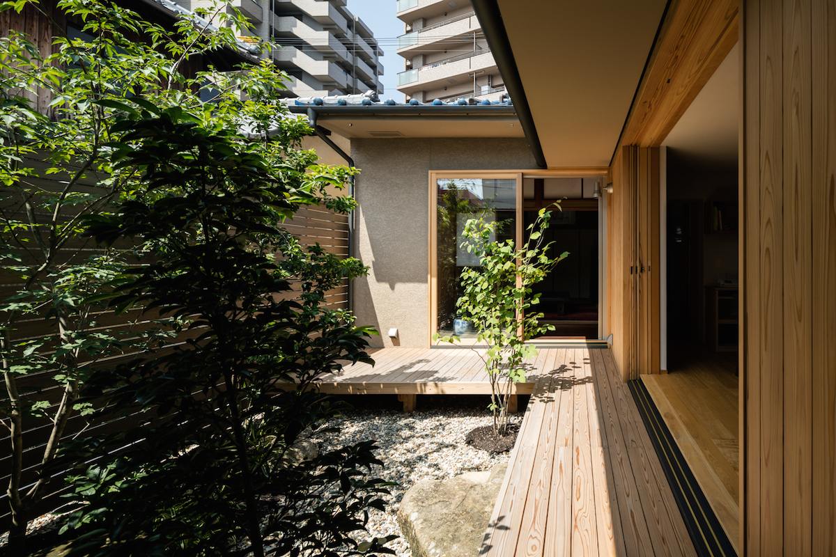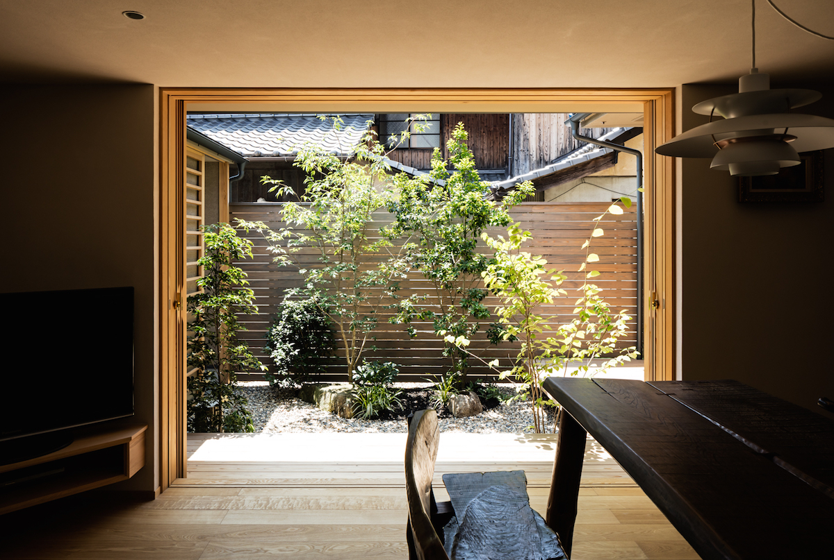 中庭側に低く構えた軒下に設けた木製サッシと