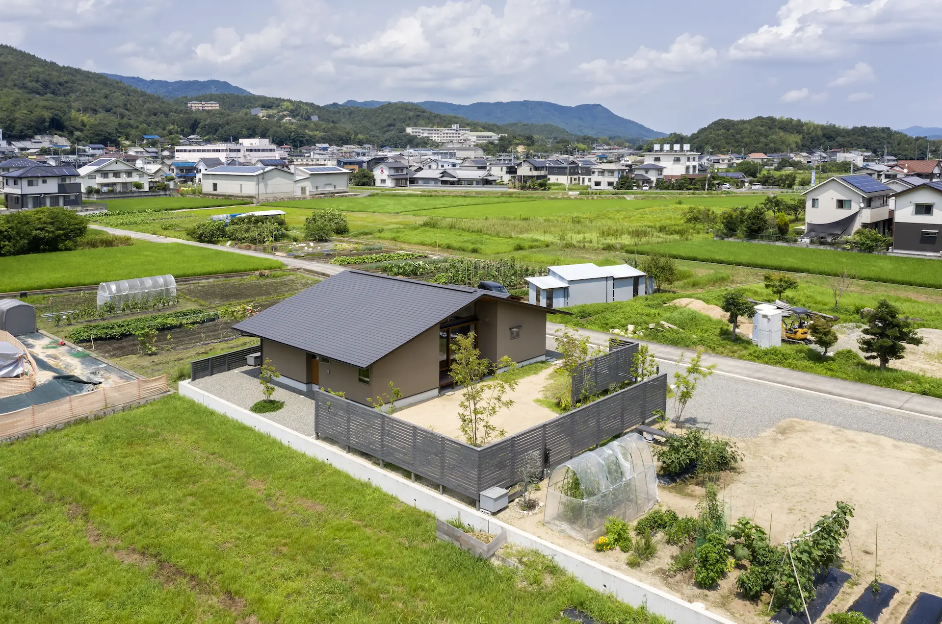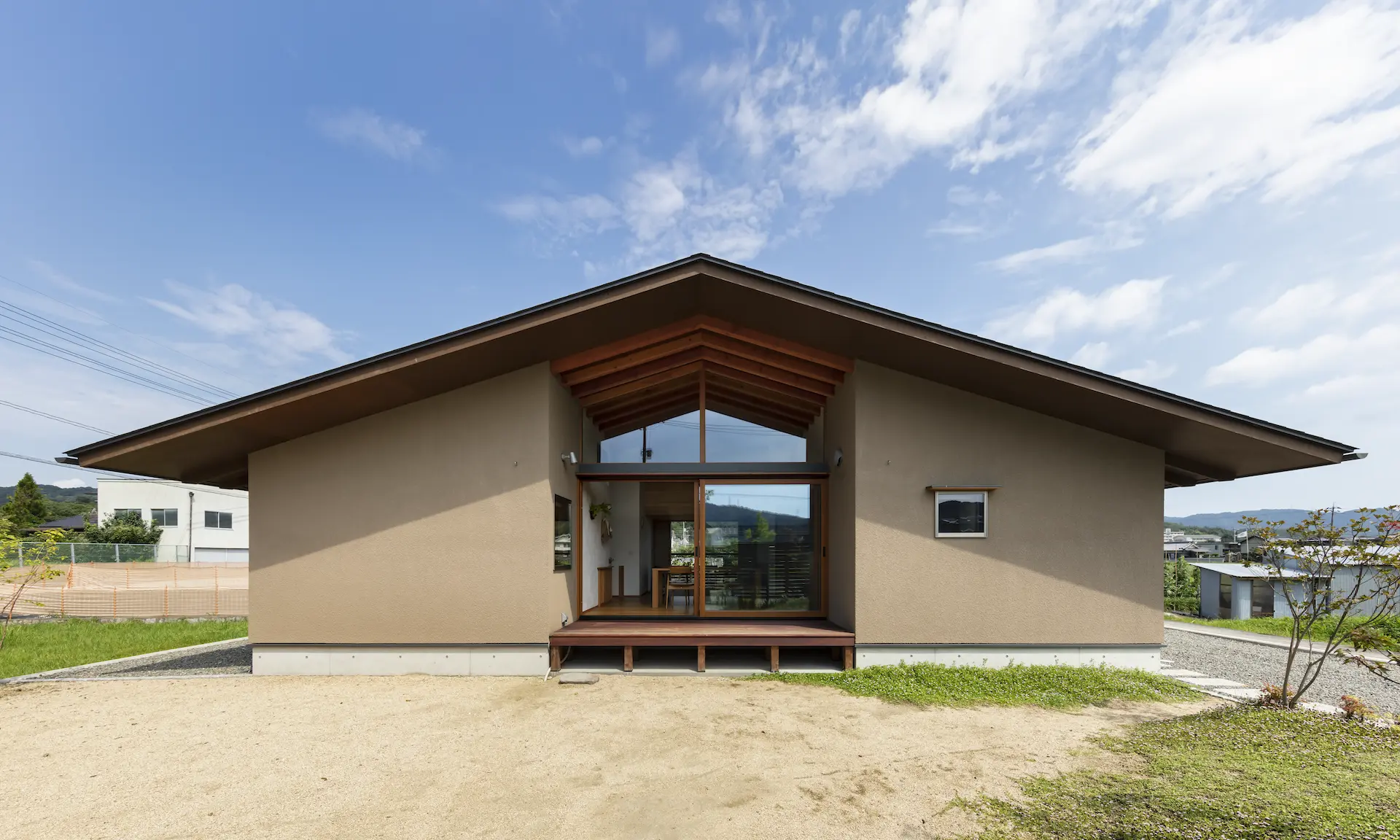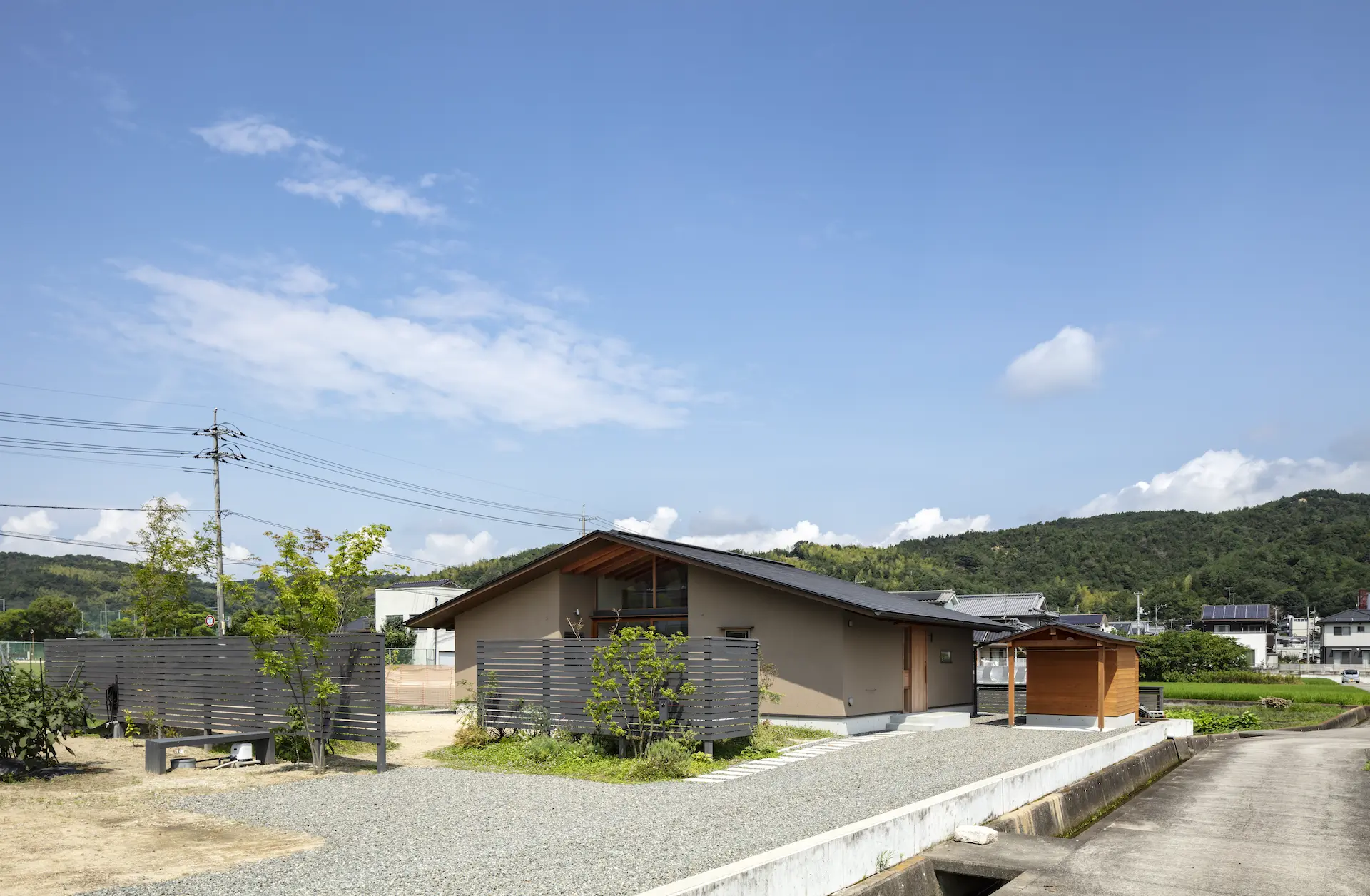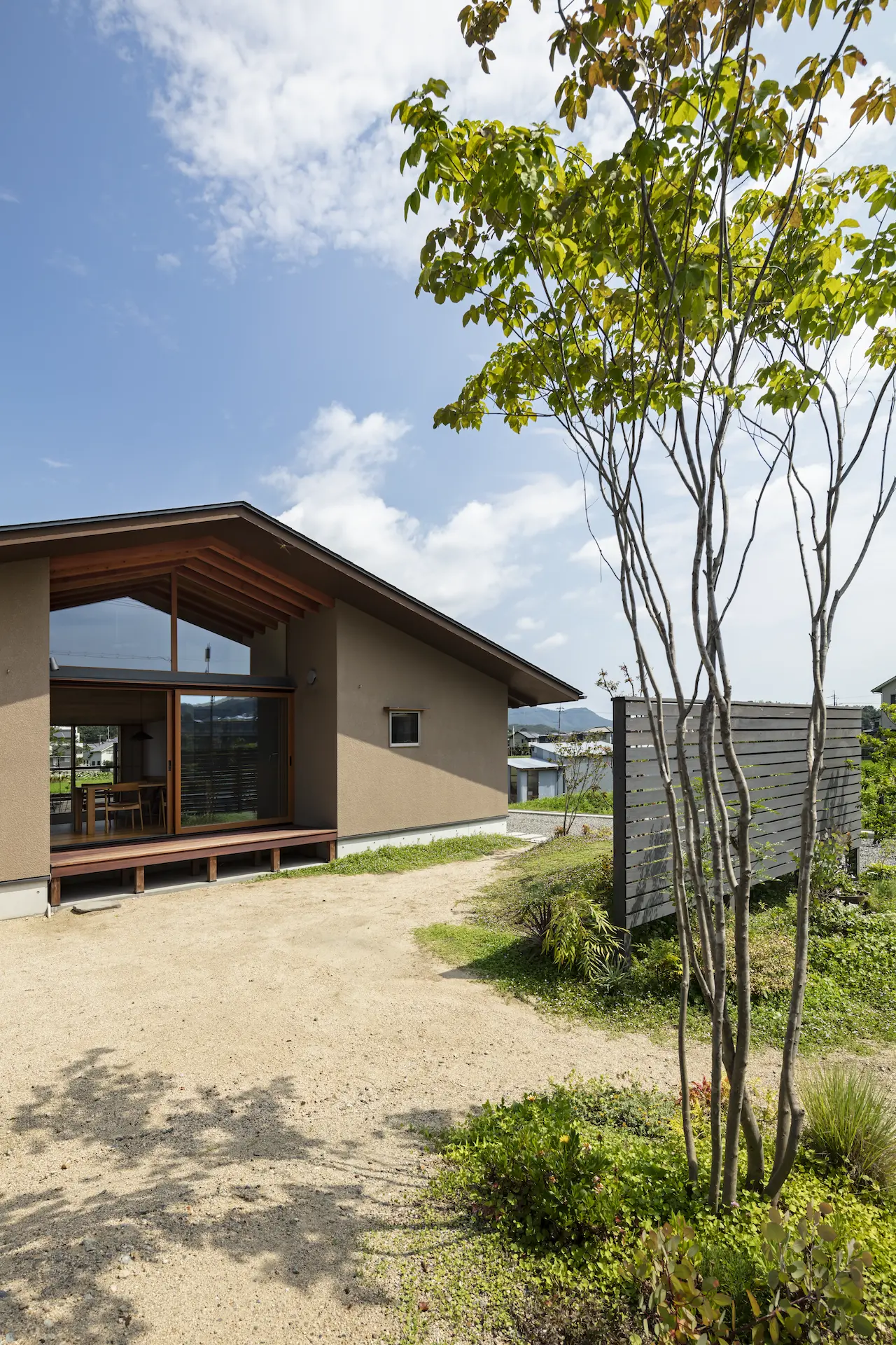 福山市の西部、周囲を田畑に包まれるような平屋建ての住まいです。敷地内の菜園で野菜を育て、外遊びに親しむご家族の暮らしは大地や空、木々や野の草花‥揺るぎない自然がすぐ傍に在りだからこそ屋根の下に集う、生命の確かさを実感します。床を堀り込んだ窓辺のソファに身を沈めると、大地に寝ころぶような安らぎを覚える‥暮らしから深い充足を得られることが、作り手のささやかな願いです。