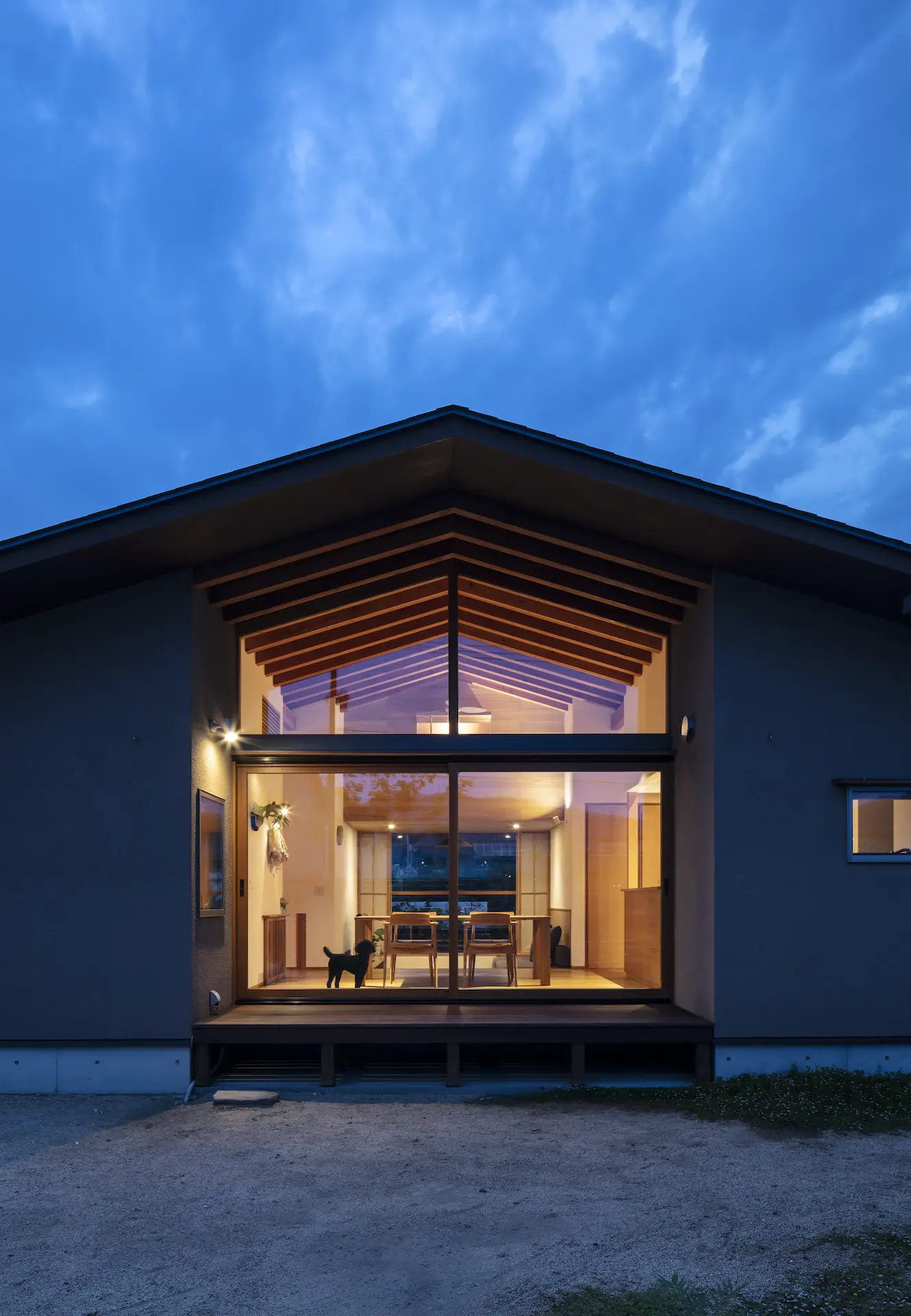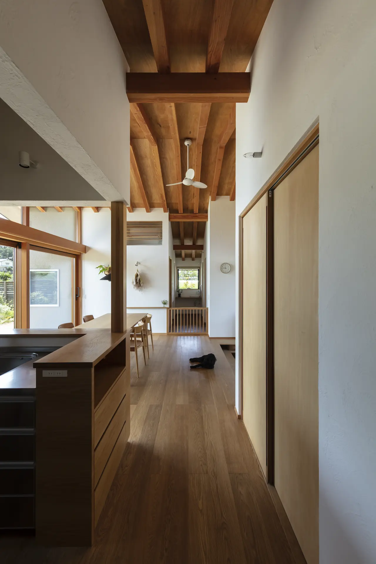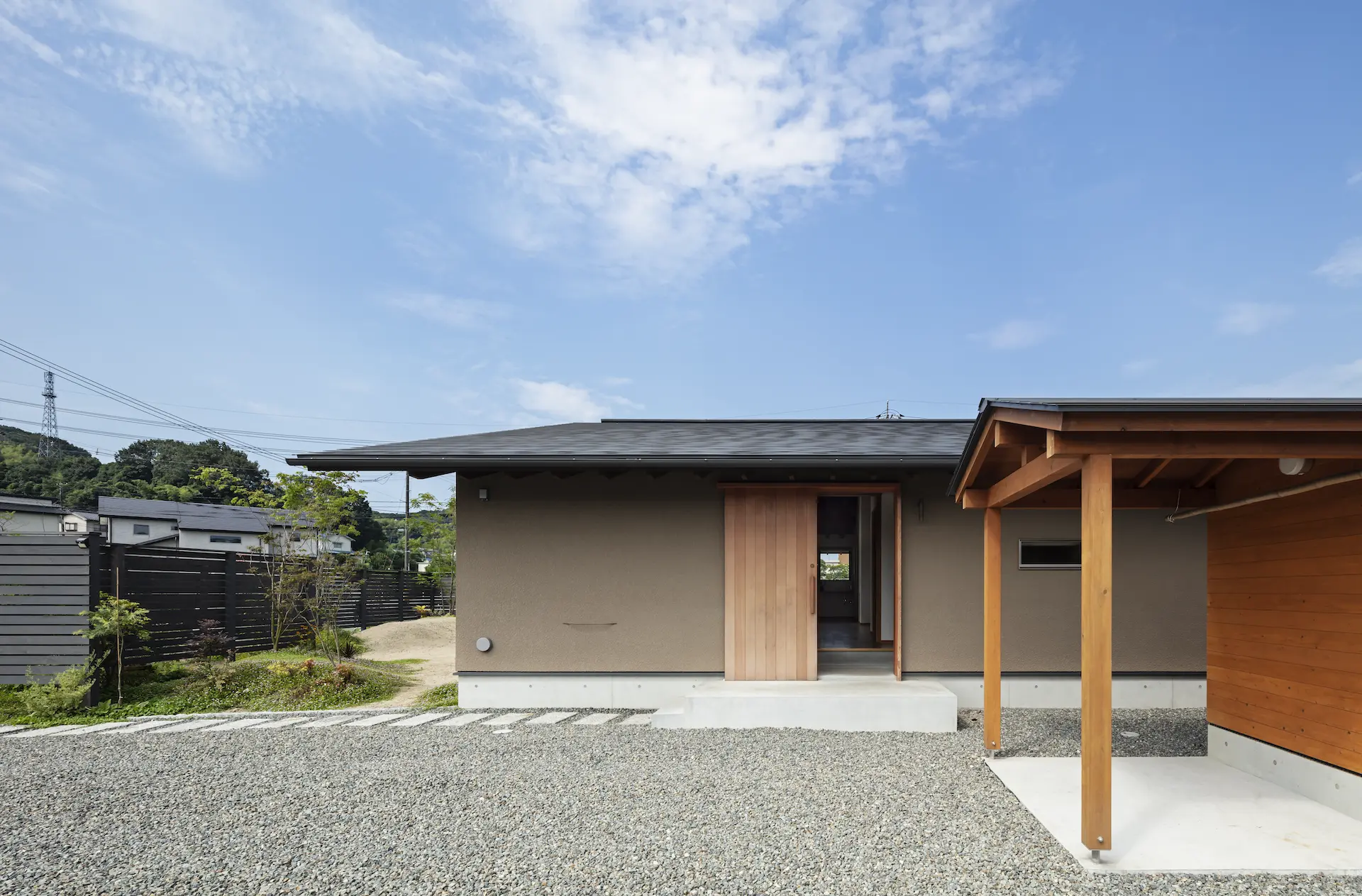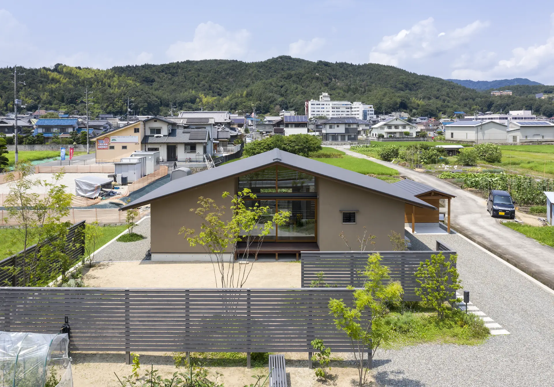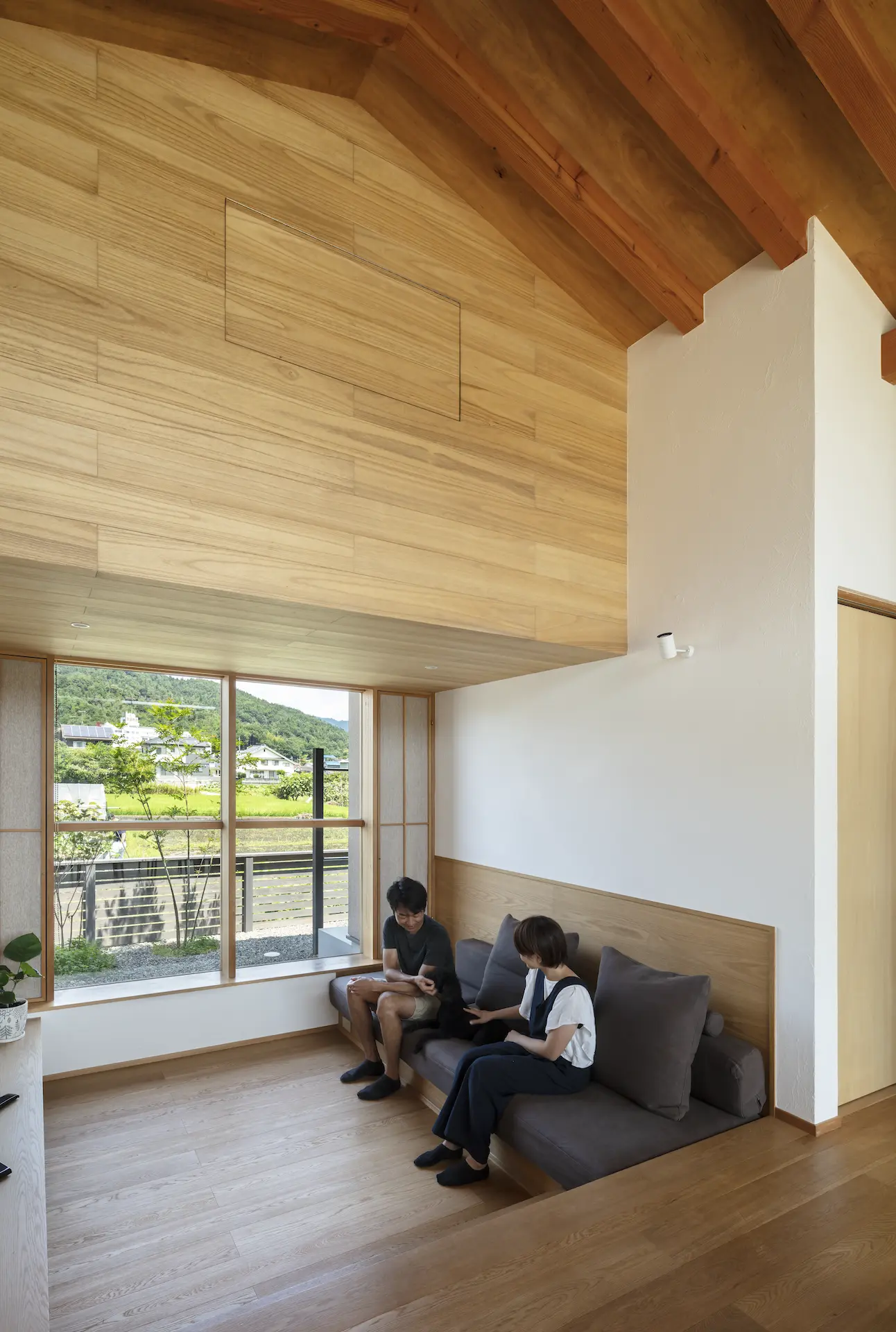 福山市の西部、周囲を田畑に包まれるような平屋建ての住まいです。敷地内の菜園で野菜を育て、外遊びに親しむご家族の暮らしは大地や空、木々や野の草花‥揺るぎない自然がすぐ傍に在りだからこそ屋根の下に集う、生命の確かさを実感します。床を堀り込んだ窓辺のソファに身を沈めると、大地に寝ころぶような安らぎを覚える‥暮らしから深い充足を得られることが、作り手のささやかな願いです。