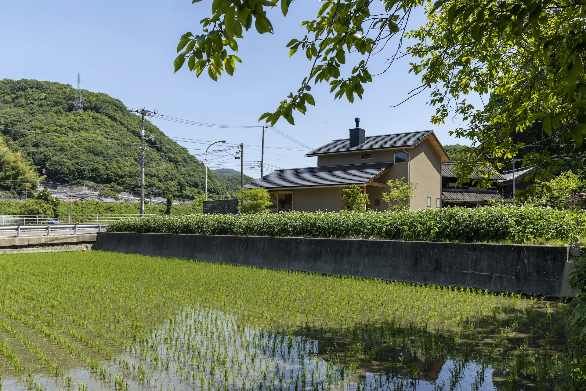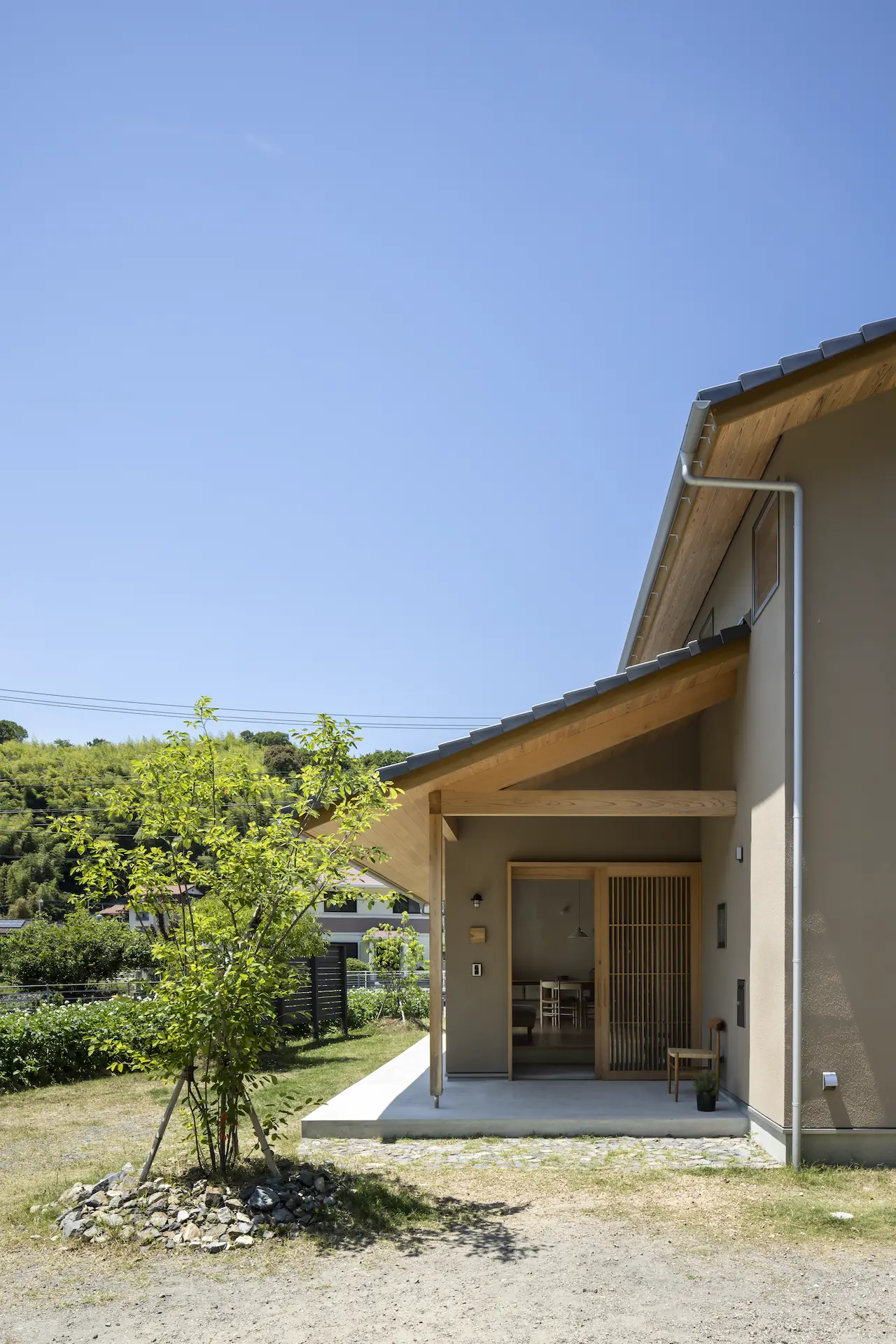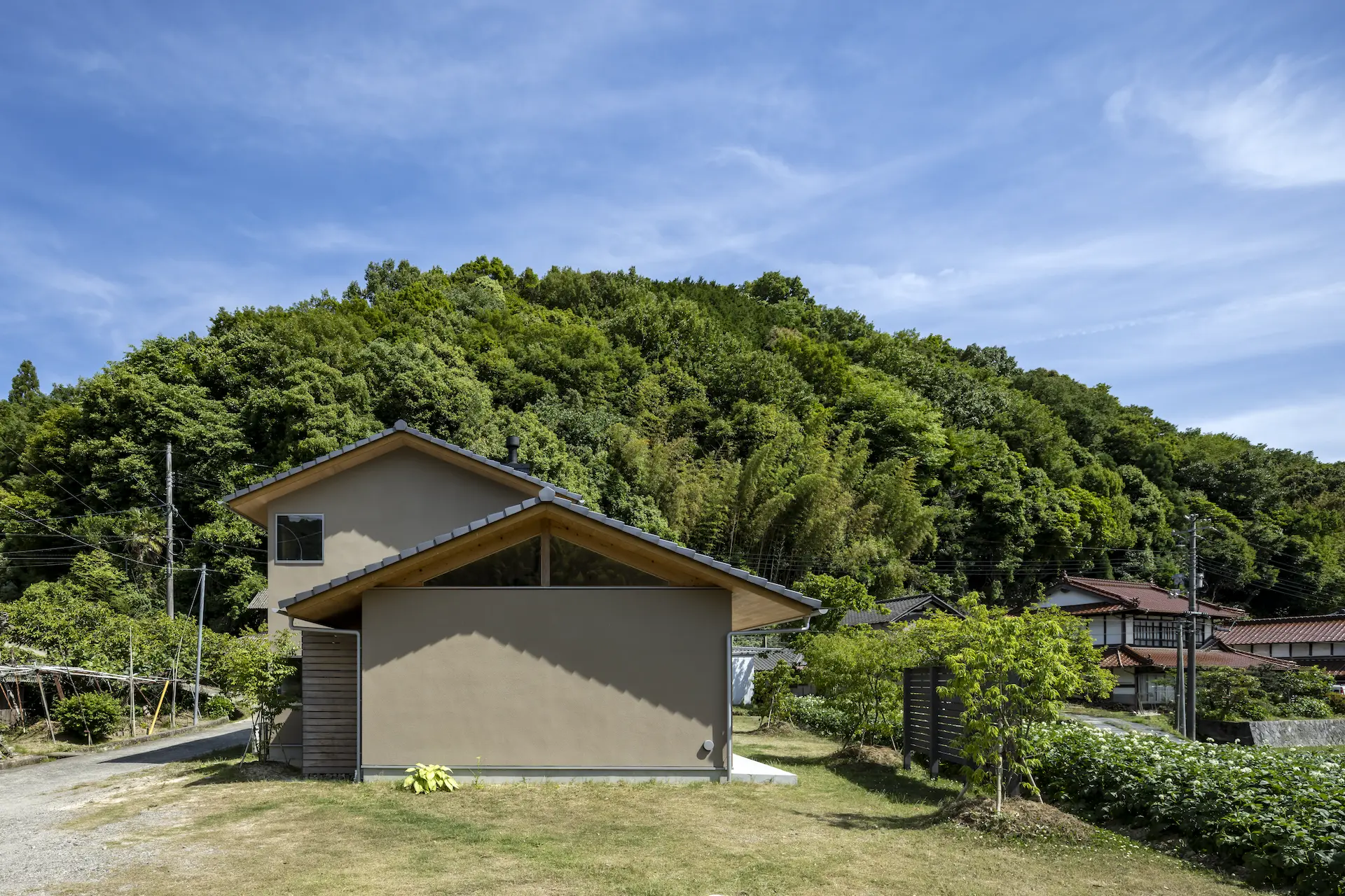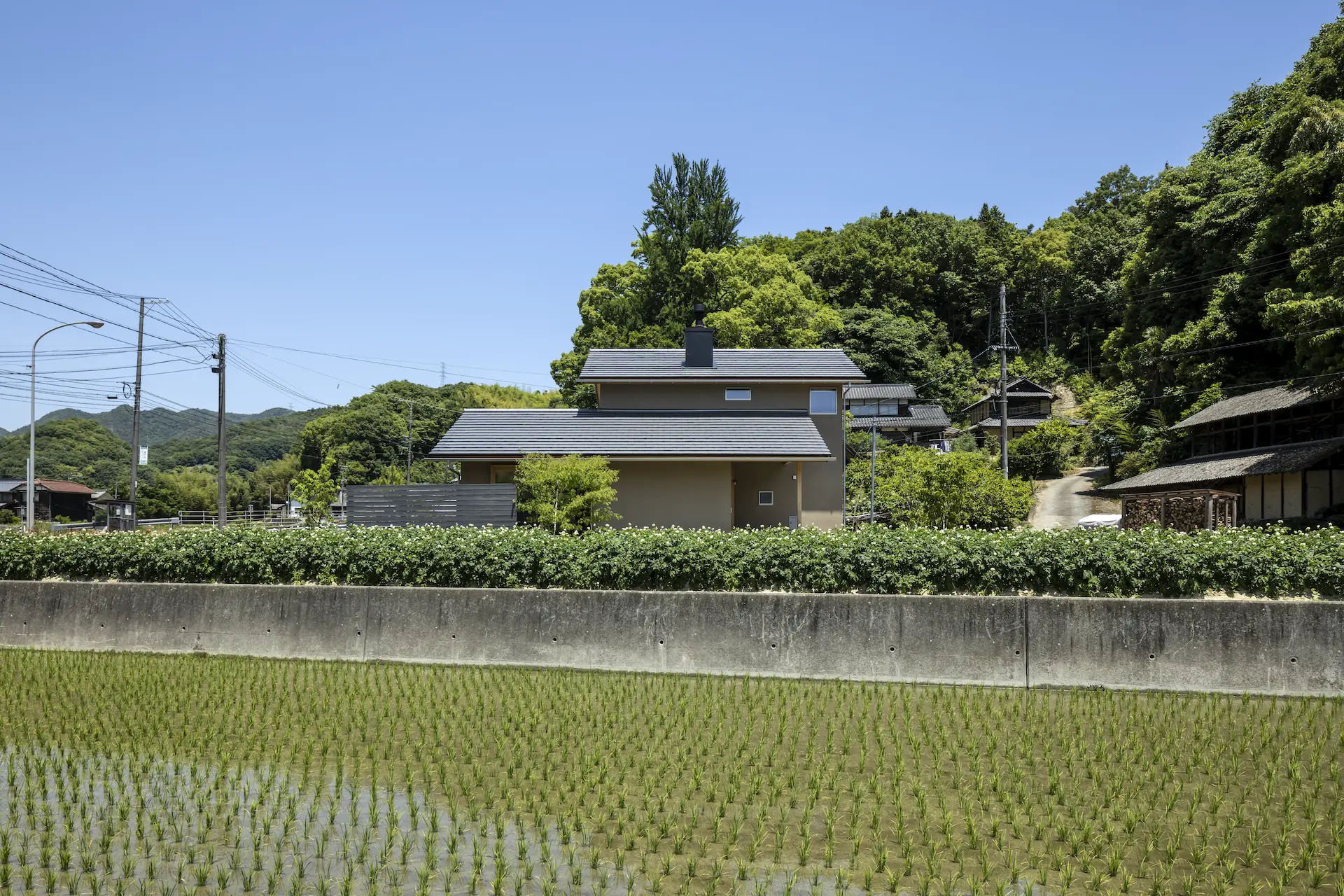 広島県内でも瀬戸内の気候をよく現し温暖で‥町の花であるじゃがいもの白く清々しい花があちこちに広がる場所に敷地はあります。二枚の切妻屋根を架けた単純な構成のなかに、周囲の農地や自然と親密に繋がるように窓を配置しました。新緑の瑞々しい枝葉、じゃがいもの可憐な白い花、水田の輝きを映すよう‥山に親しみ土を愛する暮らしとともにある悦びが宿る住まいです。