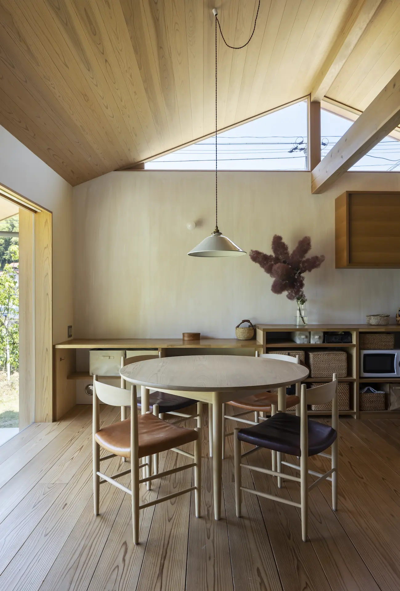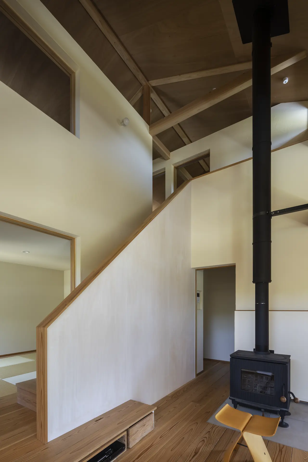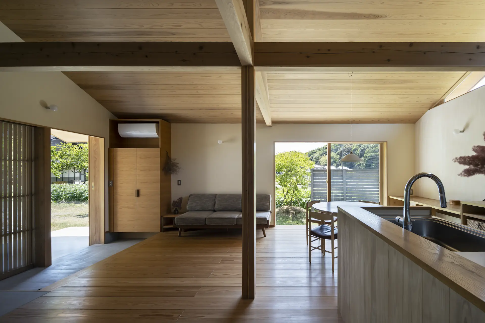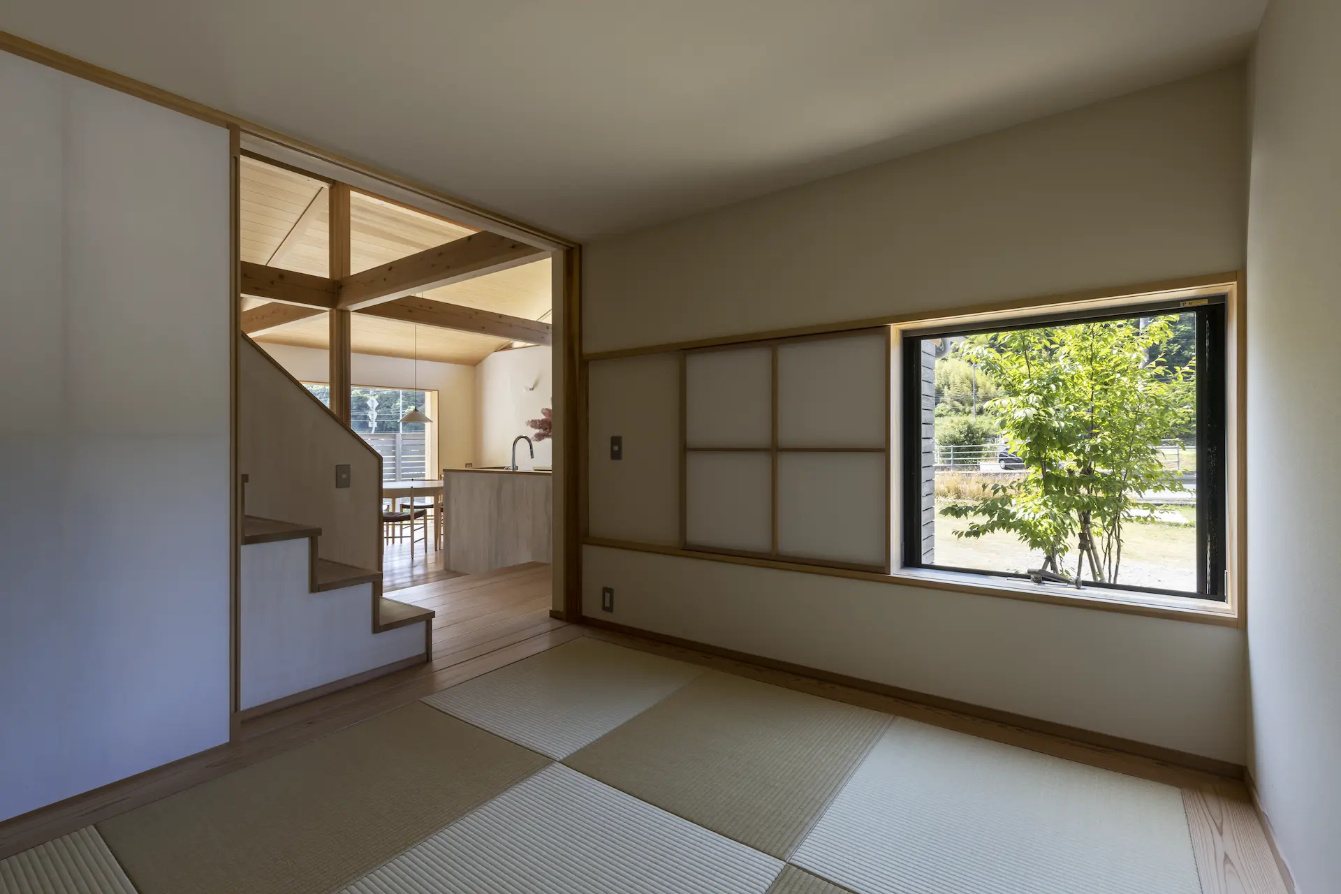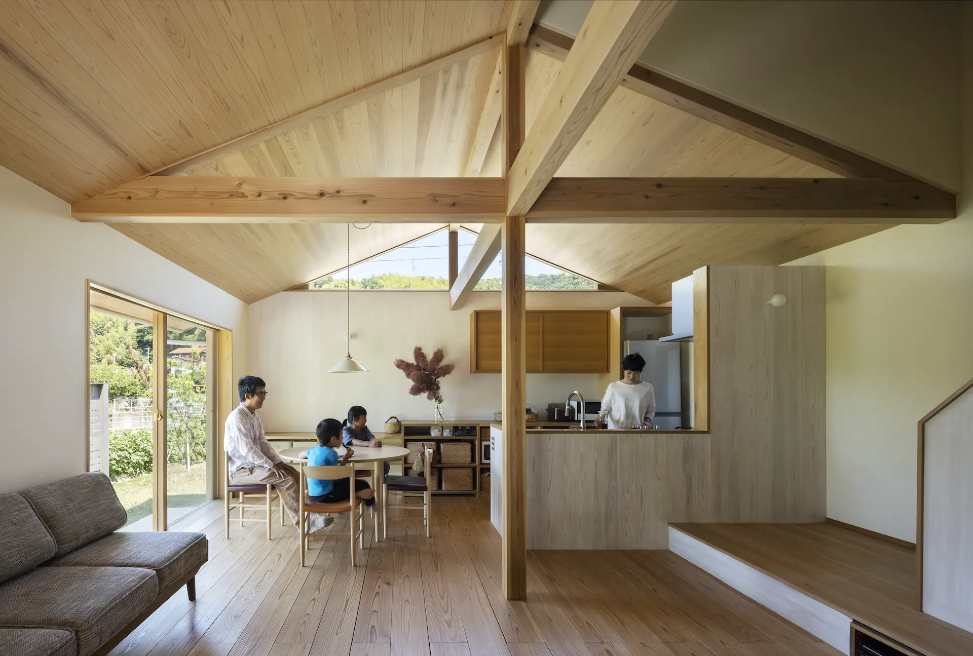 広島県内でも瀬戸内の気候をよく現し温暖で‥町の花であるじゃがいもの白く清々しい花があちこちに広がる場所に敷地はあります。二枚の切妻屋根を架けた単純な構成のなかに、周囲の農地や自然と親密に繋がるように窓を配置しました。新緑の瑞々しい枝葉、じゃがいもの可憐な白い花、水田の輝きを映すよう‥山に親しみ土を愛する暮らしとともにある悦びが宿る住まいです。