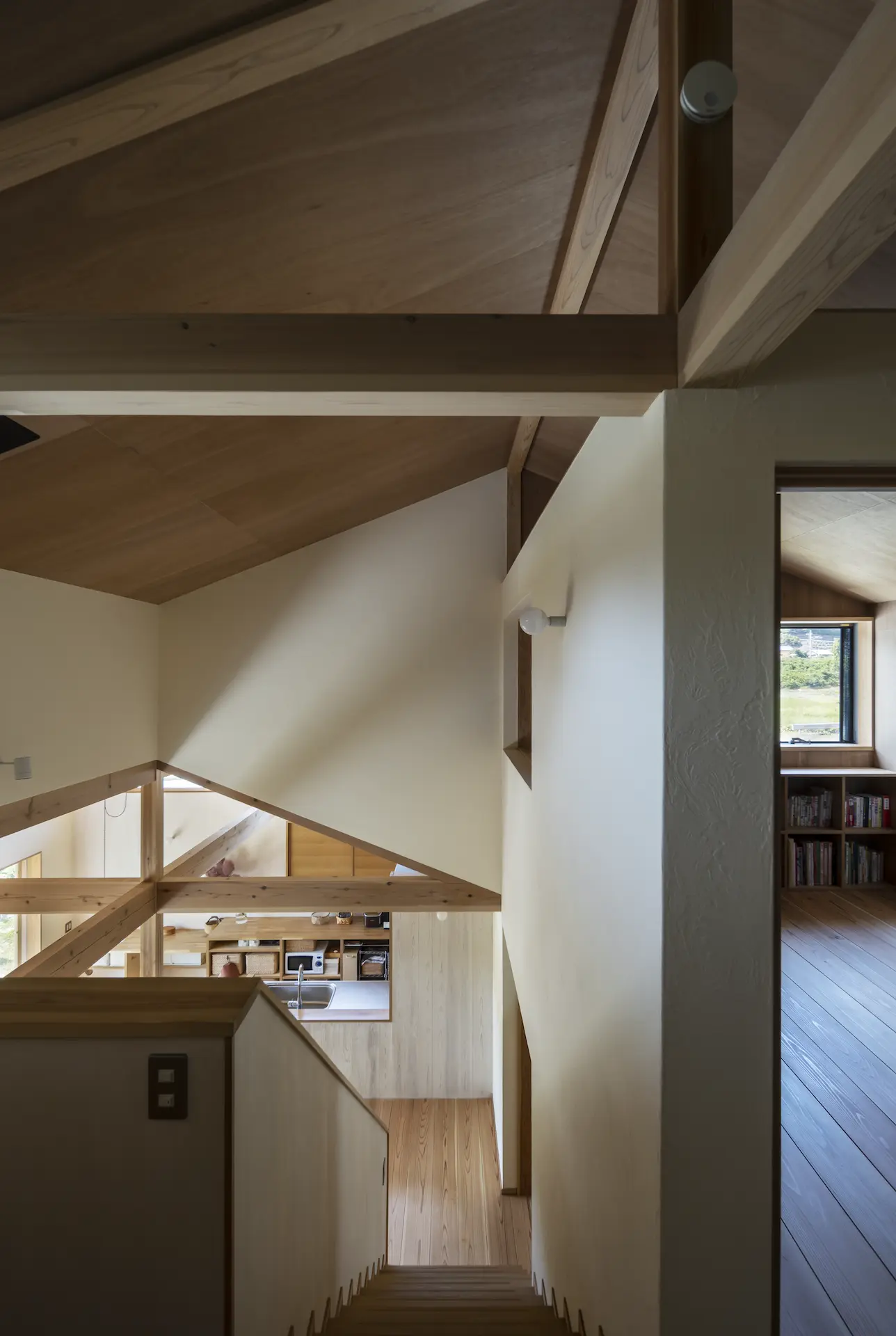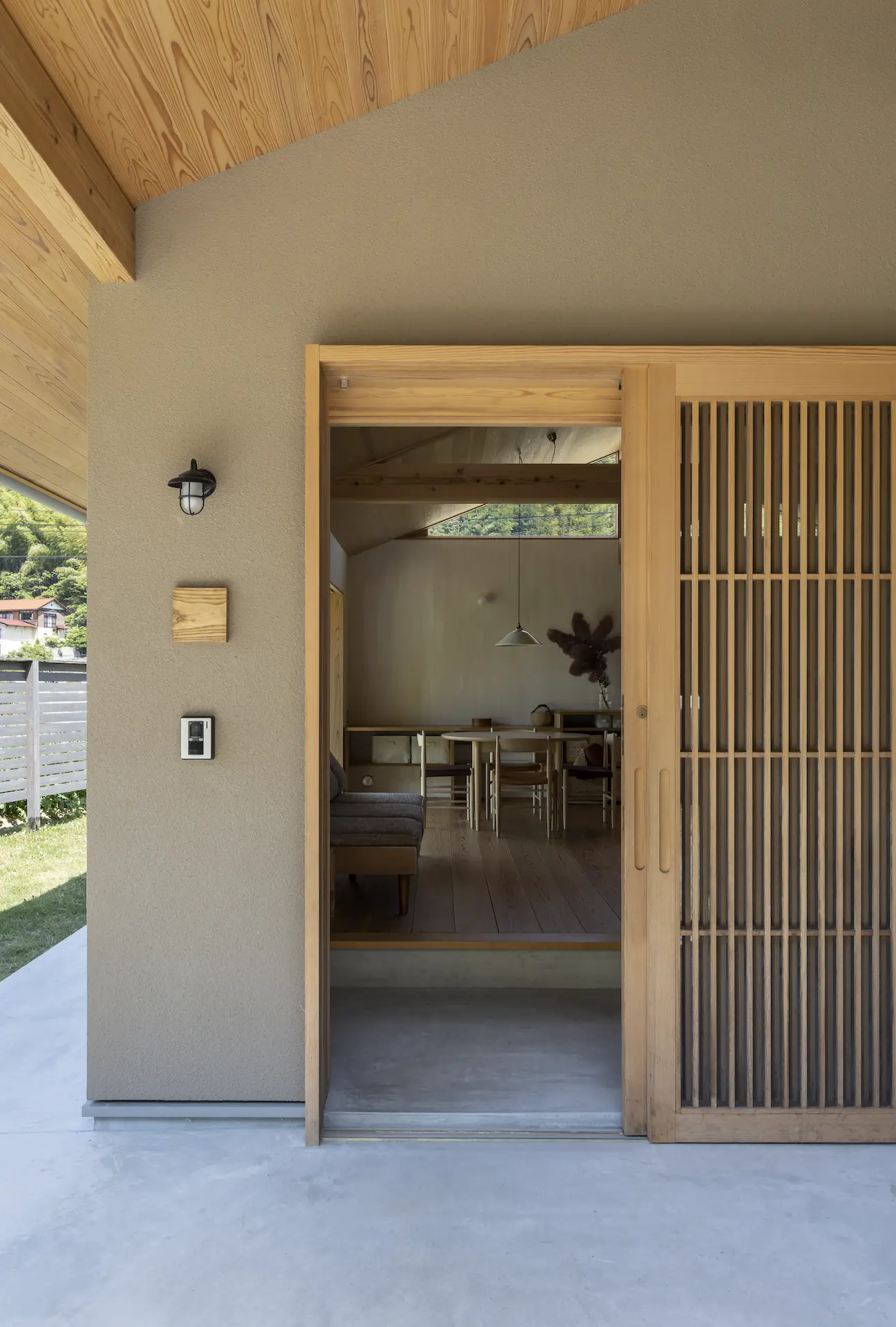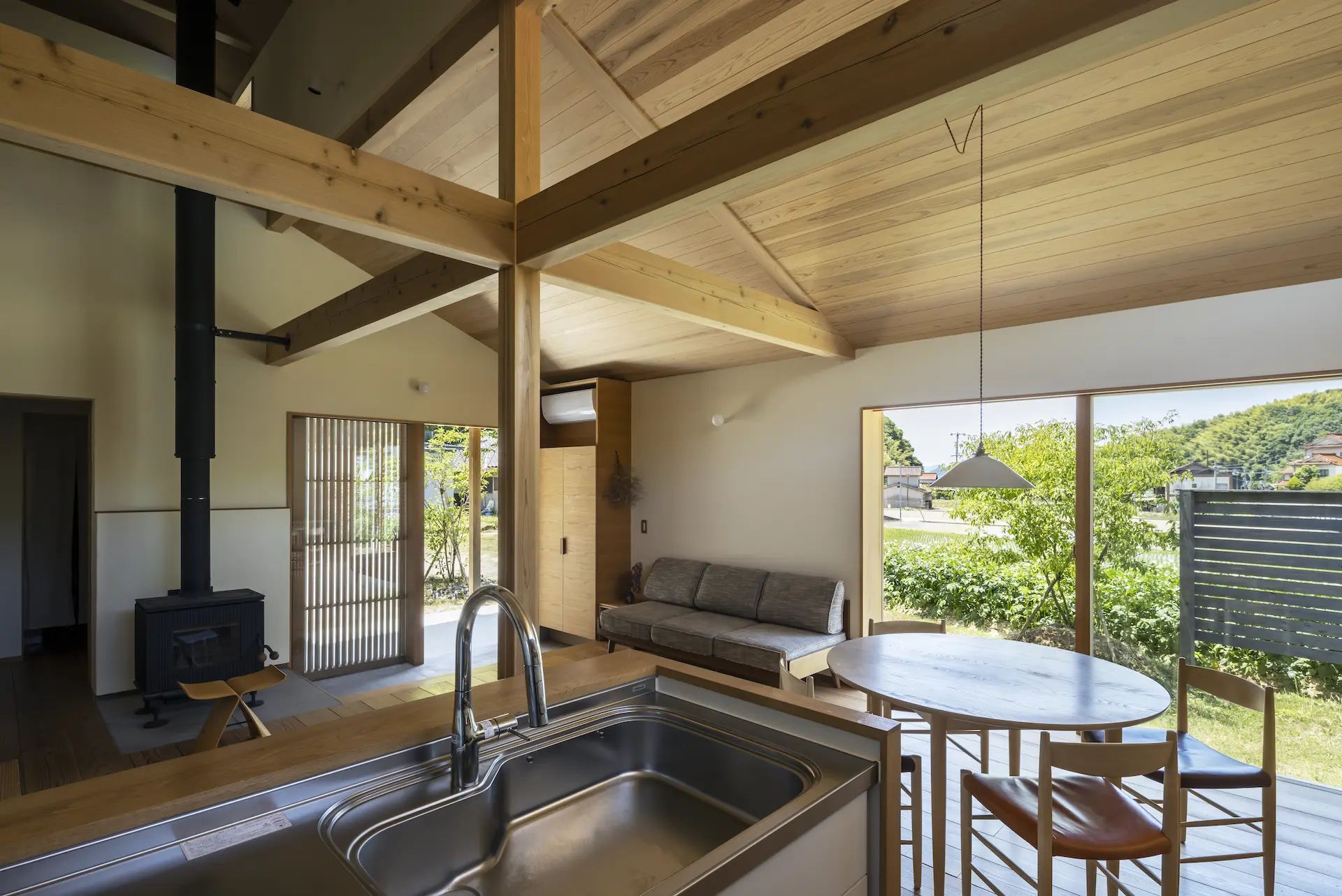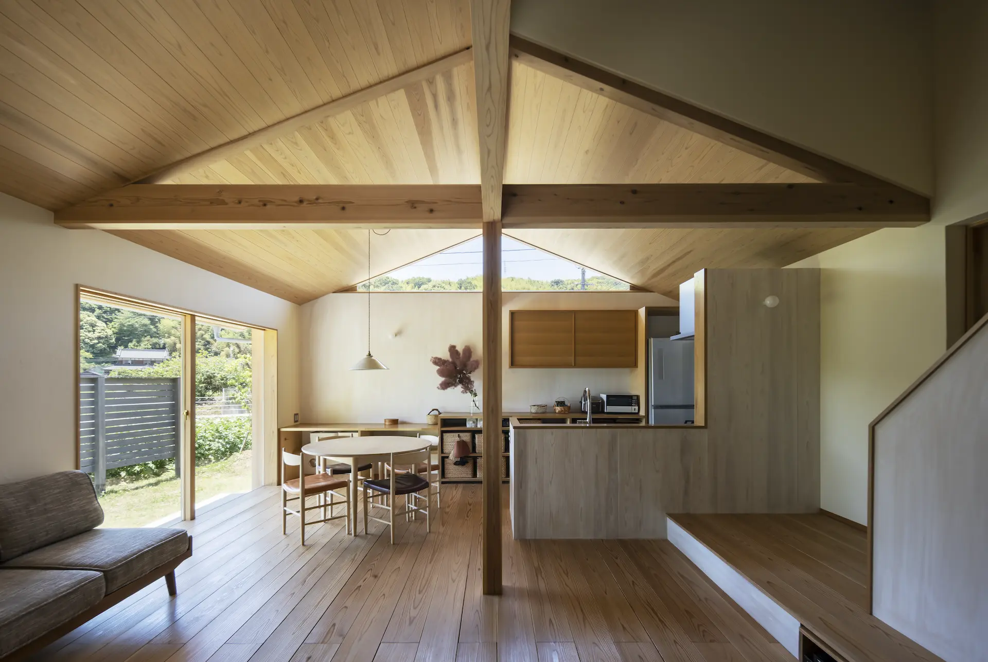 広島県内でも瀬戸内の気候をよく現し温暖で‥町の花であるじゃがいもの白く清々しい花があちこちに広がる場所に敷地はあります。二枚の切妻屋根を架けた単純な構成のなかに、周囲の農地や自然と親密に繋がるように窓を配置しました。新緑の瑞々しい枝葉、じゃがいもの可憐な白い花、水田の輝きを映すよう‥山に親しみ土を愛する暮らしとともにある悦びが宿る住まいです。