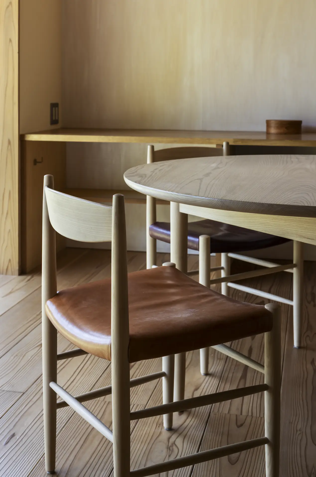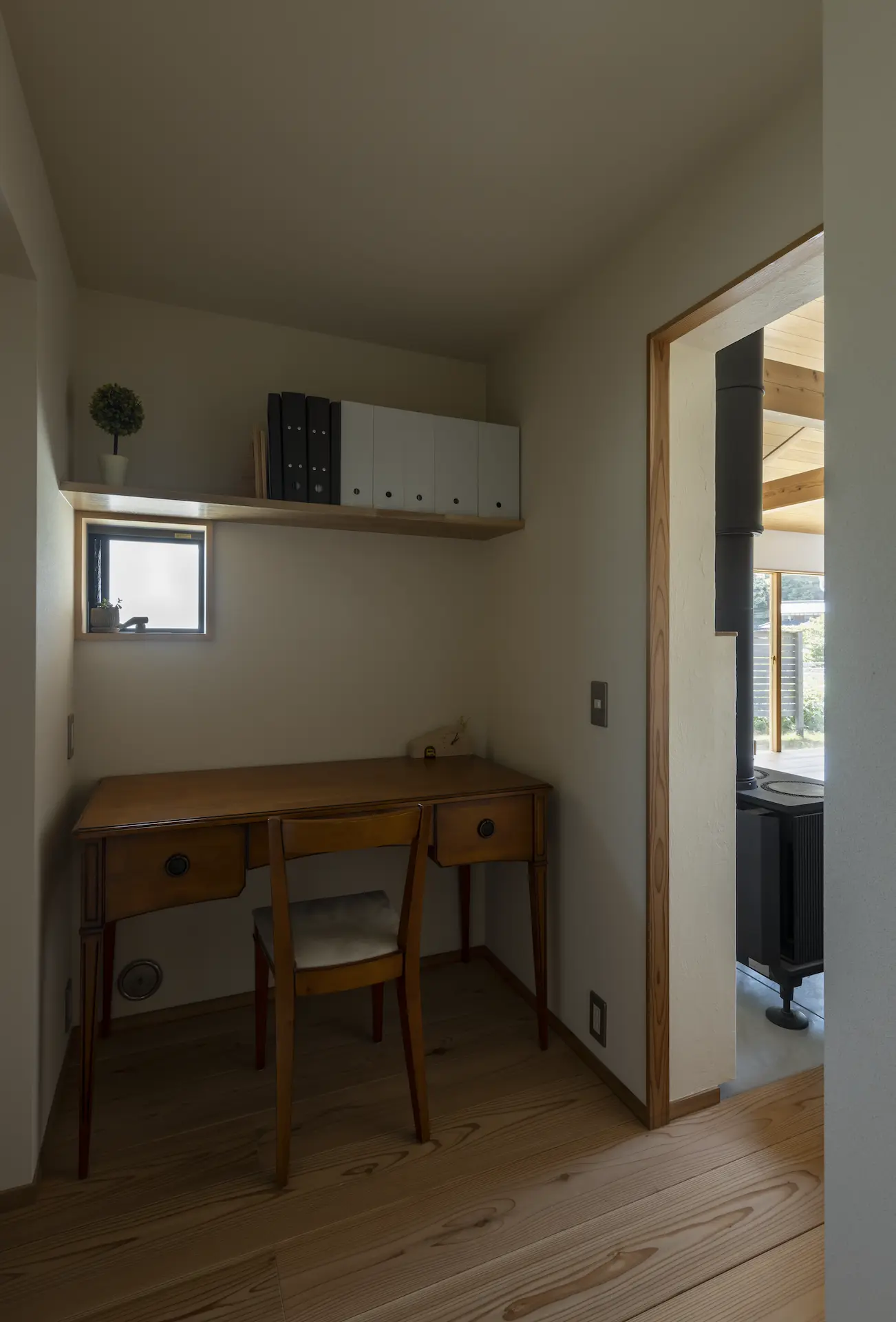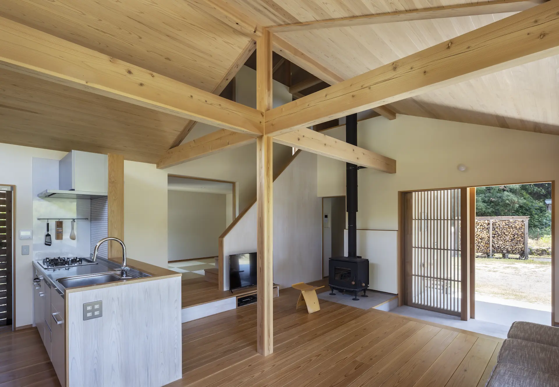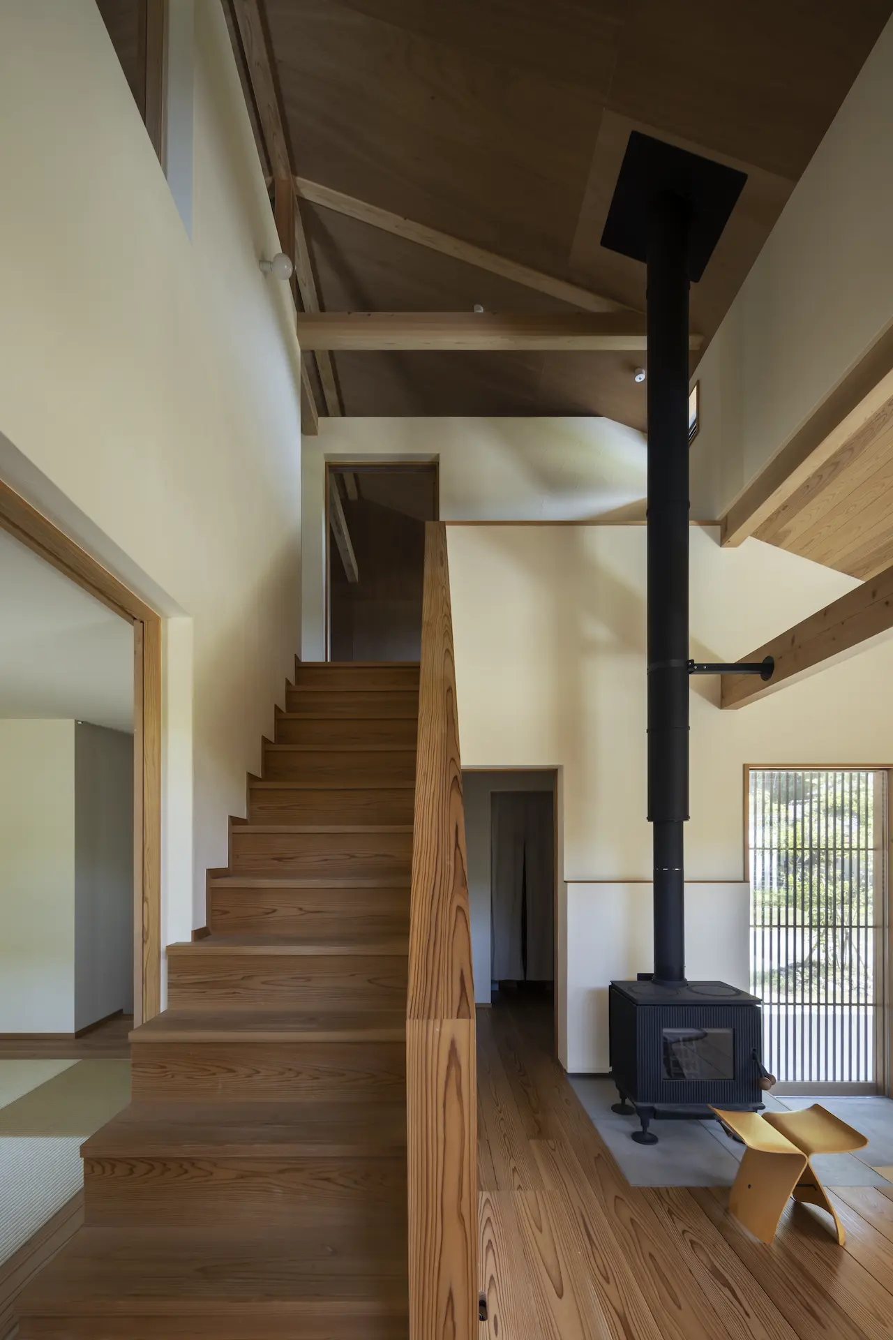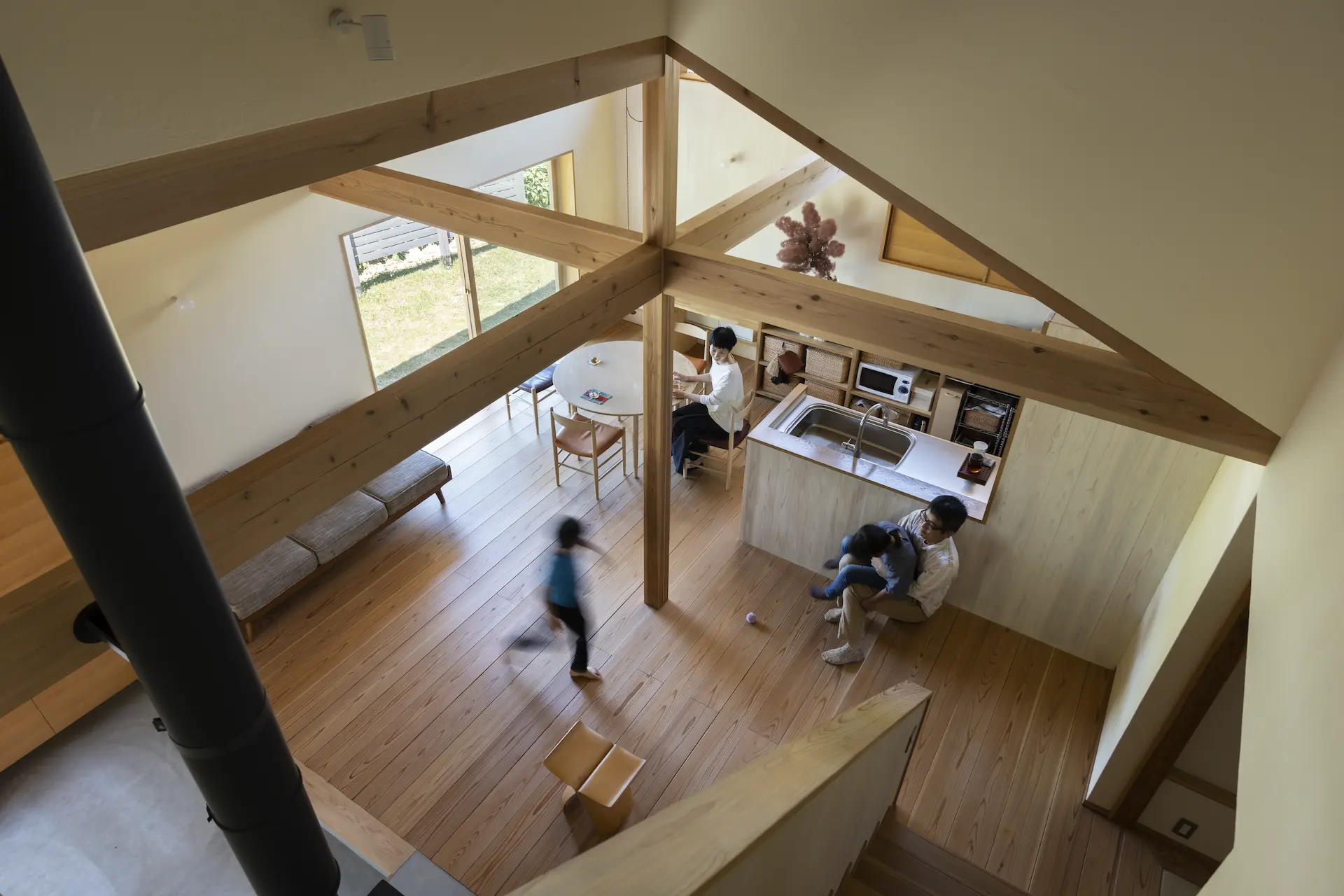 広島県内でも瀬戸内の気候をよく現し温暖で‥町の花であるじゃがいもの白く清々しい花があちこちに広がる場所に敷地はあります。二枚の切妻屋根を架けた単純な構成のなかに、周囲の農地や自然と親密に繋がるように窓を配置しました。新緑の瑞々しい枝葉、じゃがいもの可憐な白い花、水田の輝きを映すよう‥山に親しみ土を愛する暮らしとともにある悦びが宿る住まいです。