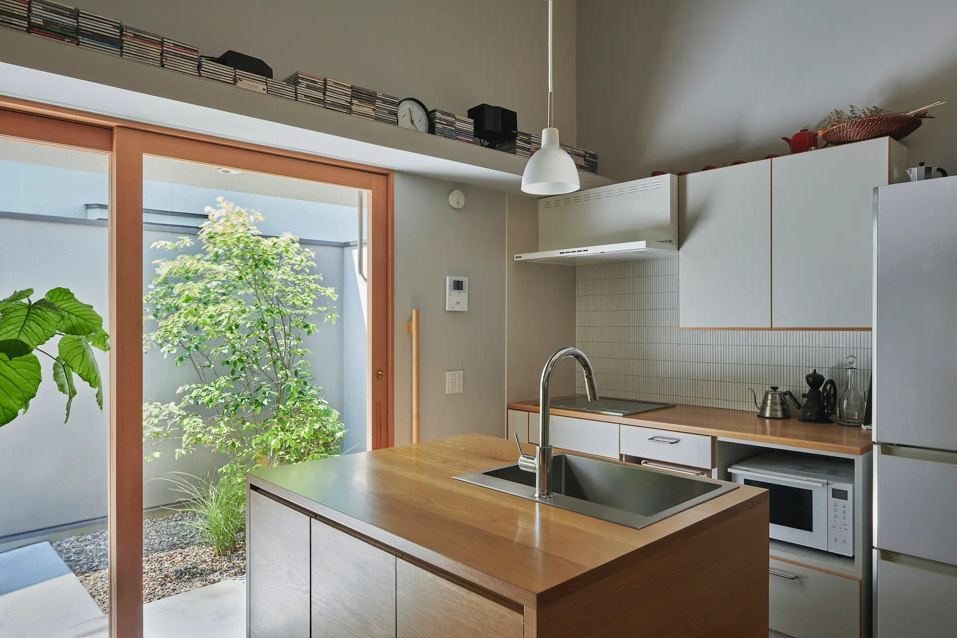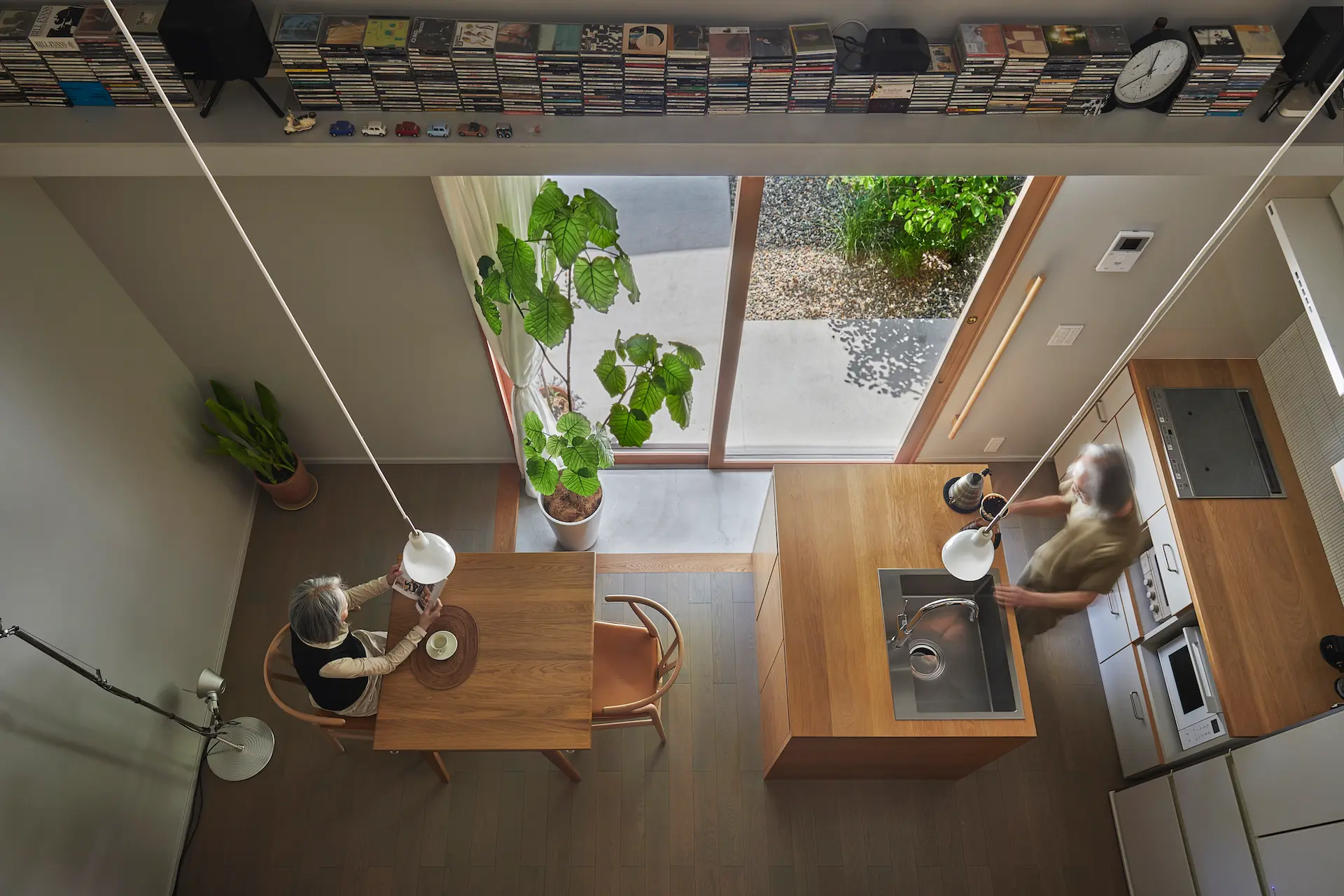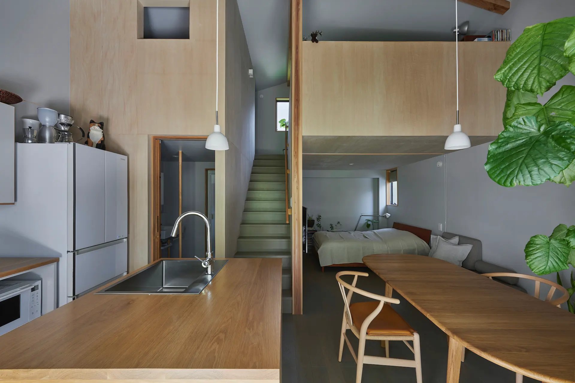 東京・吉祥寺 住宅が建ち並ぶ市街地にある木造2階建ての住宅です。 窓辺のキッチンとダイニングをくつろぎの中心として、奥へは落ち着ける寝室を、そしてご夫婦のお気に入りの詰まった上階。小さな中庭に青葉が揺れて、切妻屋根の下に音楽が満ちる・・人生をかけてふたりで集めてきたかけがえのないものを仕舞う宝箱のような、16坪の小さくて愛おしい住宅です。