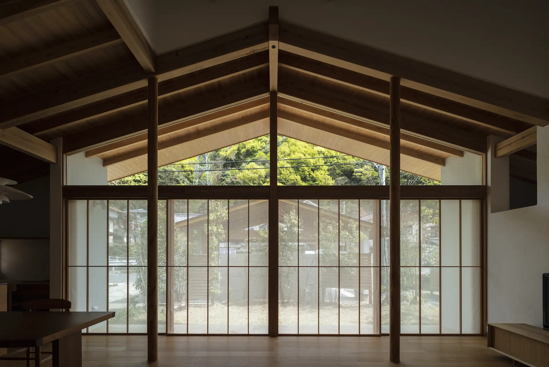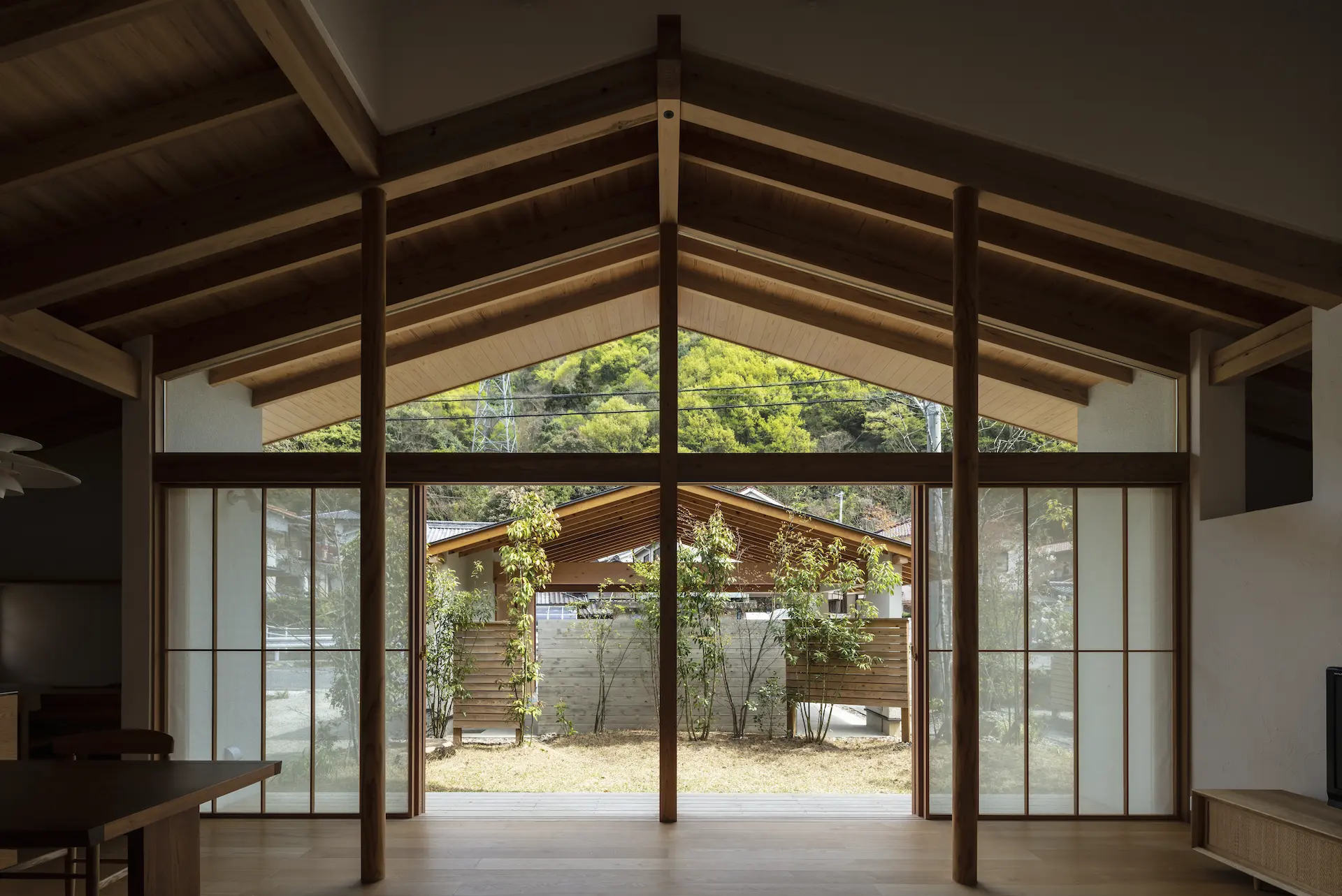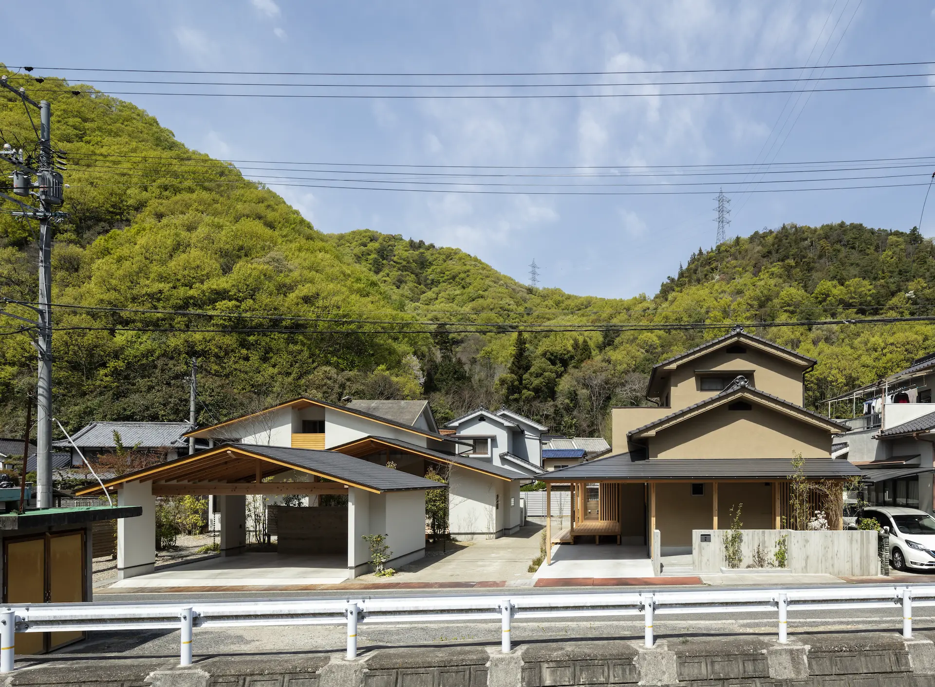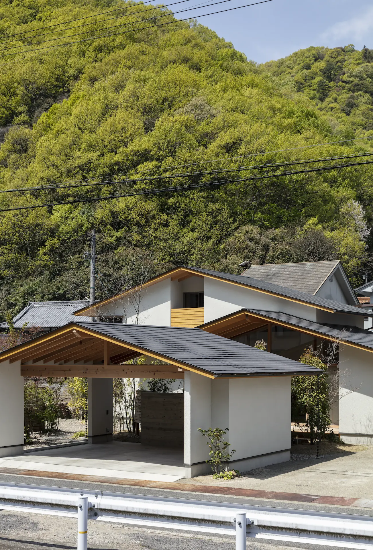 広島県三原市、周囲を山々に囲まれた谷の集落の一角。親世帯(続 三原の家)の隣の敷地に新居を構えた、子世帯のための住まいです。道路側に配置した車庫棟や庭の木々、大窓に設えたレース障子が、日々の生活のなかに落ち着ける居場所を与えてくれます。切妻屋根で切り取られた三角形の欄間は、周囲にひろがる山並みの春夏秋冬‥ゆっくりと移りゆく風景を映します。三つの切妻屋根の下に 風景とともにある穏やかな暮らしを実現した住まいです。