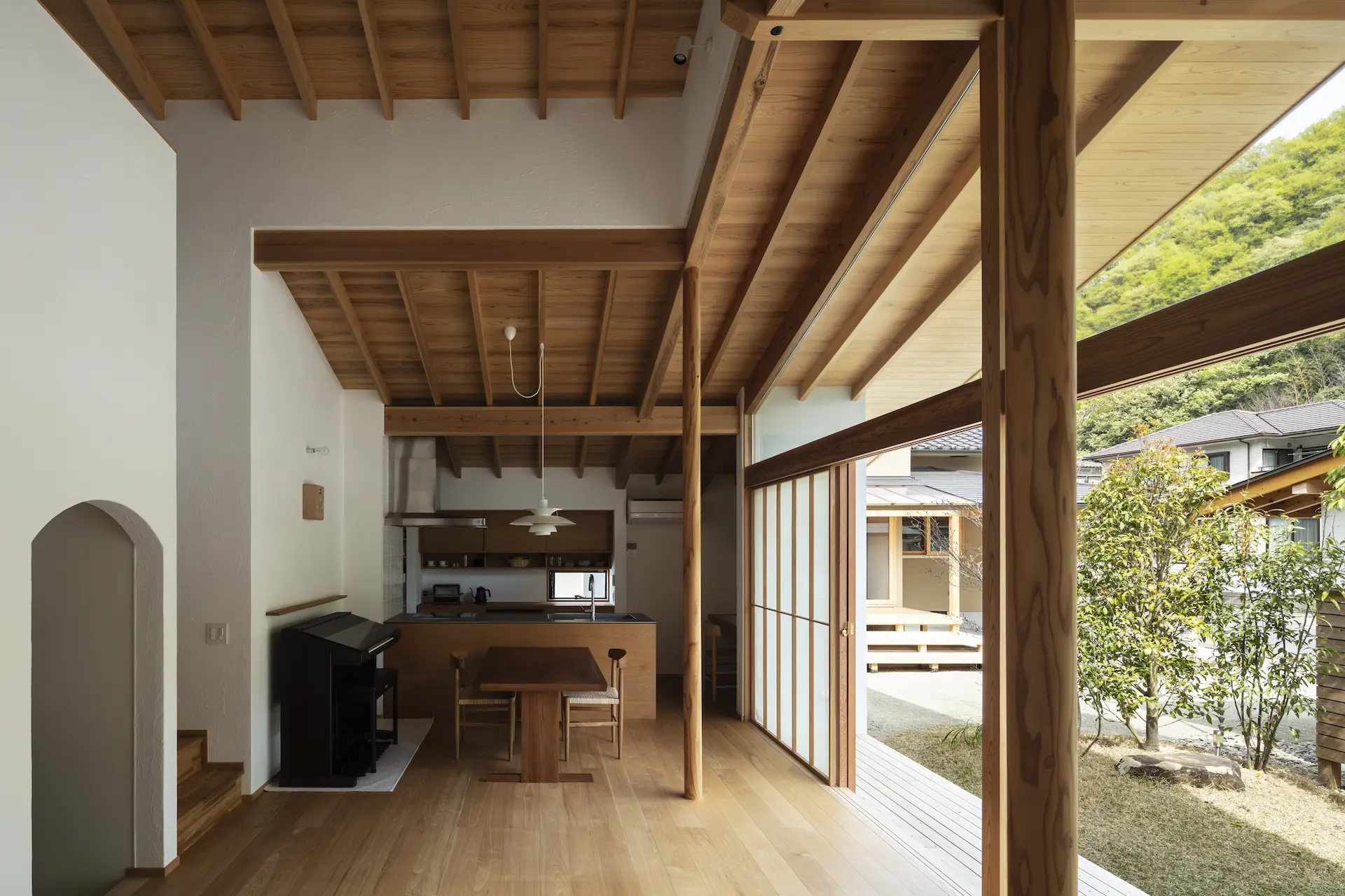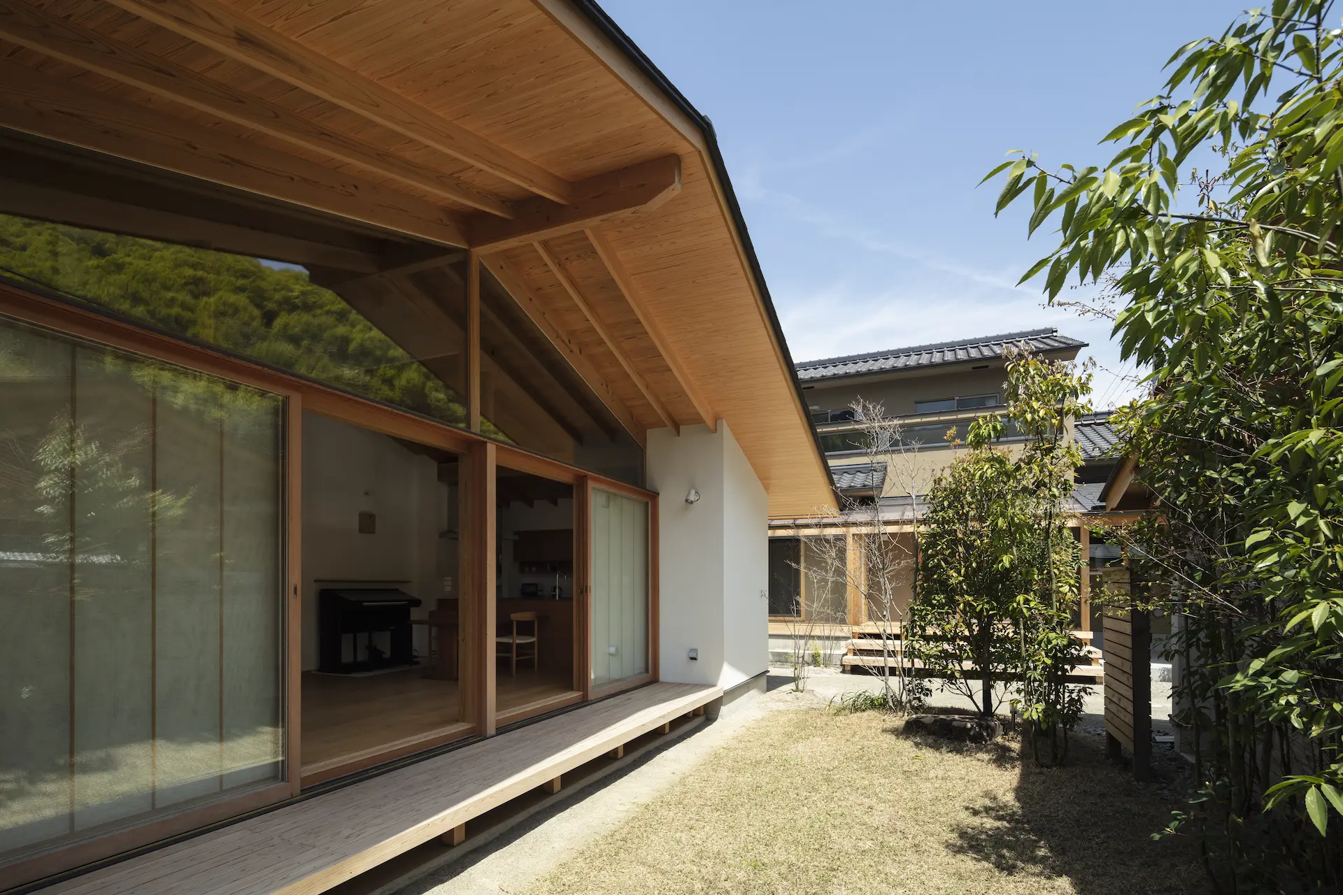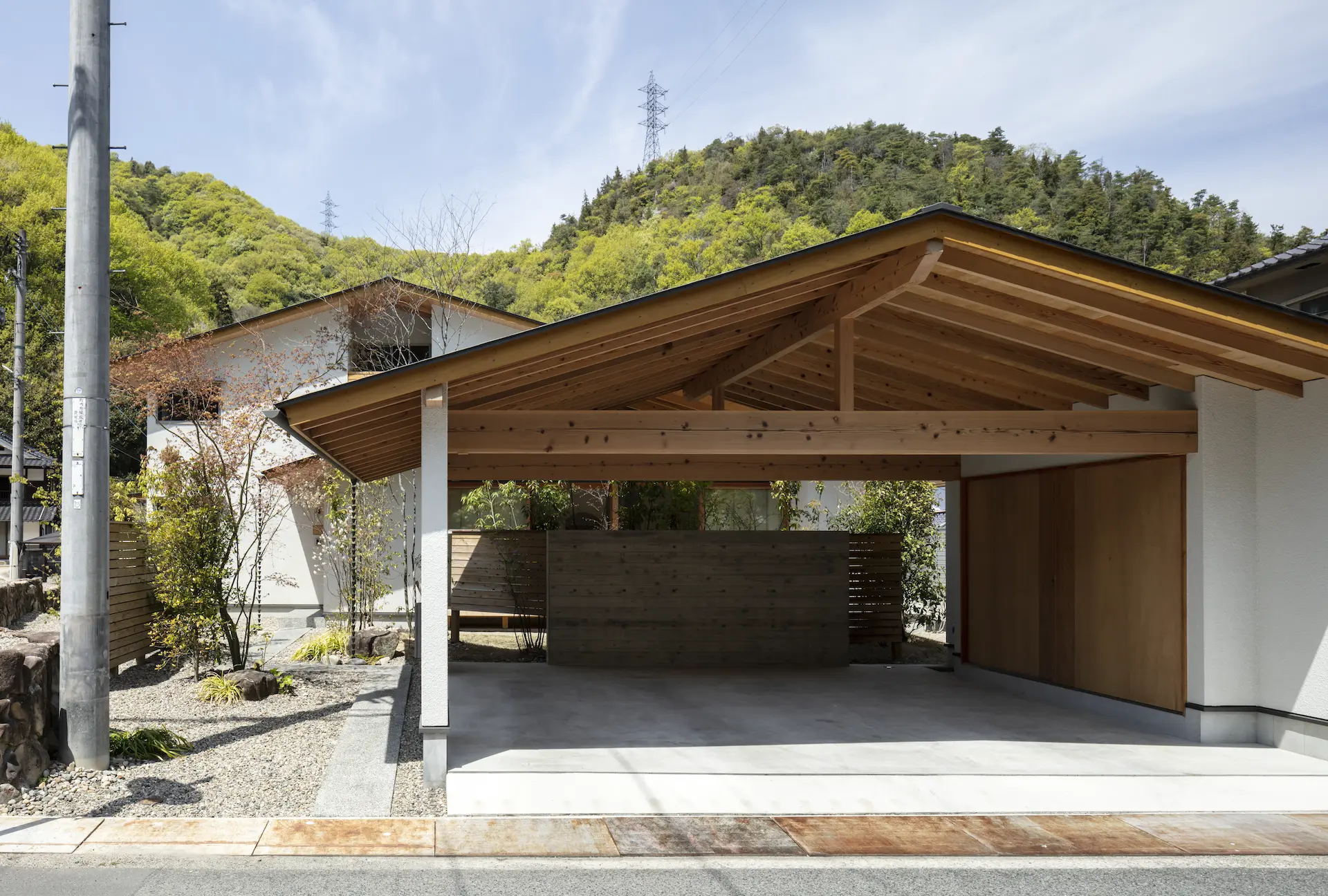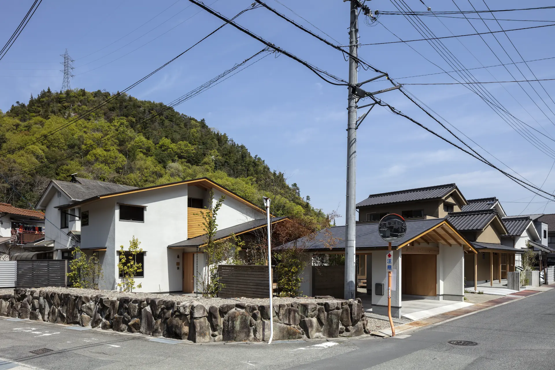 広島県三原市、周囲を山々に囲まれた谷の集落の一角。親世帯(続 三原の家)の隣の敷地に新居を構えた、子世帯のための住まいです。道路側に配置した車庫棟や庭の木々、大窓に設えたレース障子が、日々の生活のなかに落ち着ける居場所を与えてくれます。切妻屋根で切り取られた三角形の欄間は、周囲にひろがる山並みの春夏秋冬‥ゆっくりと移りゆく風景を映します。三つの切妻屋根の下に 風景とともにある穏やかな暮らしを実現した住まいです。