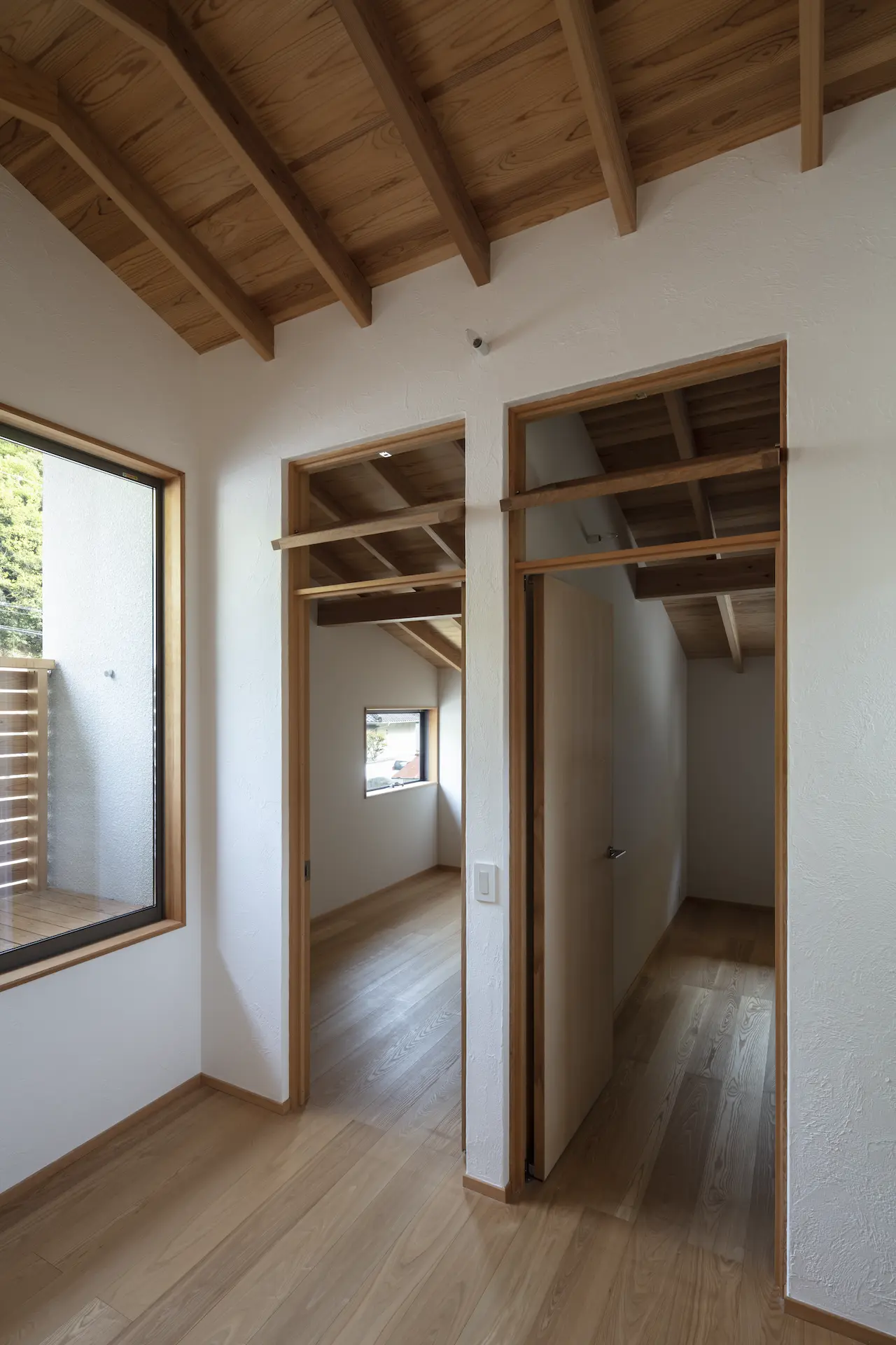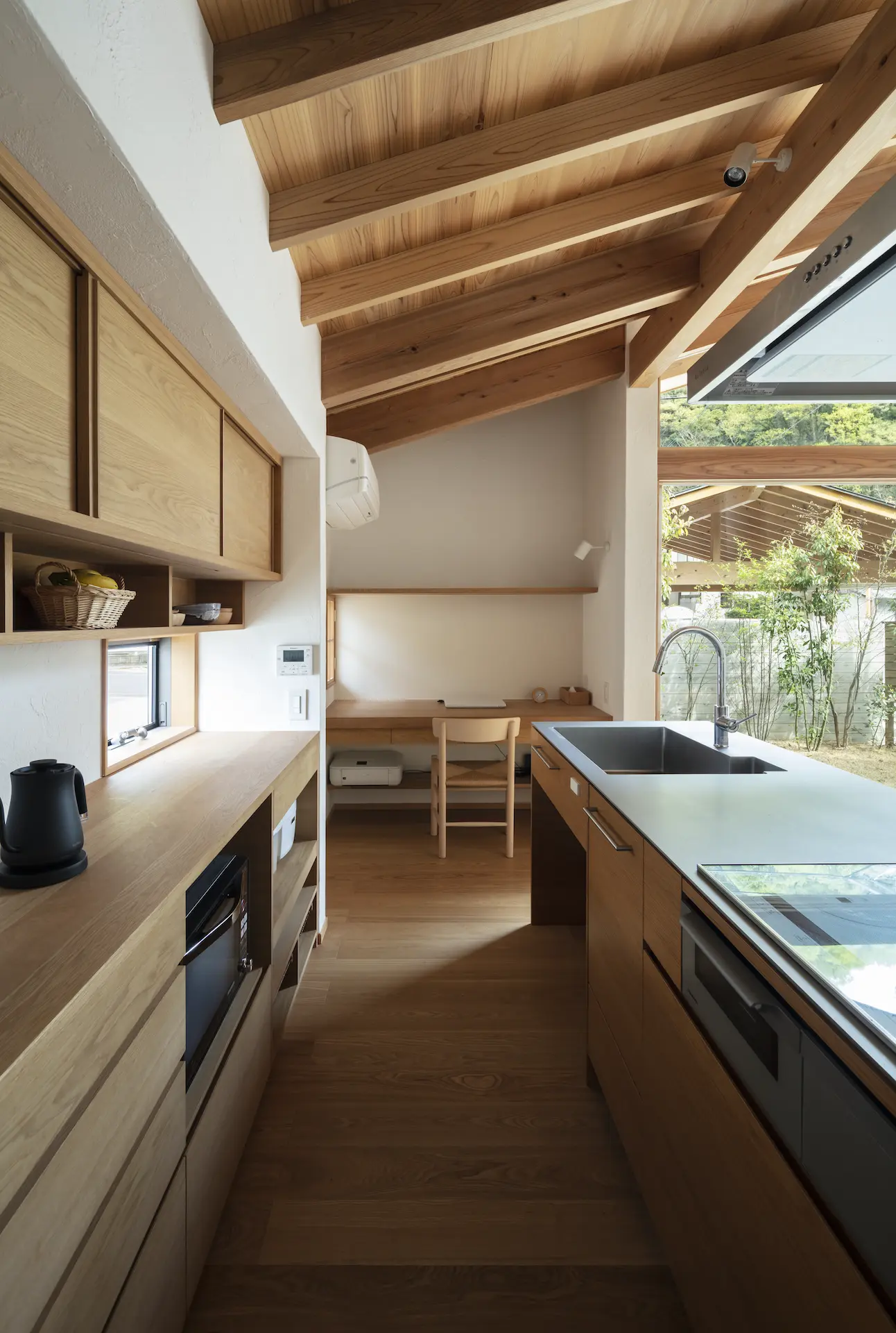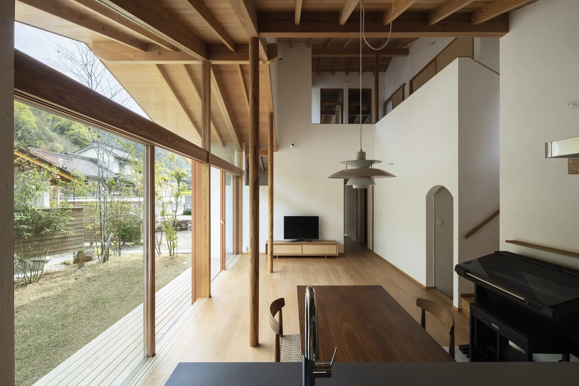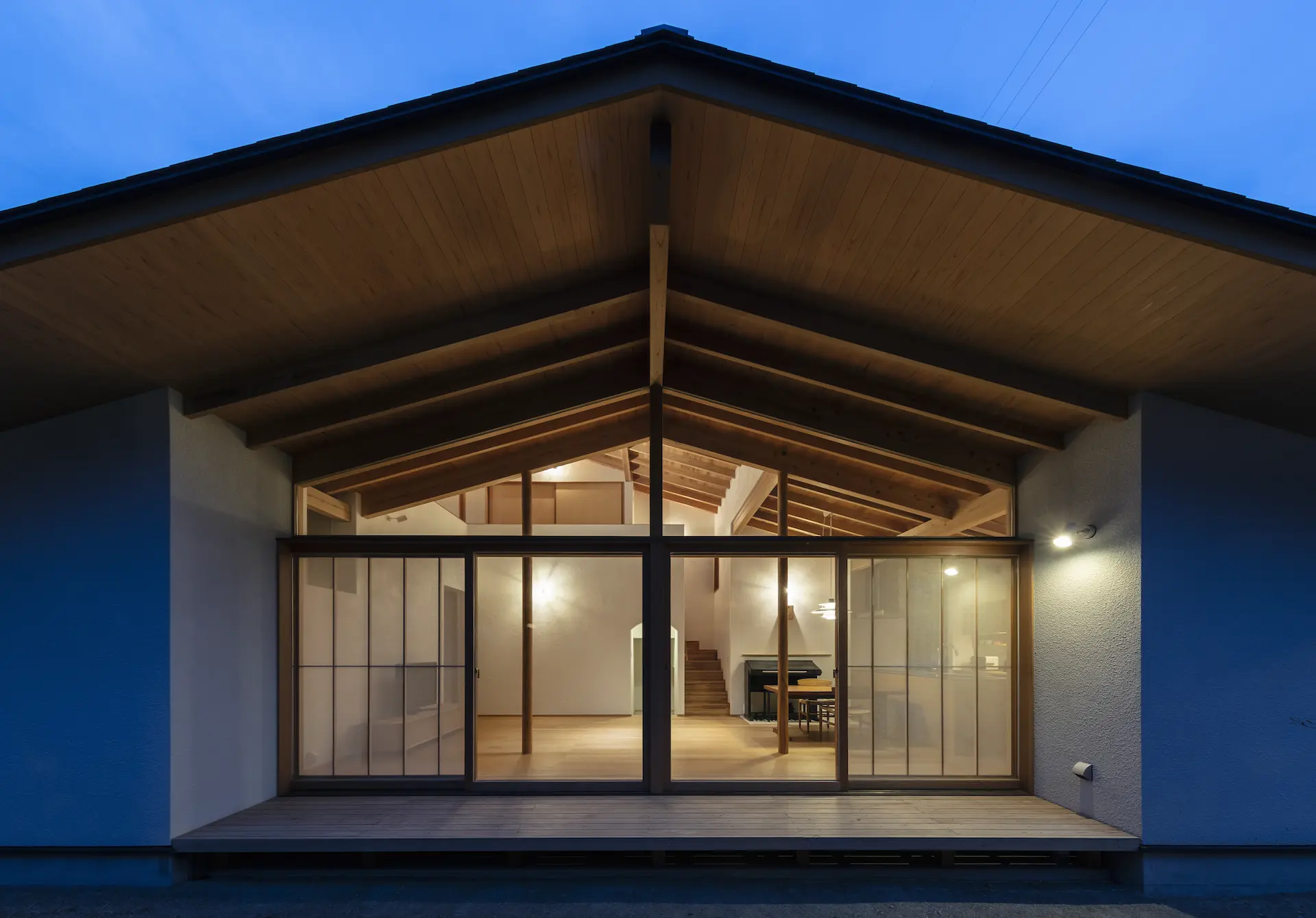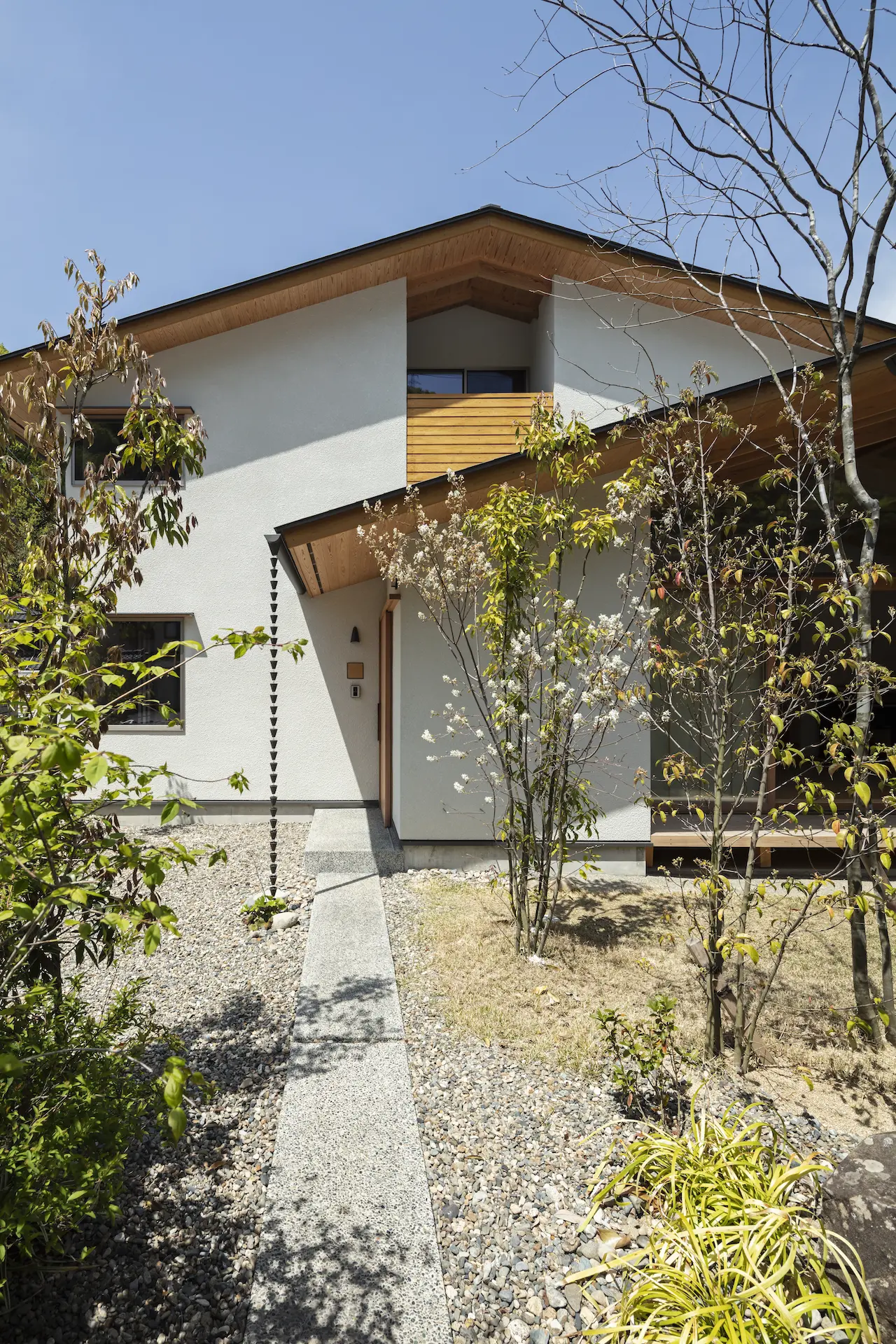 広島県三原市、周囲を山々に囲まれた谷の集落の一角。親世帯(続 三原の家)の隣の敷地に新居を構えた、子世帯のための住まいです。道路側に配置した車庫棟や庭の木々、大窓に設えたレース障子が、日々の生活のなかに落ち着ける居場所を与えてくれます。切妻屋根で切り取られた三角形の欄間は、周囲にひろがる山並みの春夏秋冬‥ゆっくりと移りゆく風景を映します。三つの切妻屋根の下に 風景とともにある穏やかな暮らしを実現した住まいです。