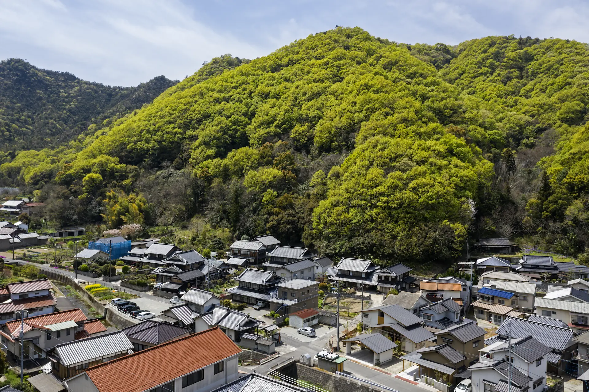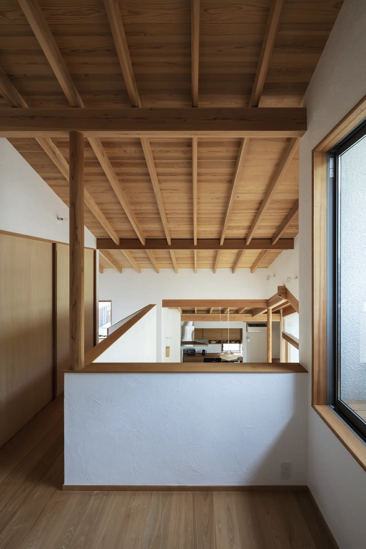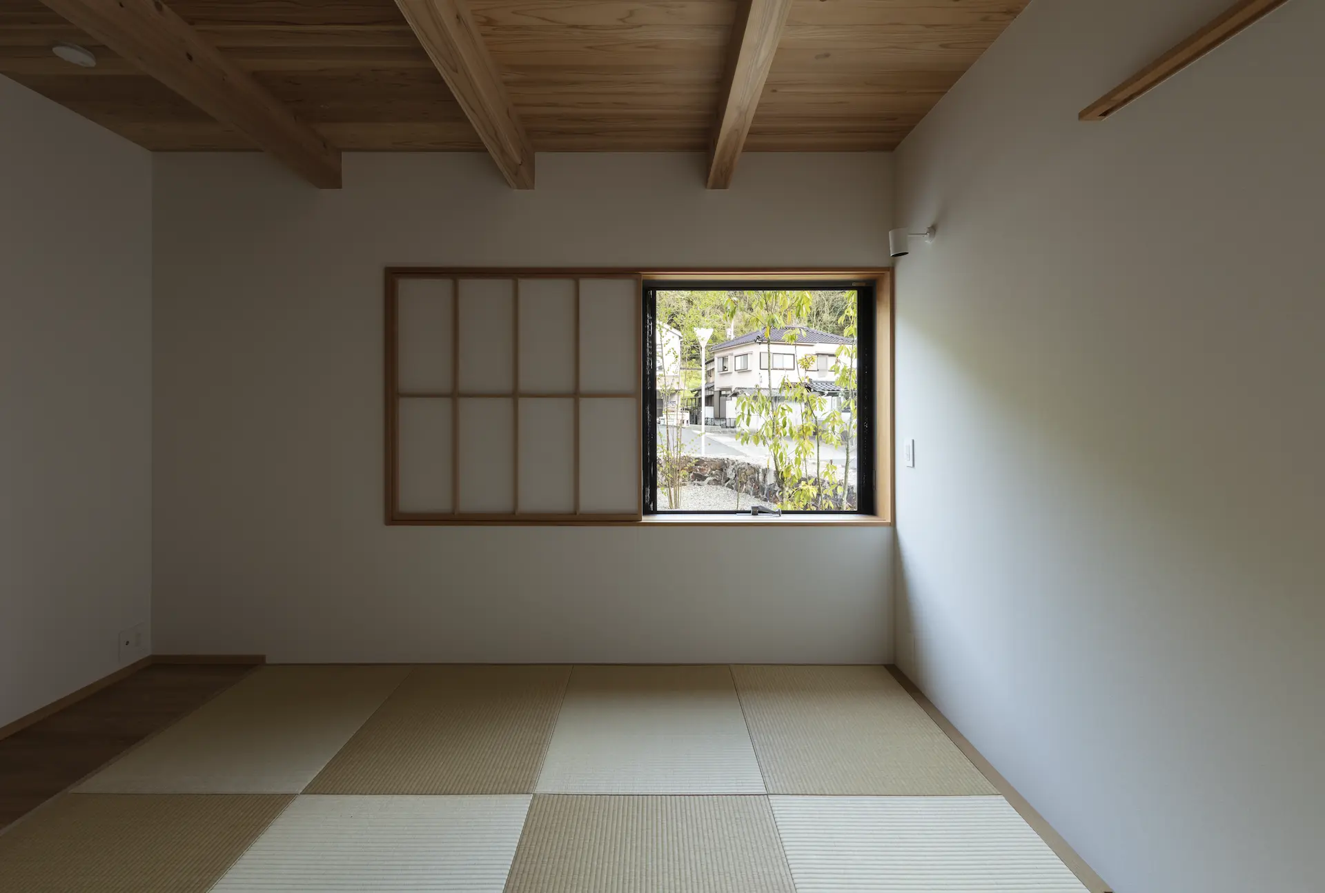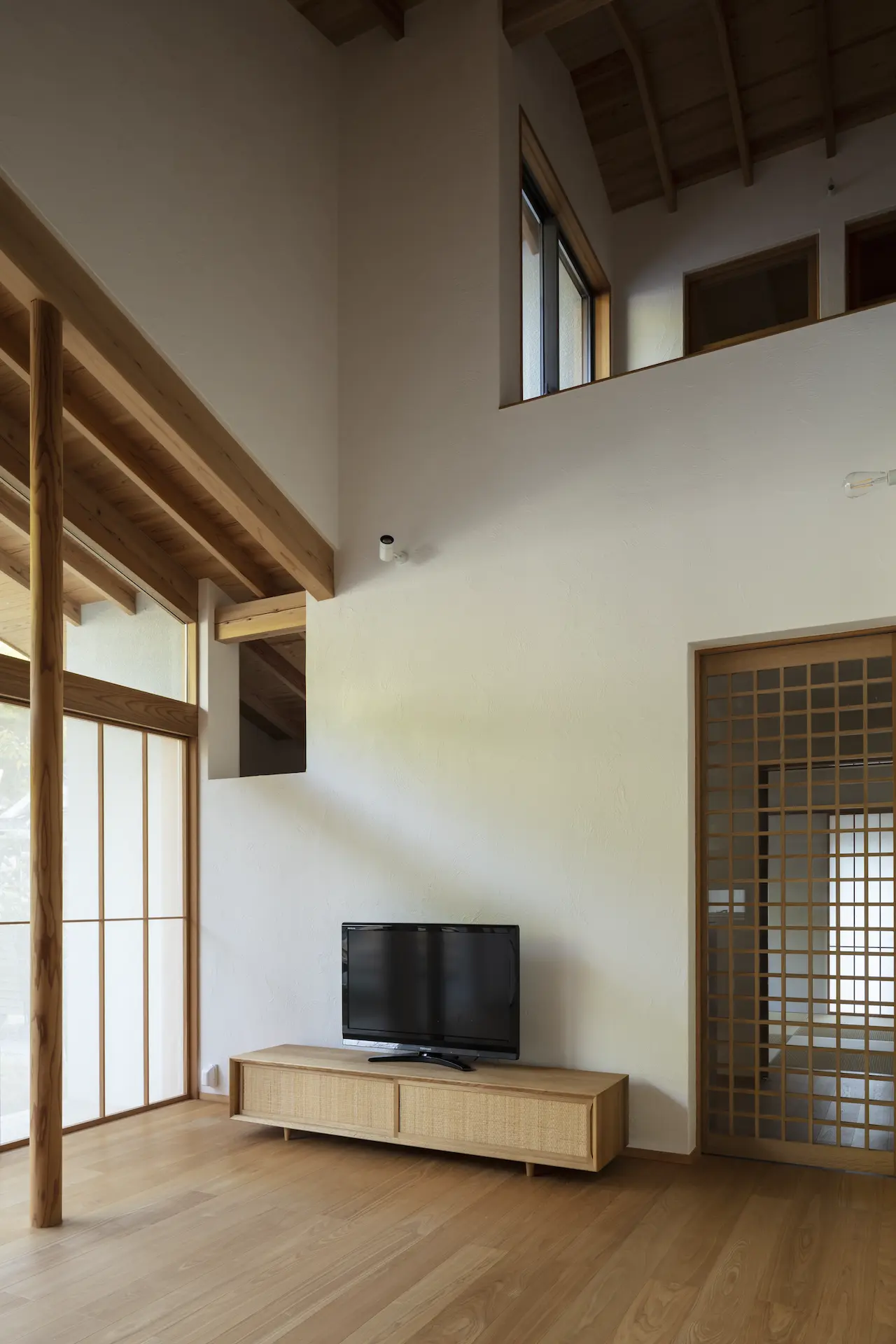 広島県三原市、周囲を山々に囲まれた谷の集落の一角。親世帯(続 三原の家)の隣の敷地に新居を構えた、子世帯のための住まいです。道路側に配置した車庫棟や庭の木々、大窓に設えたレース障子が、日々の生活のなかに落ち着ける居場所を与えてくれます。切妻屋根で切り取られた三角形の欄間は、周囲にひろがる山並みの春夏秋冬‥ゆっくりと移りゆく風景を映します。三つの切妻屋根の下に 風景とともにある穏やかな暮らしを実現した住まいです。