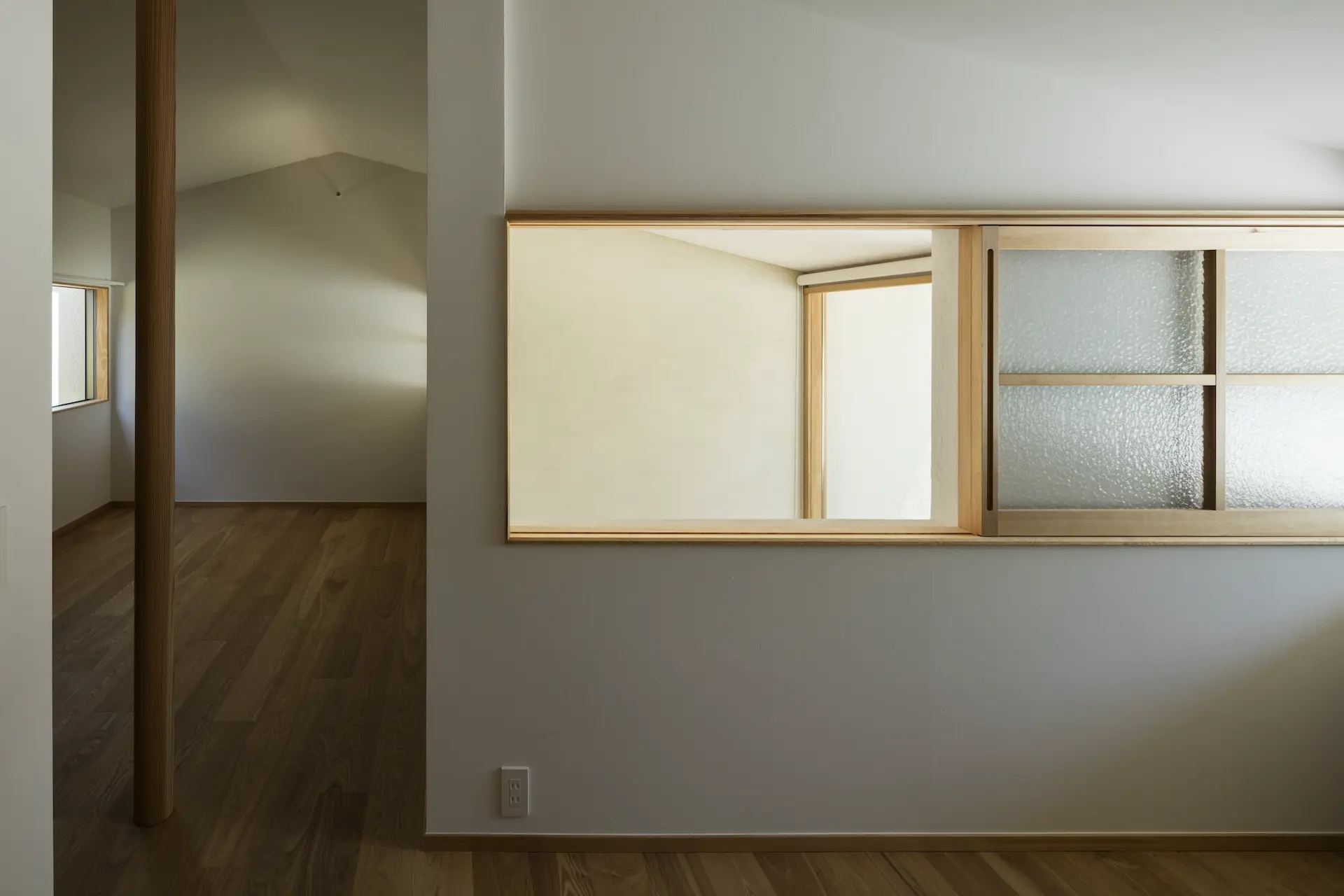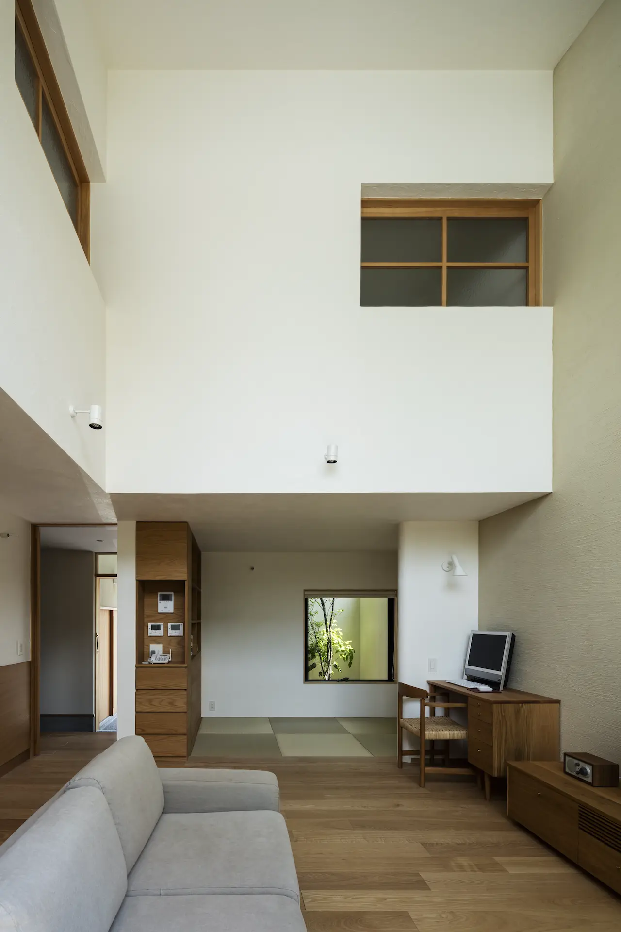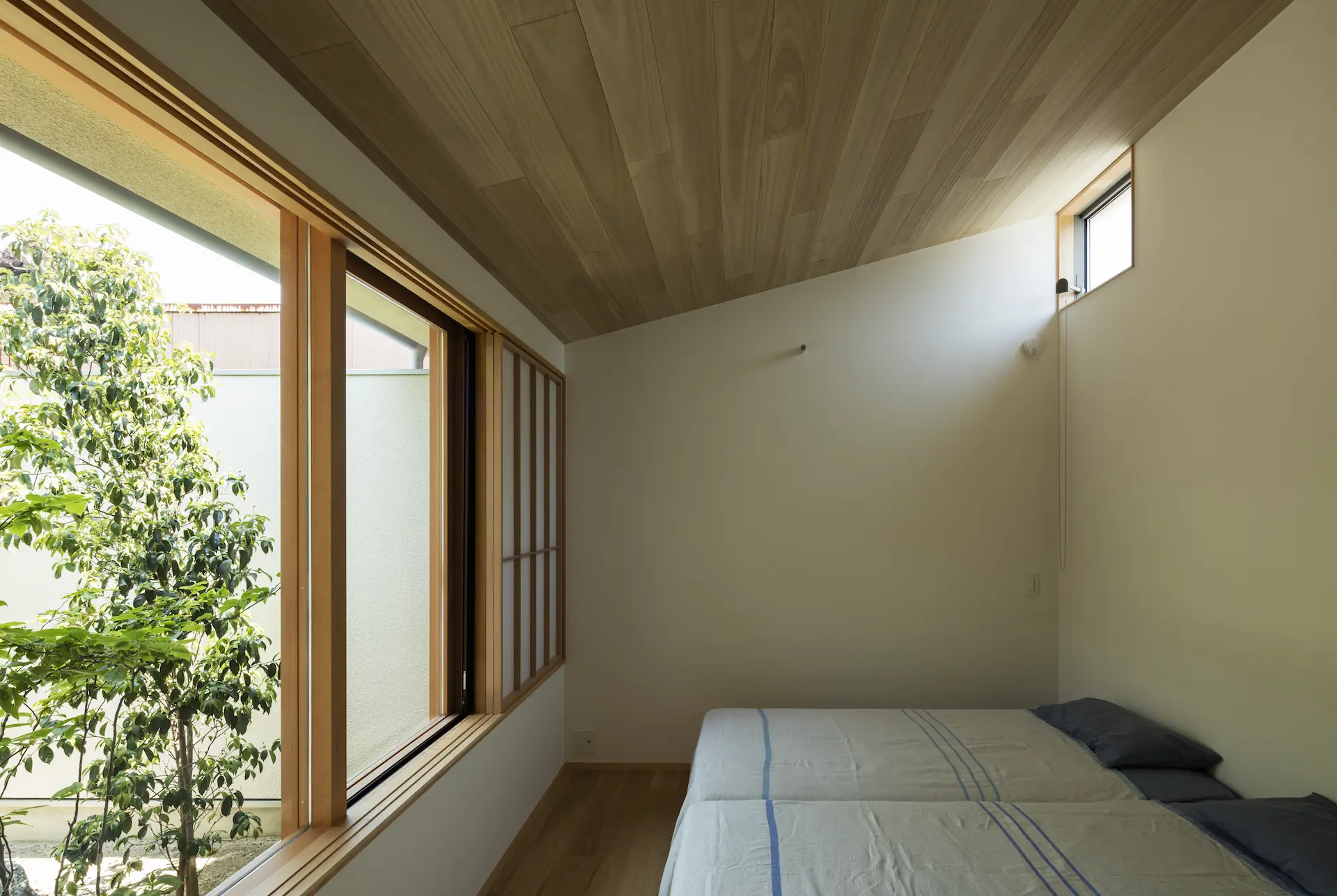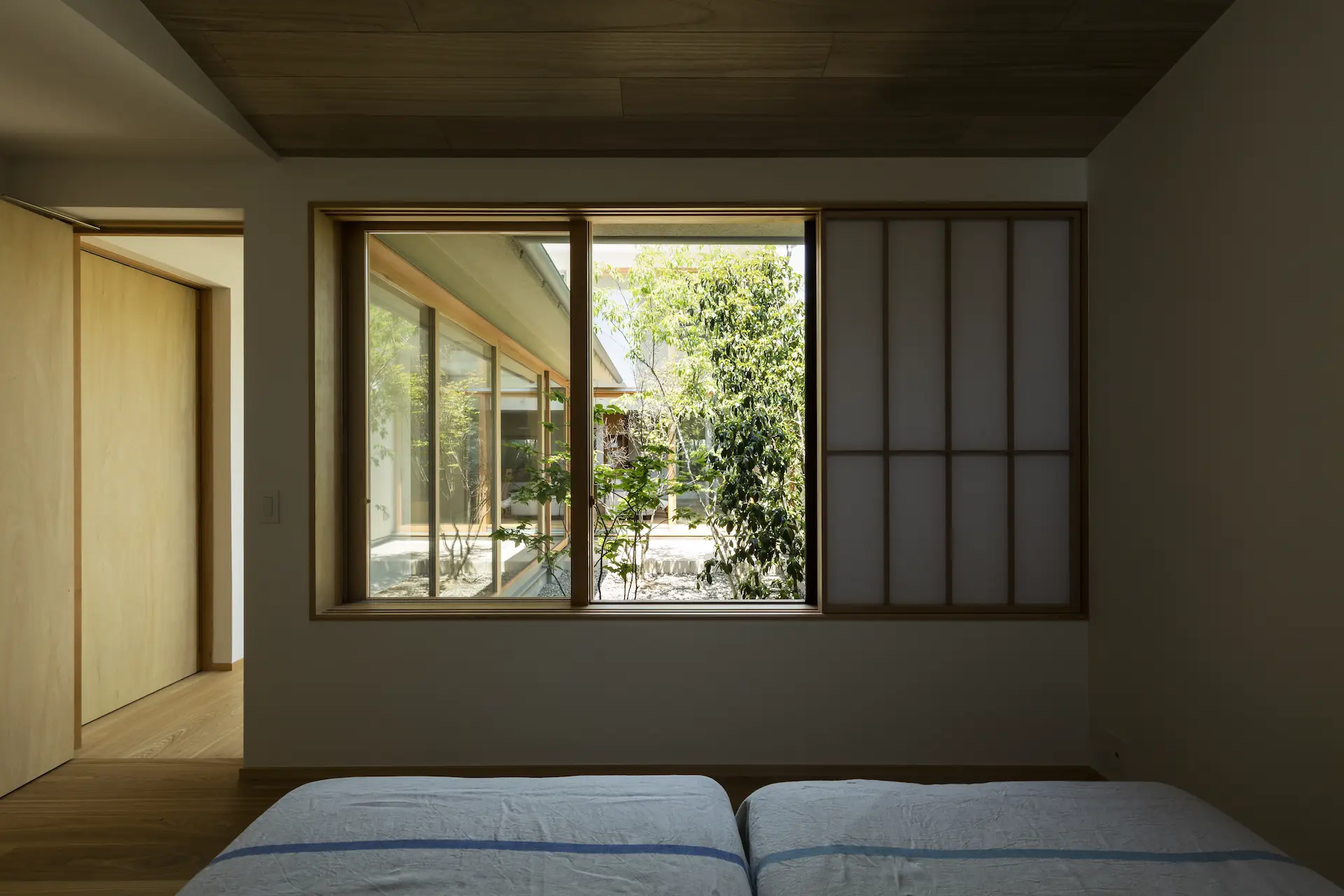 中庭に差し込む朝日が障子を明るくし寝室での眠りから自然に目が覚める、