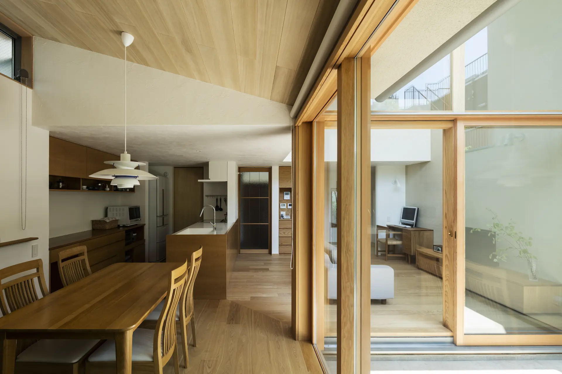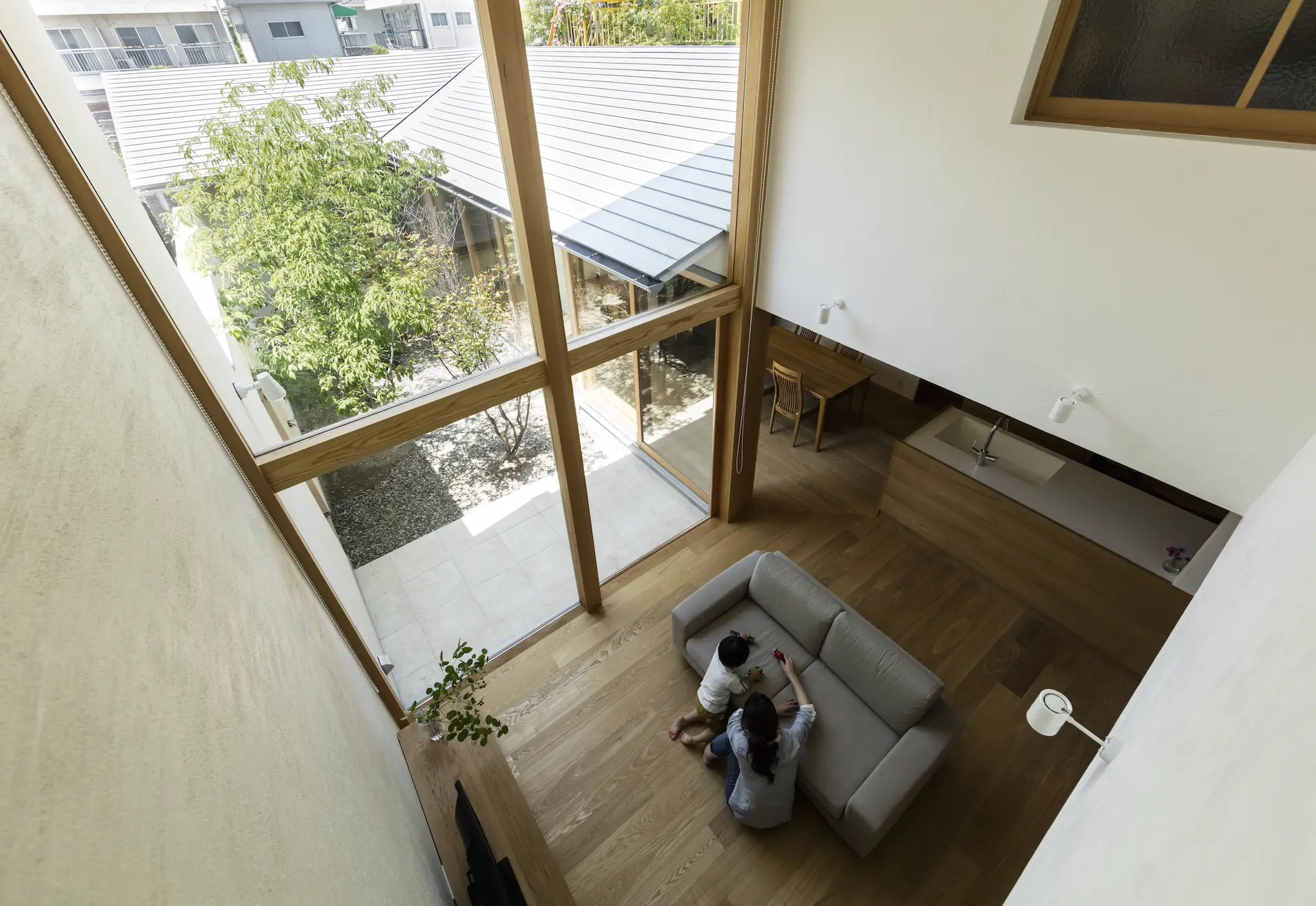 キッチンで夕食の準備をする音が吹抜けに面した子供室に心地よく響く、