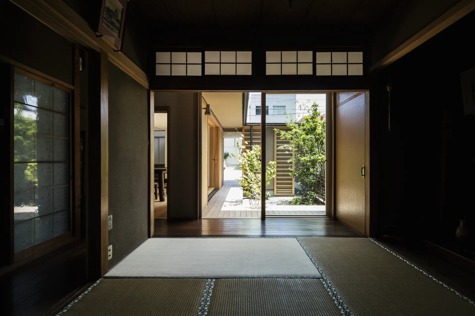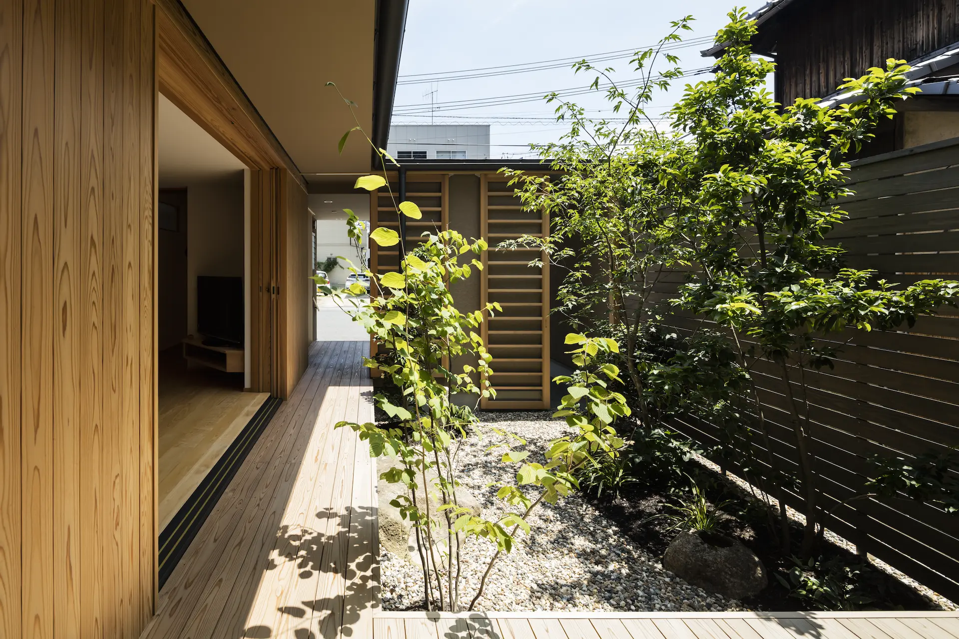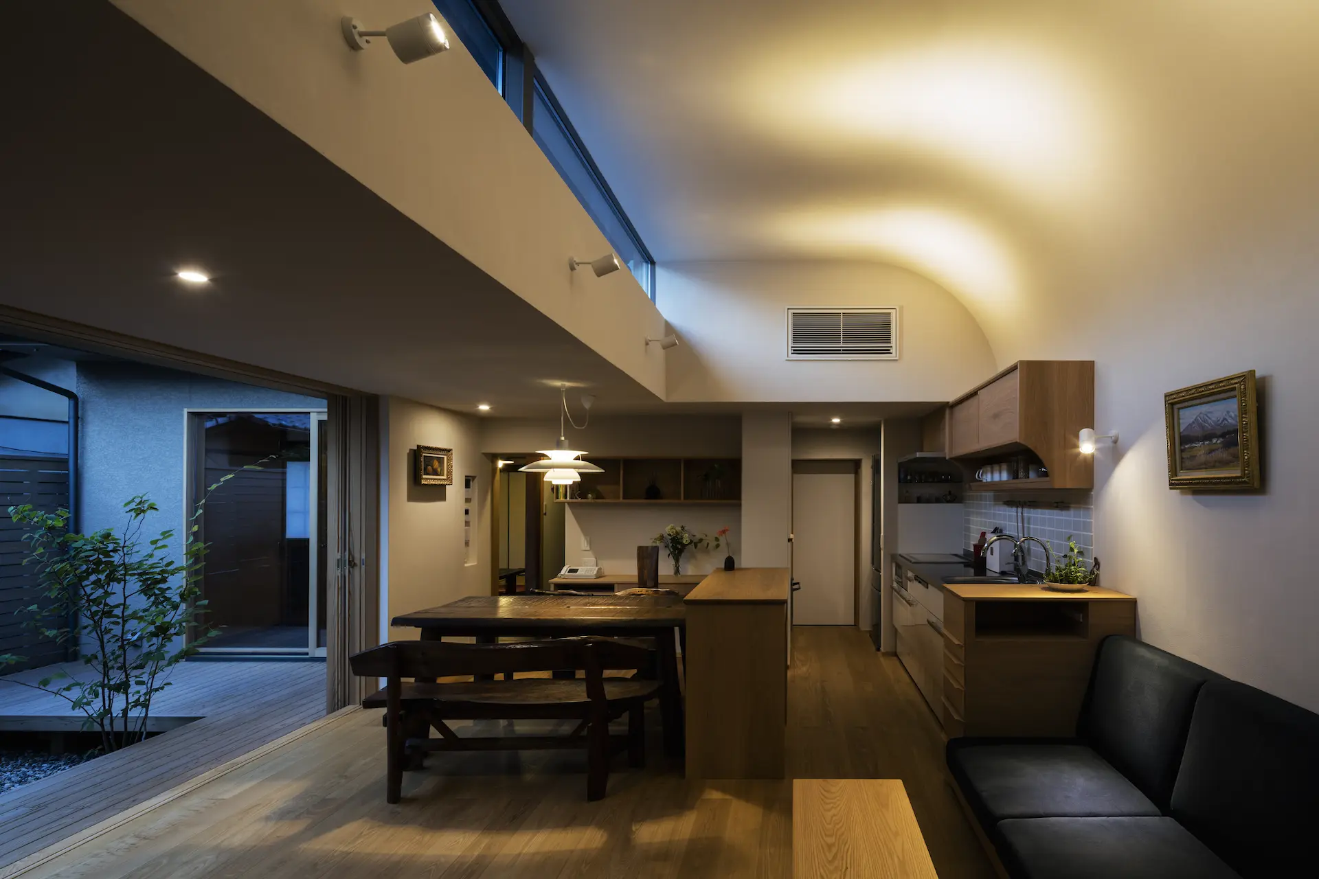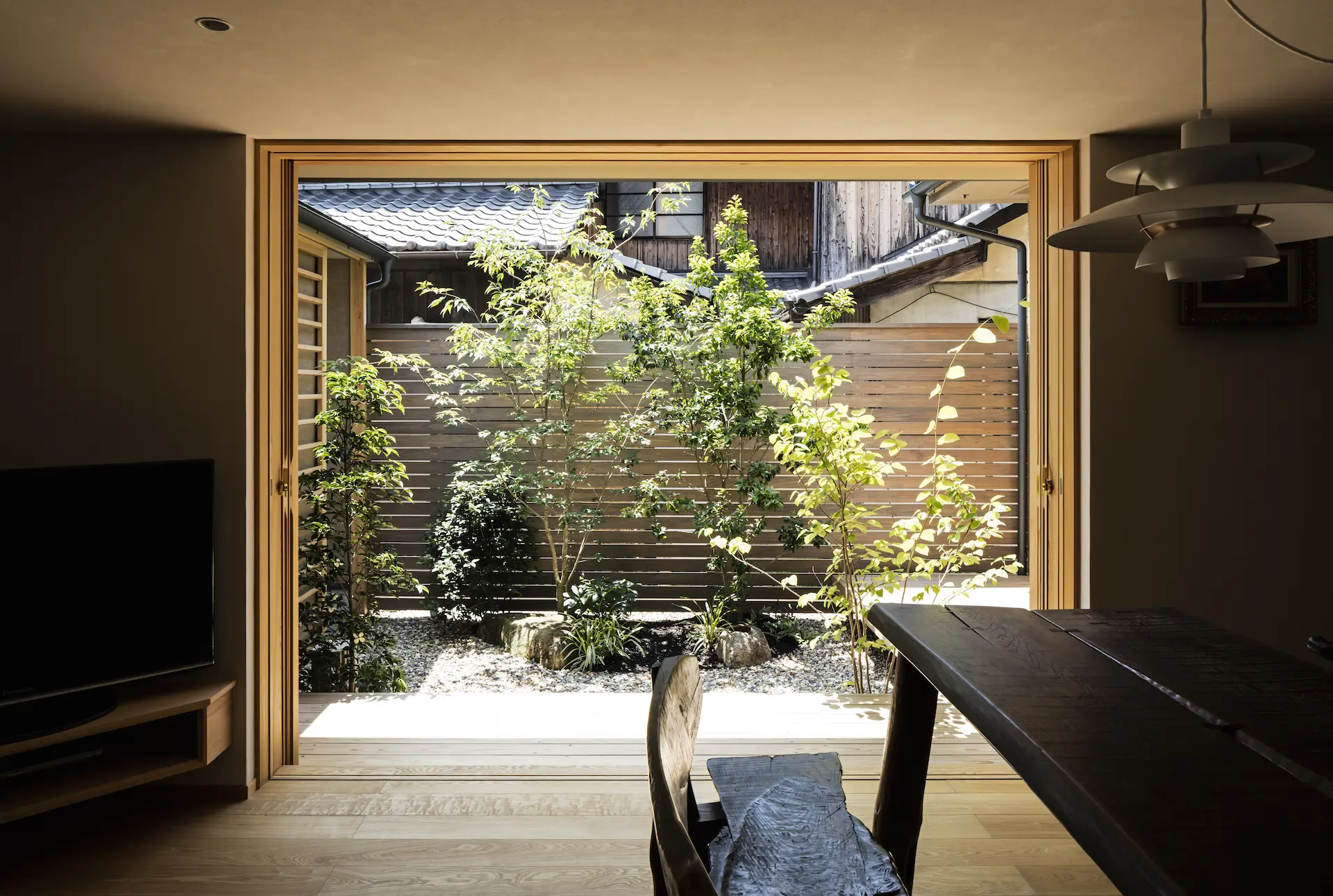 低く構えた下屋根の軒下に設けた開口は、中庭の木々や草花が季節に移ろう景色を映します。