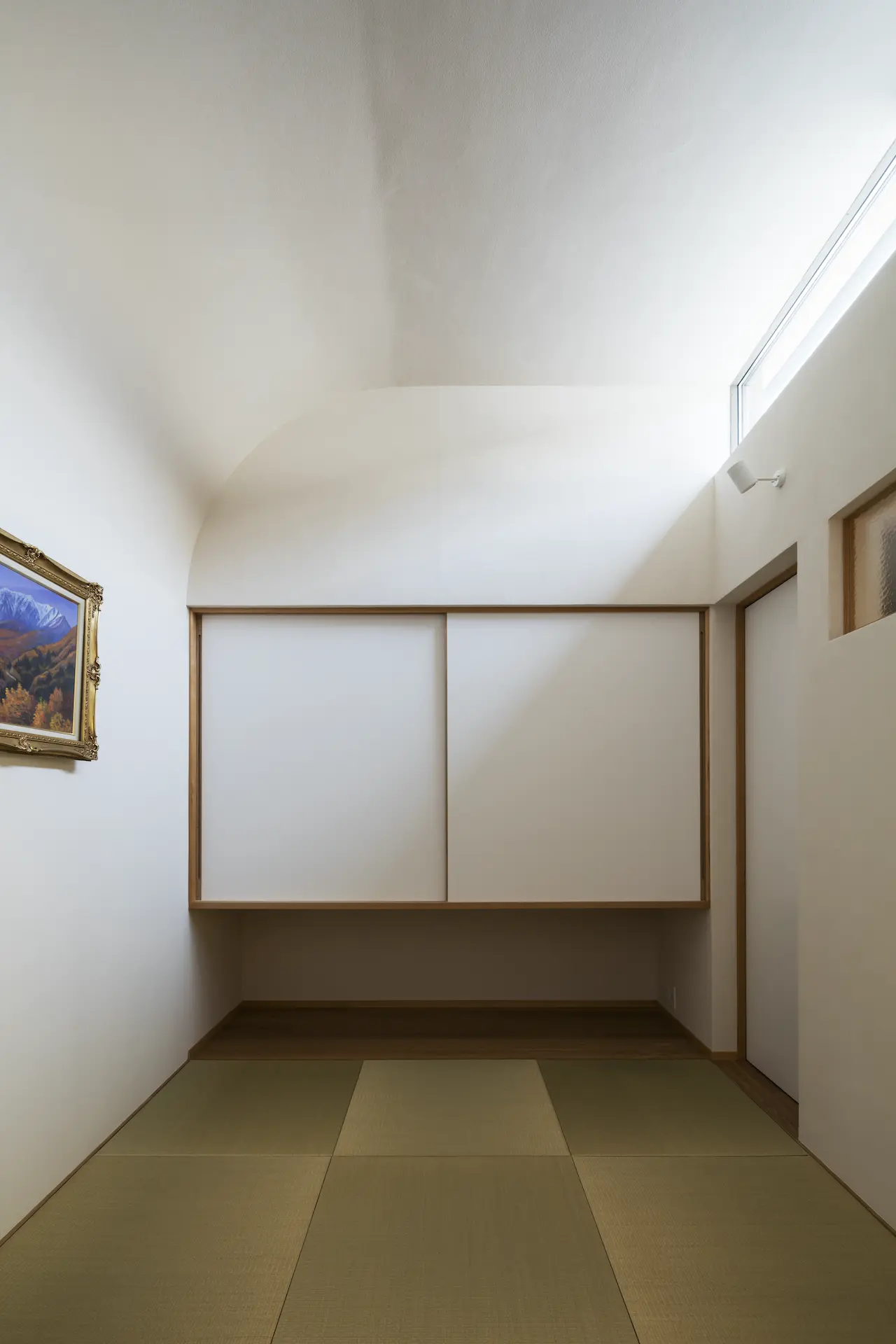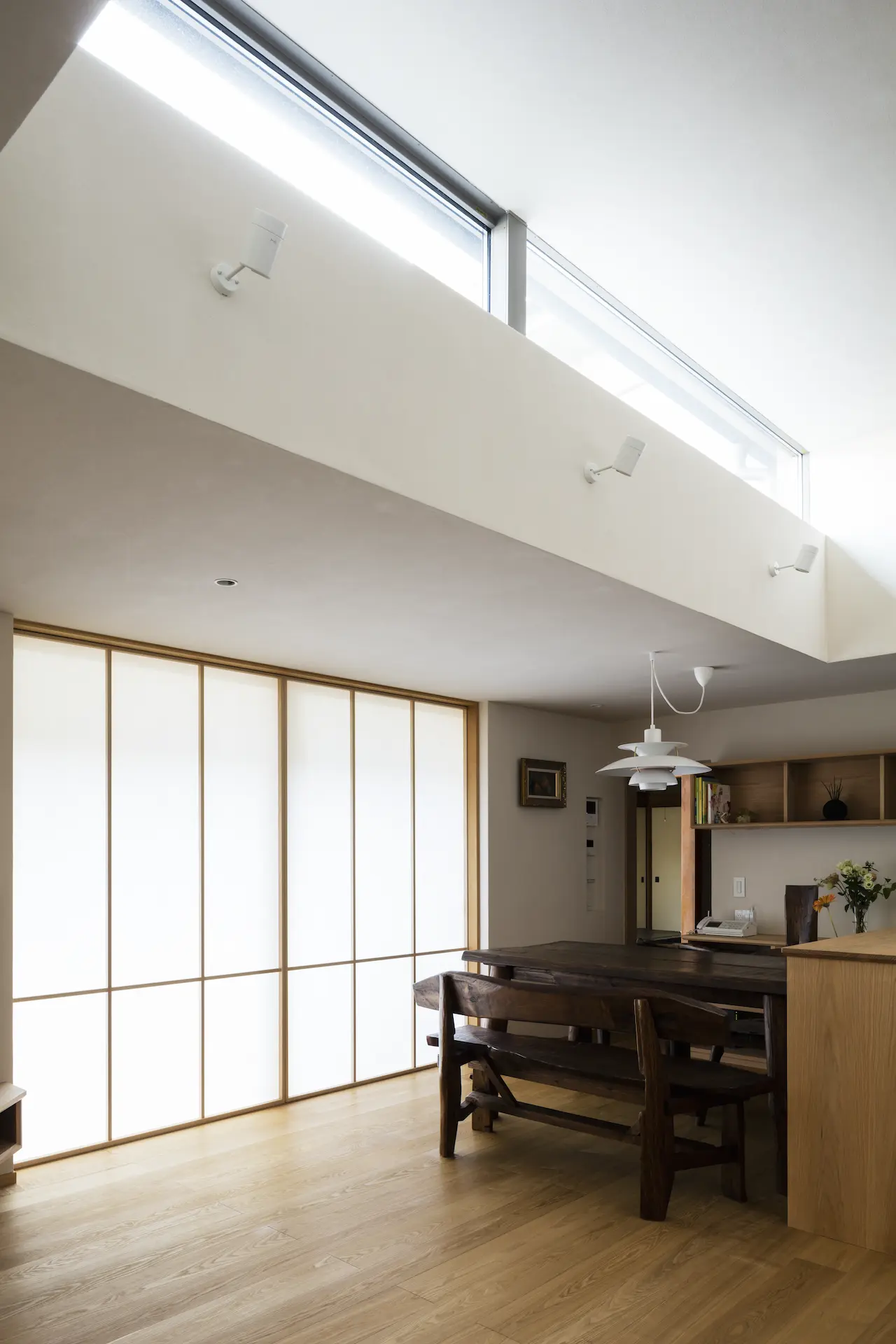 二段に重ねた水平屋根の間‥高窓から導かれた光は曲面に沿って柔らかく拡がってゆき、