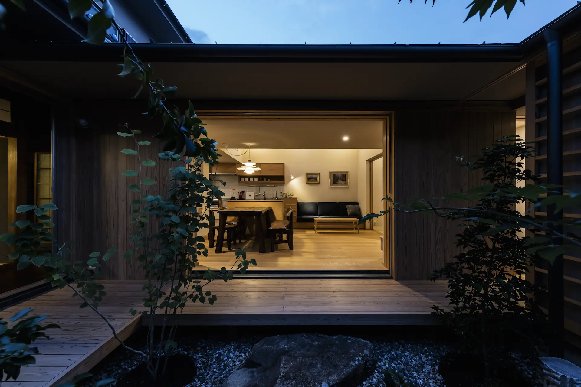 既存母屋にL型の「離れ」を増築することで、小さな中庭をもつ穏やかな住まいが生まれました。
