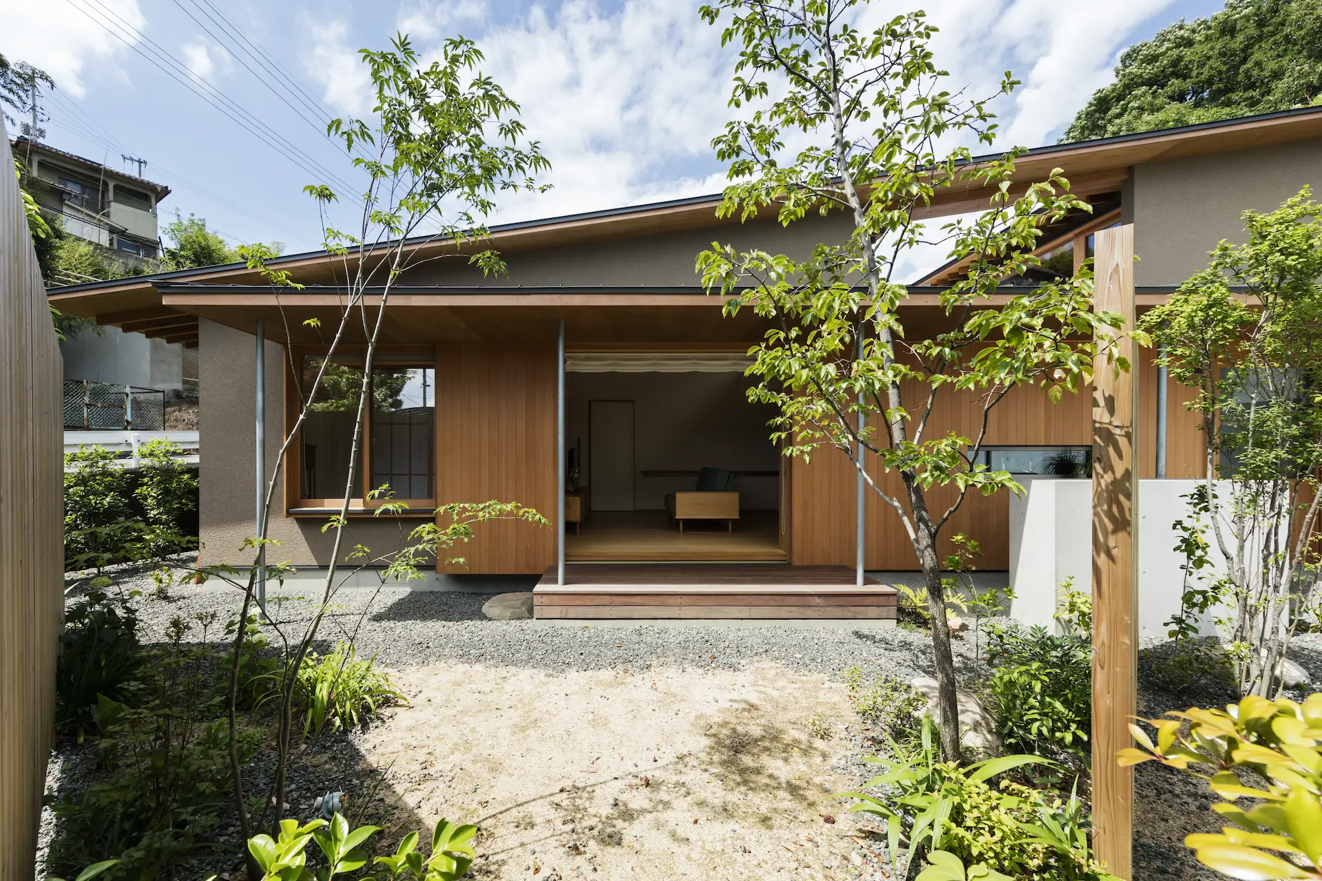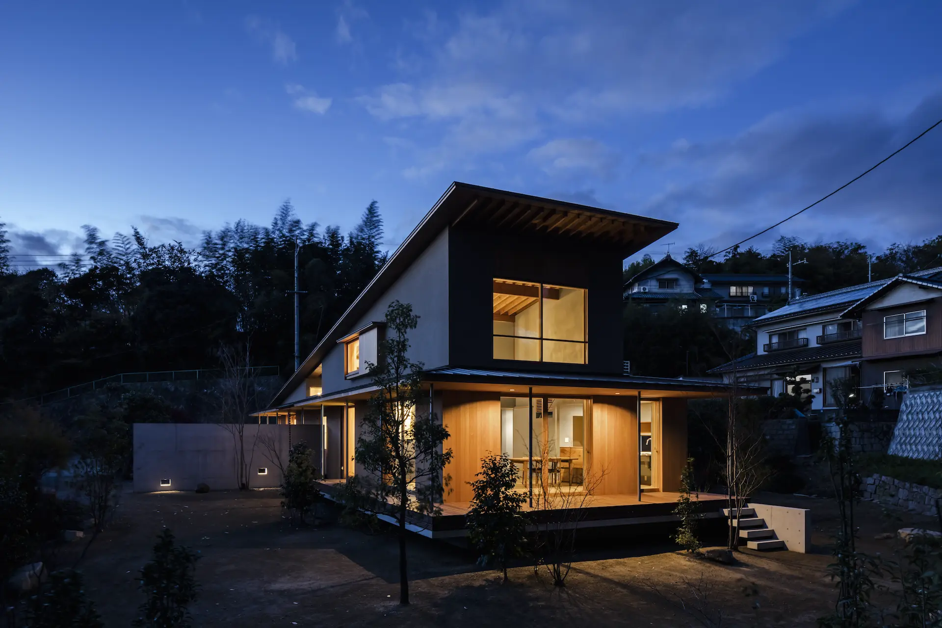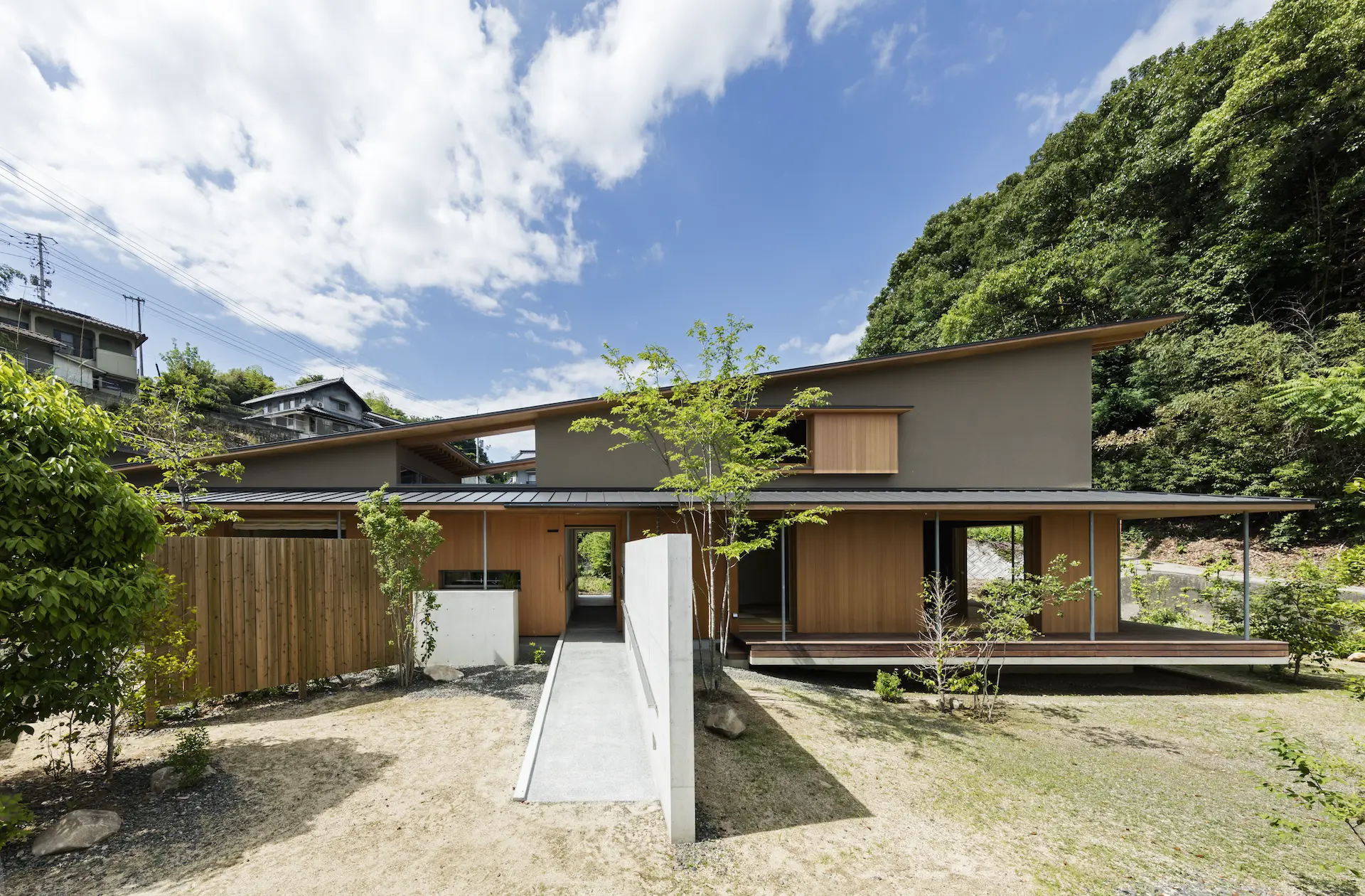 広島県福山市東部の緑が多く残る敷地に建つ二世帯住宅である。