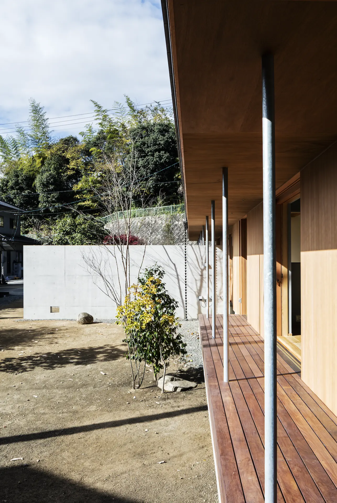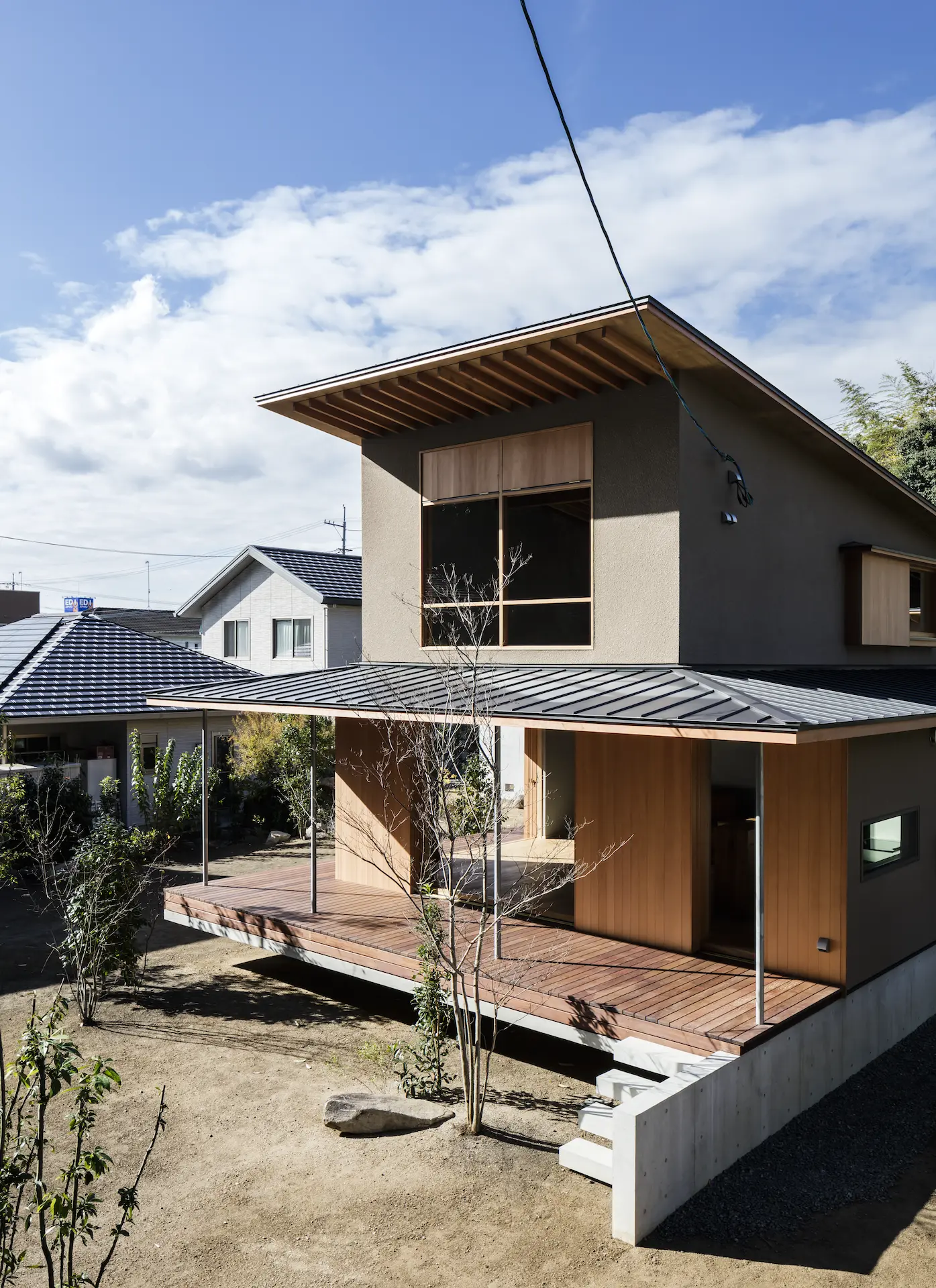 二世帯をつなぐ大きな片流れ屋根と縁側を持つ水平な下屋根。