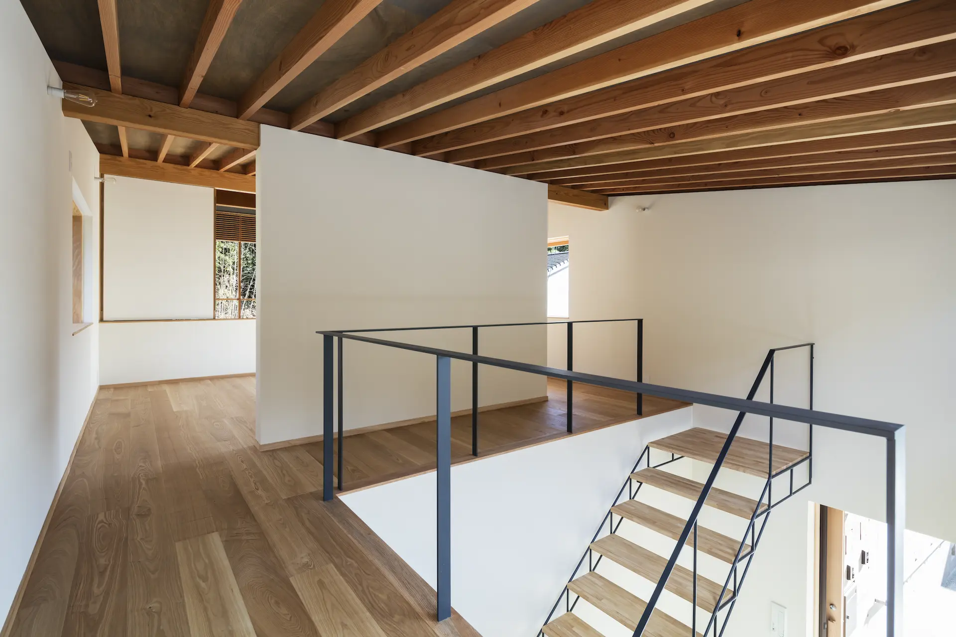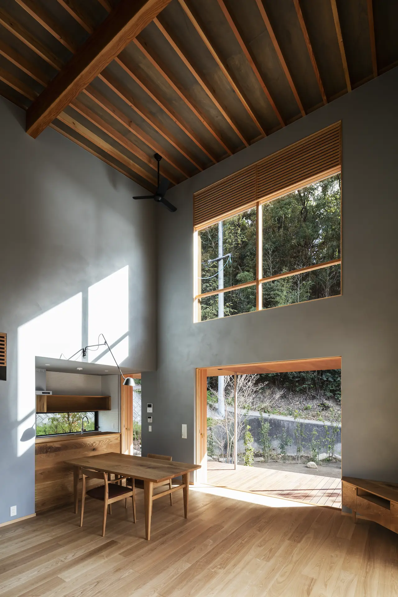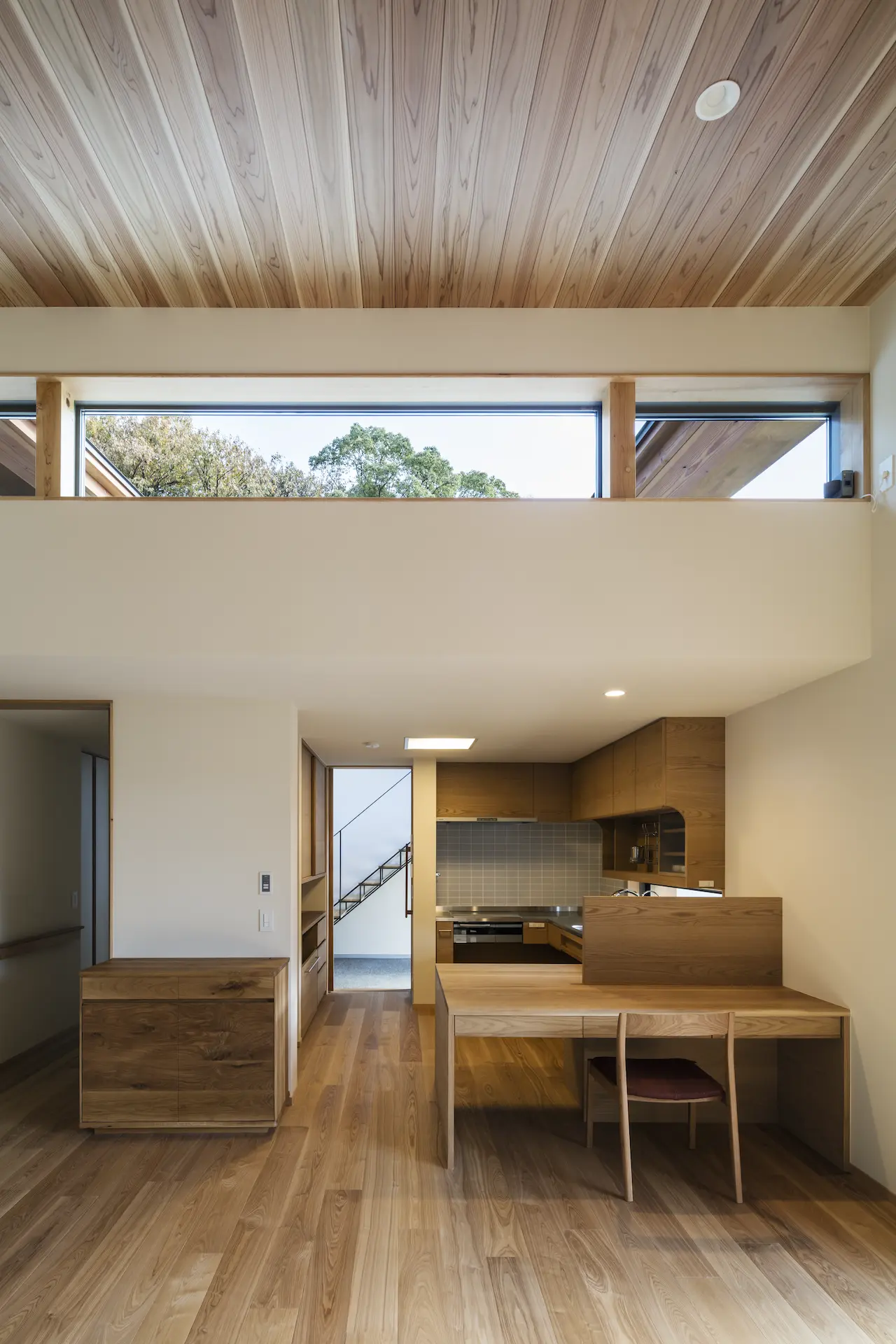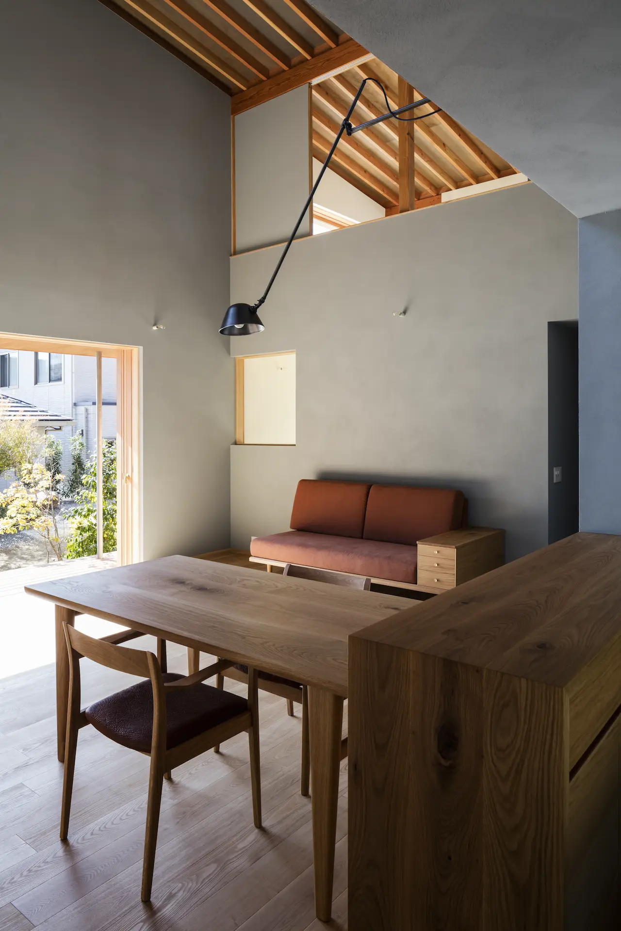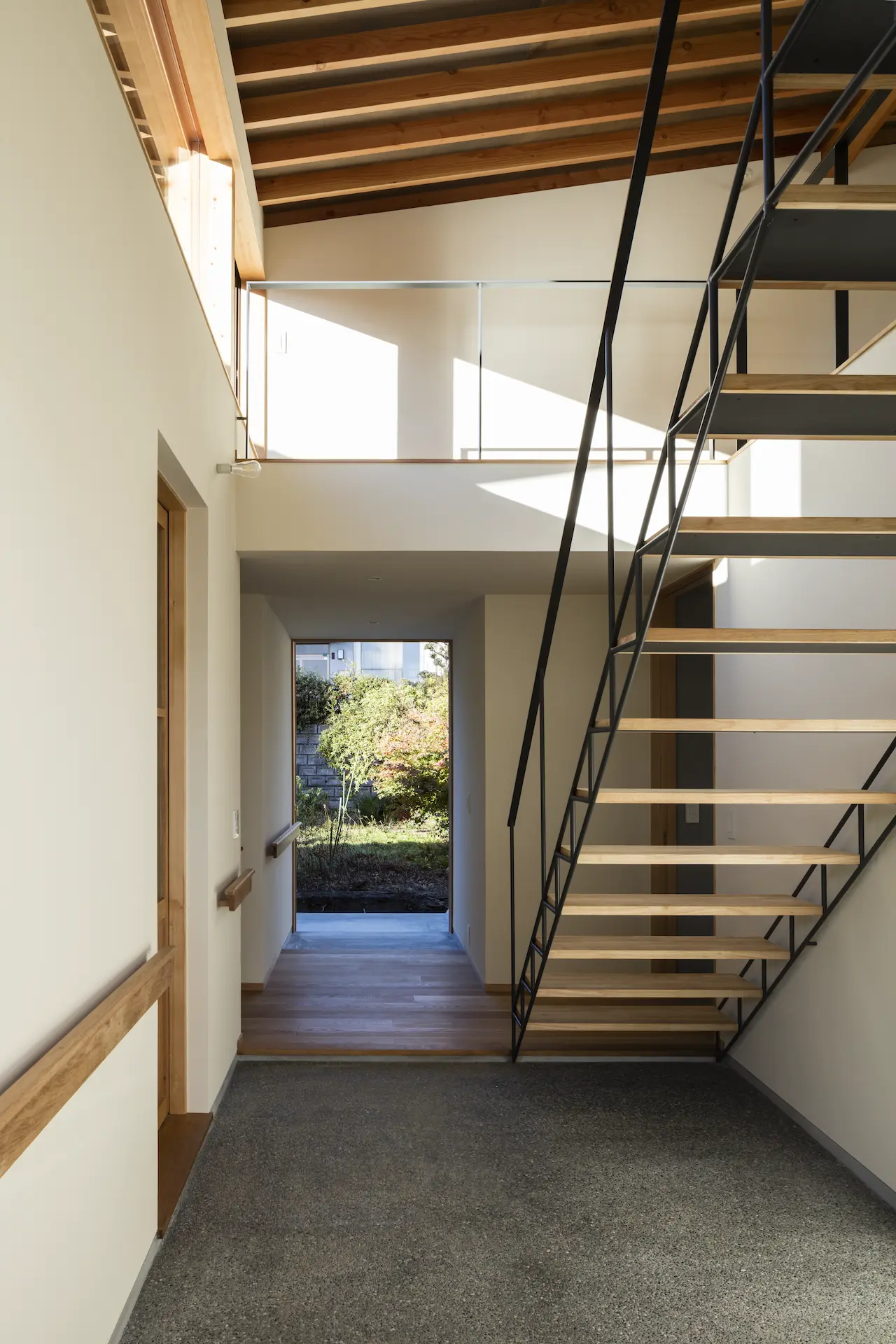 二枚の屋根は、風の流れ・光の流れ・視線の流れをつくり、外部環境とのつながりを生み出している。
