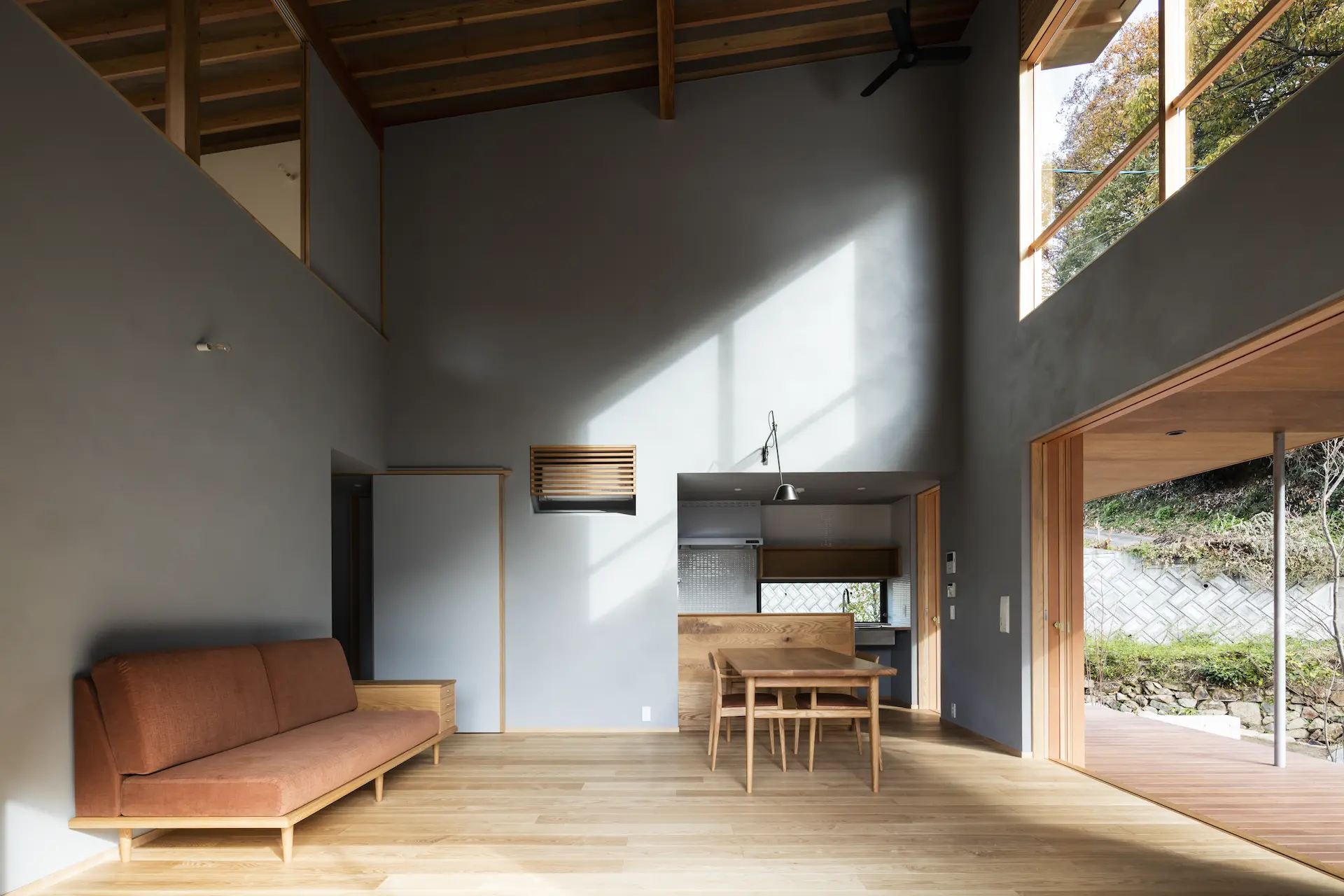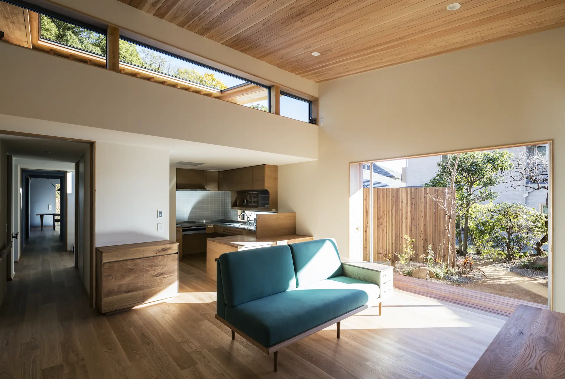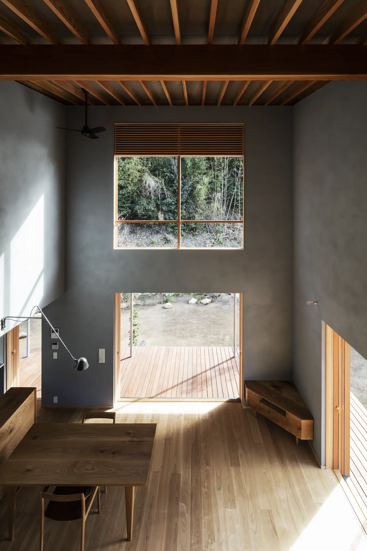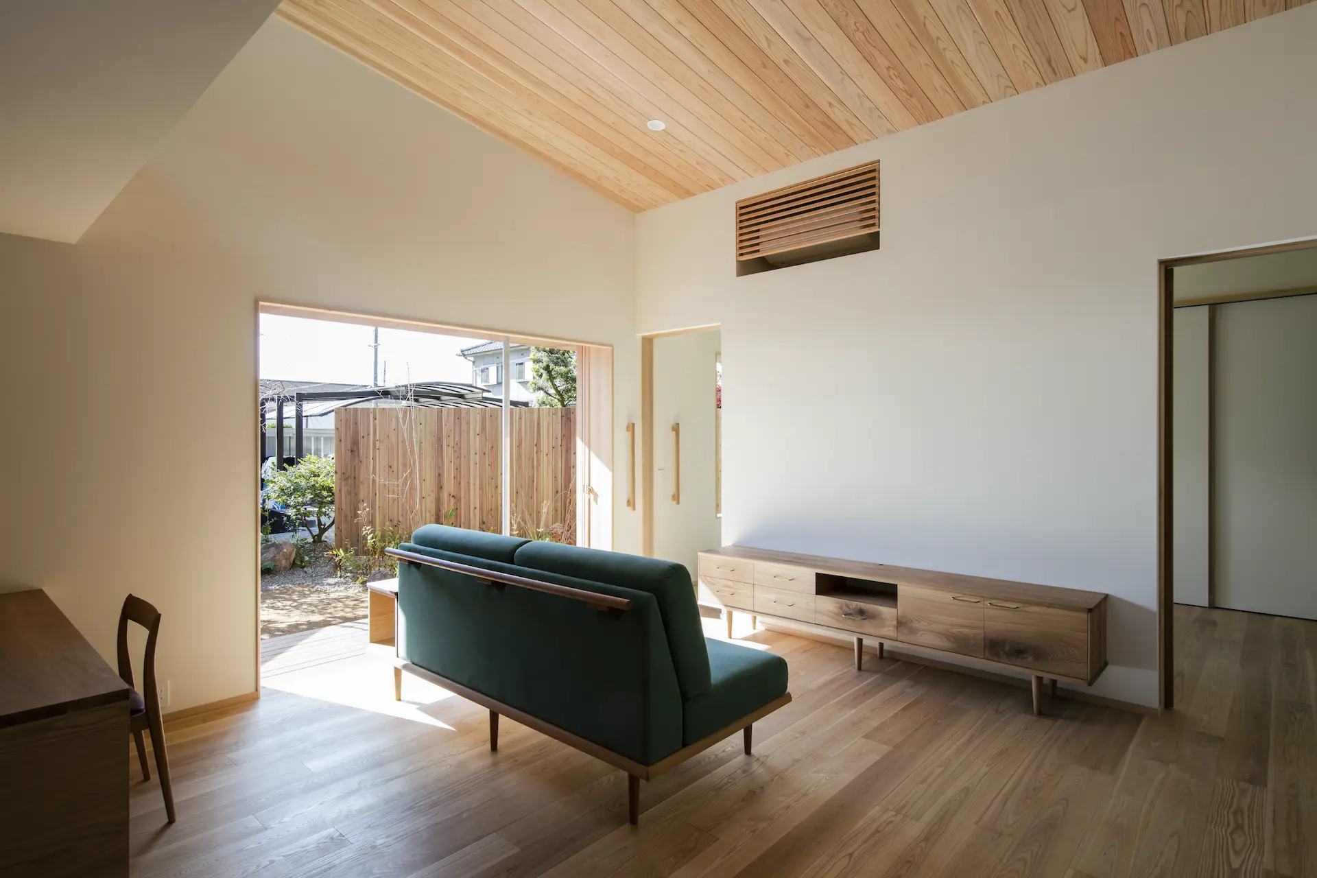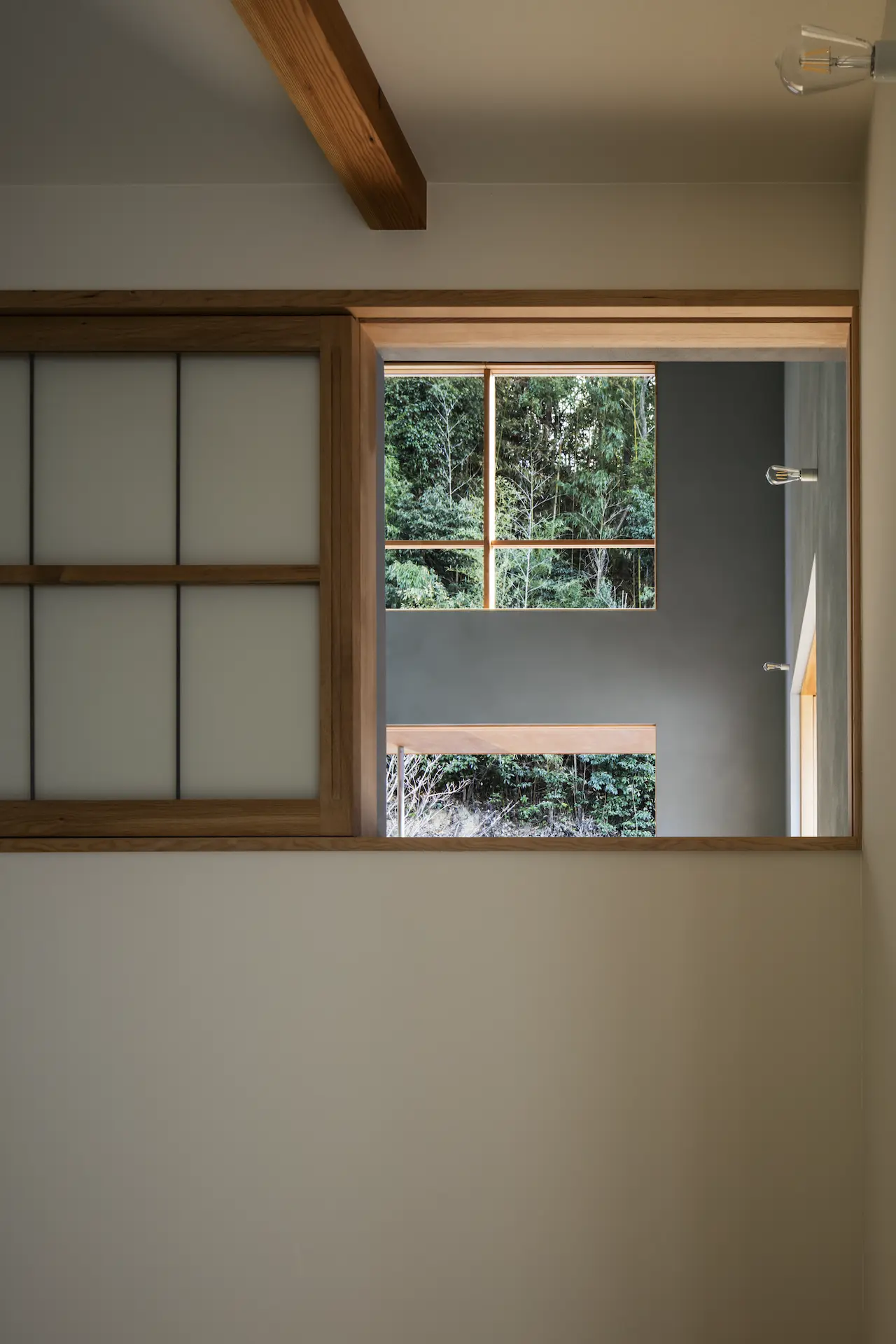 建物中央に設けた「風の間」は室内に風や光・自然の香りを導き、二つの住まいをつなげる役割も果たしている。